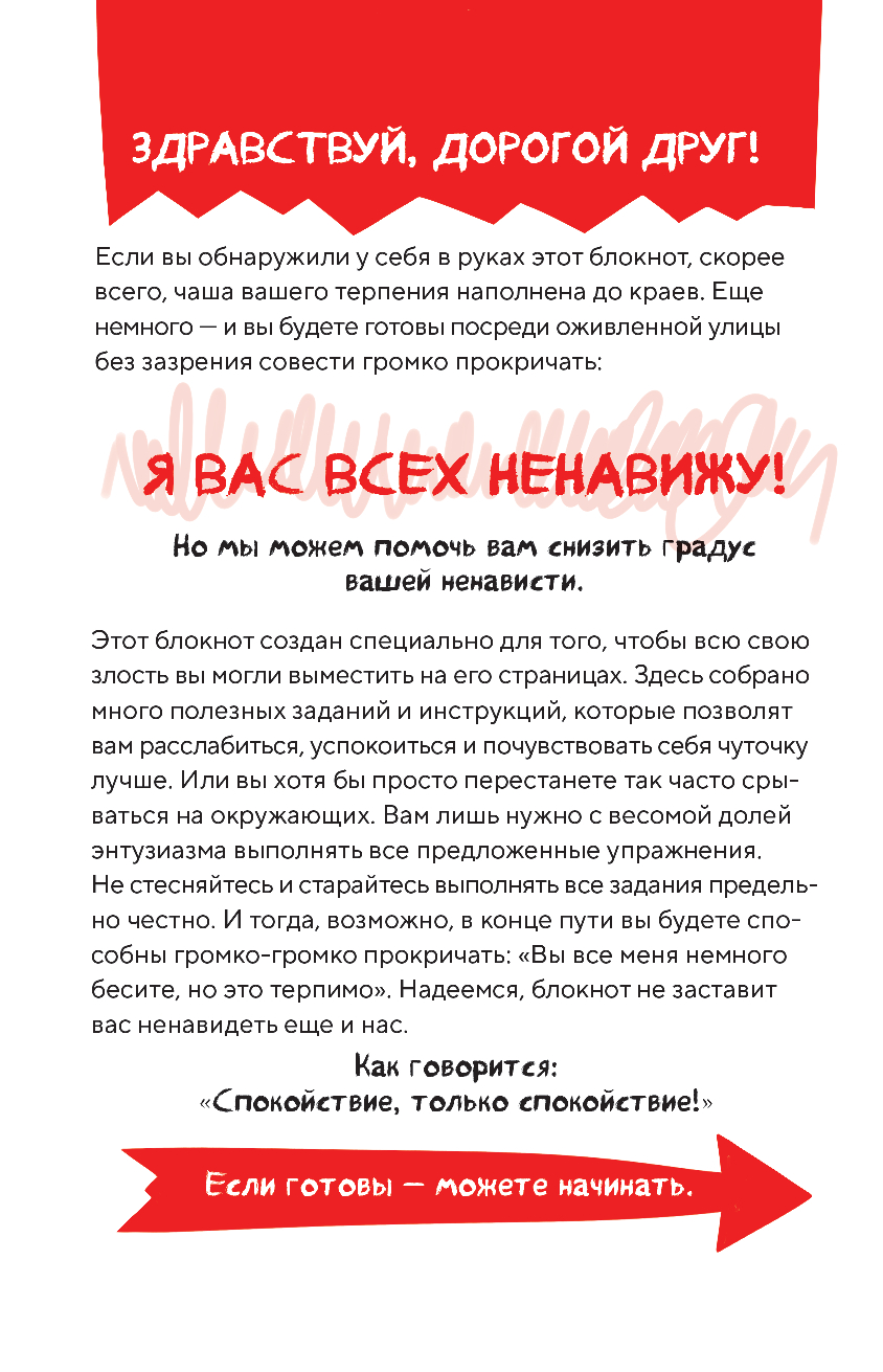 Ещё немного, и вы будете способны посреди оживленной улицы громко прокричать "Я вас всех ненавижу"? Тогда этот блокнот просто создан для вас. Он гарантированно сможет помочь вам снизить градус вашей ненависти. Блокнот удобного формата и креативного яркого дизайна наполнен разнообразными творческими упражнениями и заданиями для снятия стресса. Вы точно получите море позитивных эмоций от его заполнения.