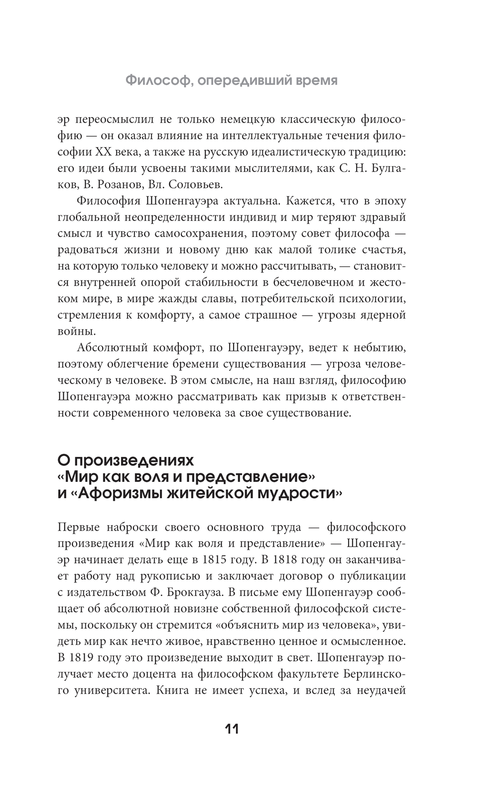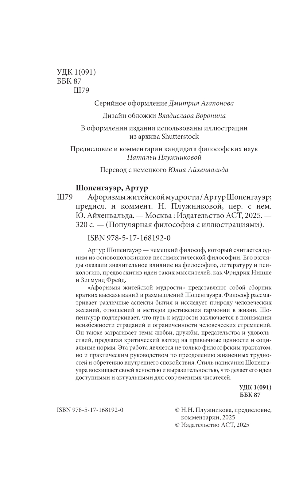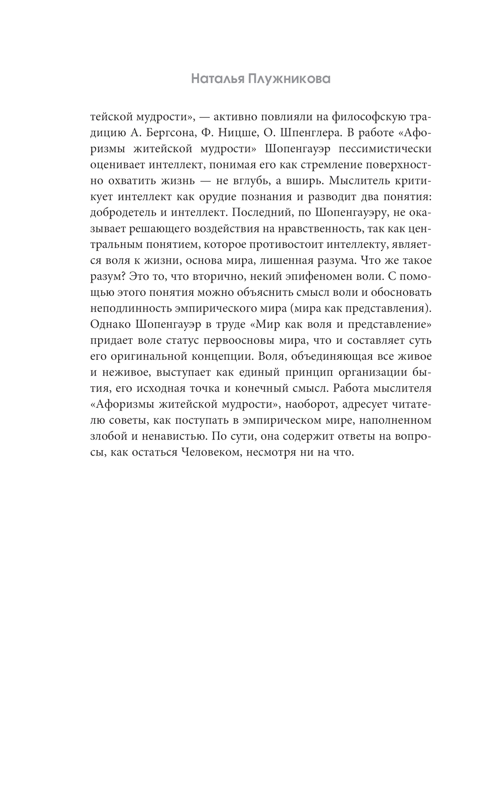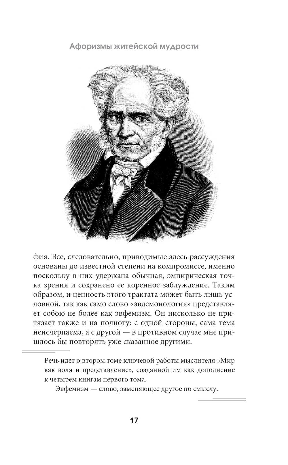 "Афоризмы житейской мудрости" представляют собой сборник кратких высказываний и размышлений Шопенгауэра. Философ рассматривает различные аспекты бытия и исследует природу человеческих желаний, отношений и методов достижения гармонии в жизни. Шопенгауэр подчеркивает, что путь к мудрости заключается в понимании неизбежности страданий и ограниченности человеческих стремлений. Он также затрагивает темы любви, дружбы, предательства и удовольствий, предлагая критический взгляд на привычные ценности и социальные нормы. Эта работа является не только философским трактатом, но и практическим руководством по преодолению жизненных трудностей и обретению внутреннего спокойствия. Стиль написания Шопенгауэра восхищает своей ясностью и выразительностью, что делает его идеи доступными и актуальными для современных читателей.