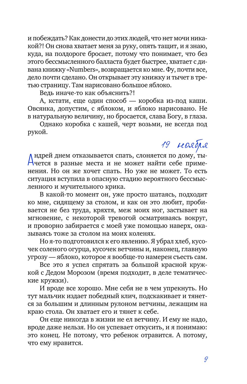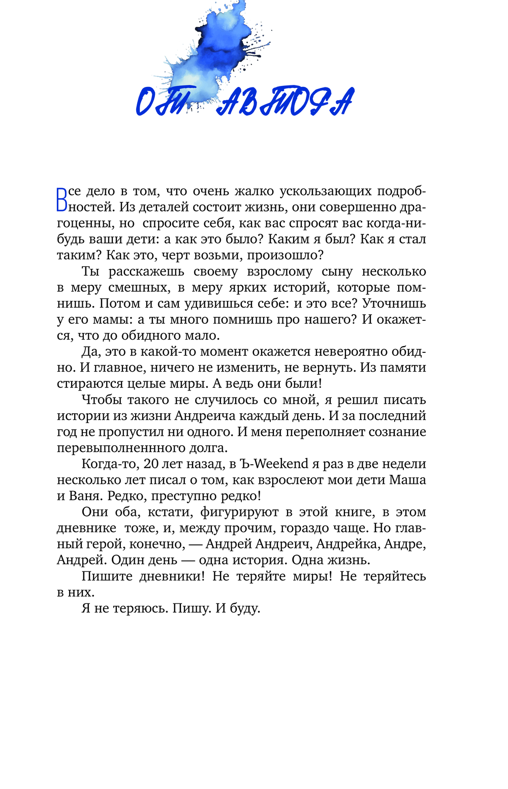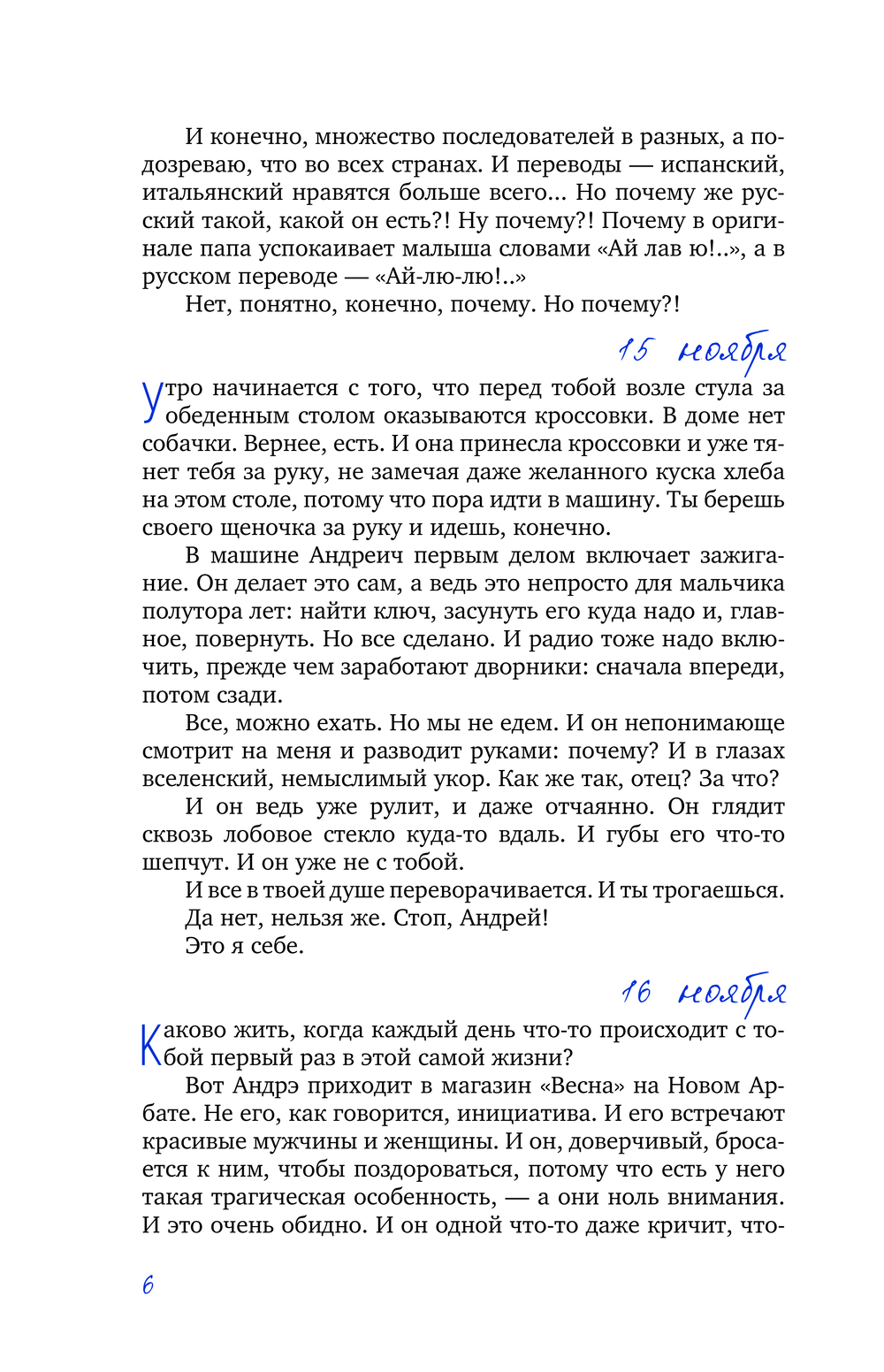 Каждый день в жизни Андрея Андреича – это цепь величайших событий. Первое надкушенное яблоко (без этих яблок он скоро не сможет даже заснуть), первая улитка, встреченная на дороге, где Андреич вечно застывает возле первого лежачего полицейского... Отец делится своими заботами, волнением, тревогой и нежностью, в ежедневном режиме описывая, как сын растет и меняется, и становится не слишком ли уж умным для своих лет...