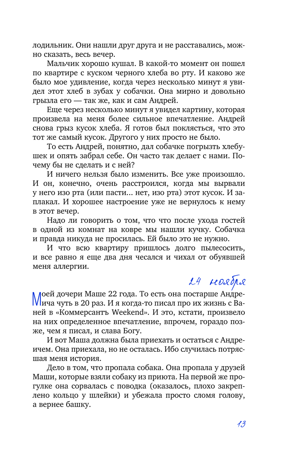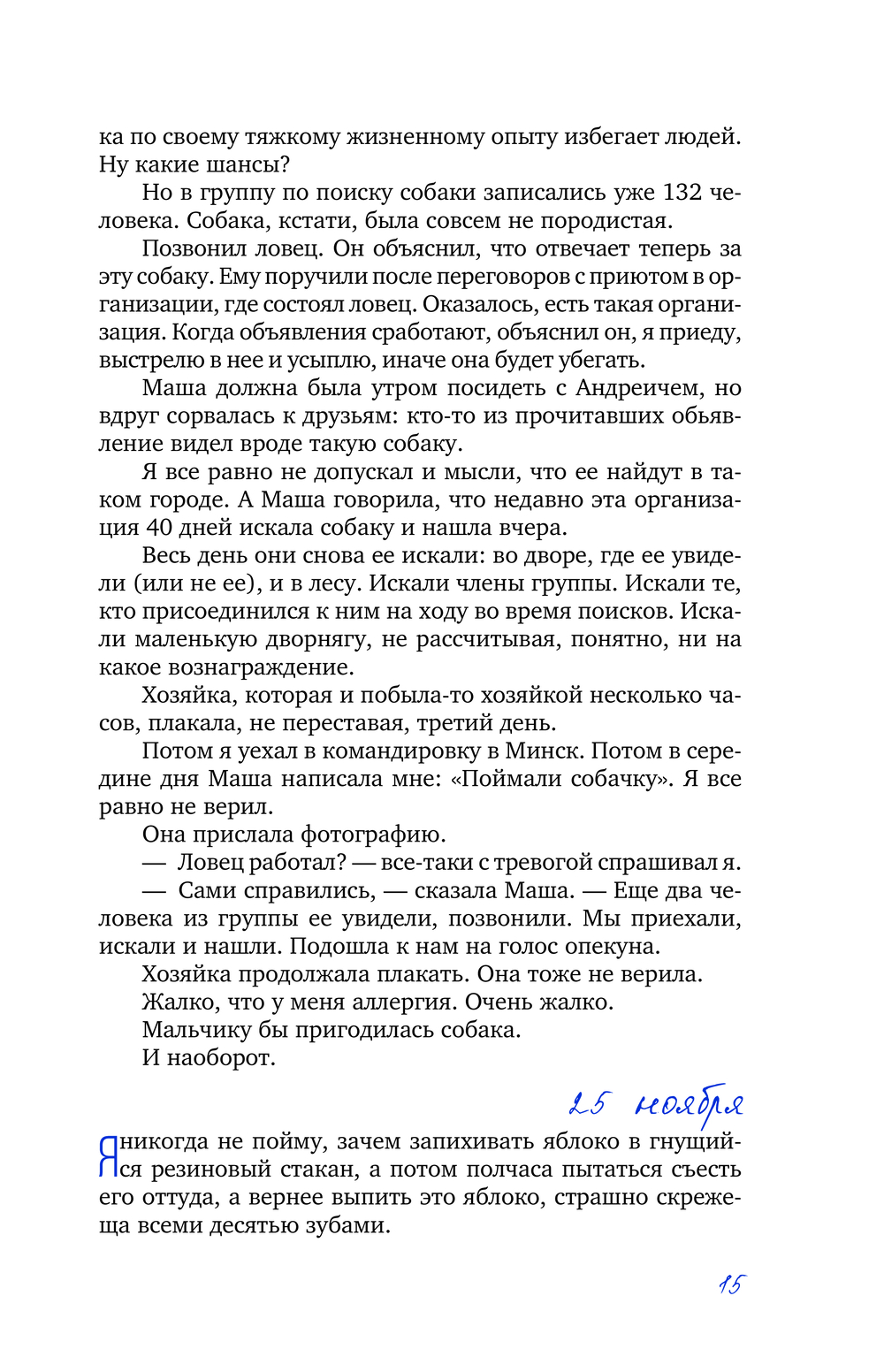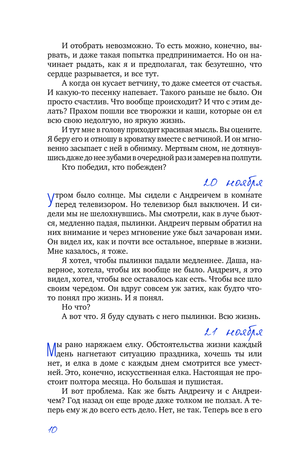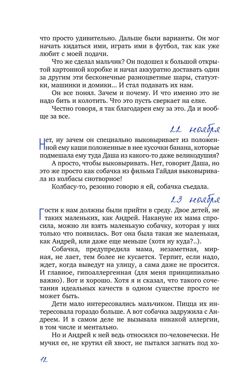 Каждый день в жизни Андрея Андреича – это цепь величайших событий. Первое надкушенное яблоко (без этих яблок он скоро не сможет даже заснуть), первая улитка, встреченная на дороге, где Андреич вечно застывает возле первого лежачего полицейского... Отец делится своими заботами, волнением, тревогой и нежностью, в ежедневном режиме описывая, как сын растет и меняется, и становится не слишком ли уж умным для своих лет...