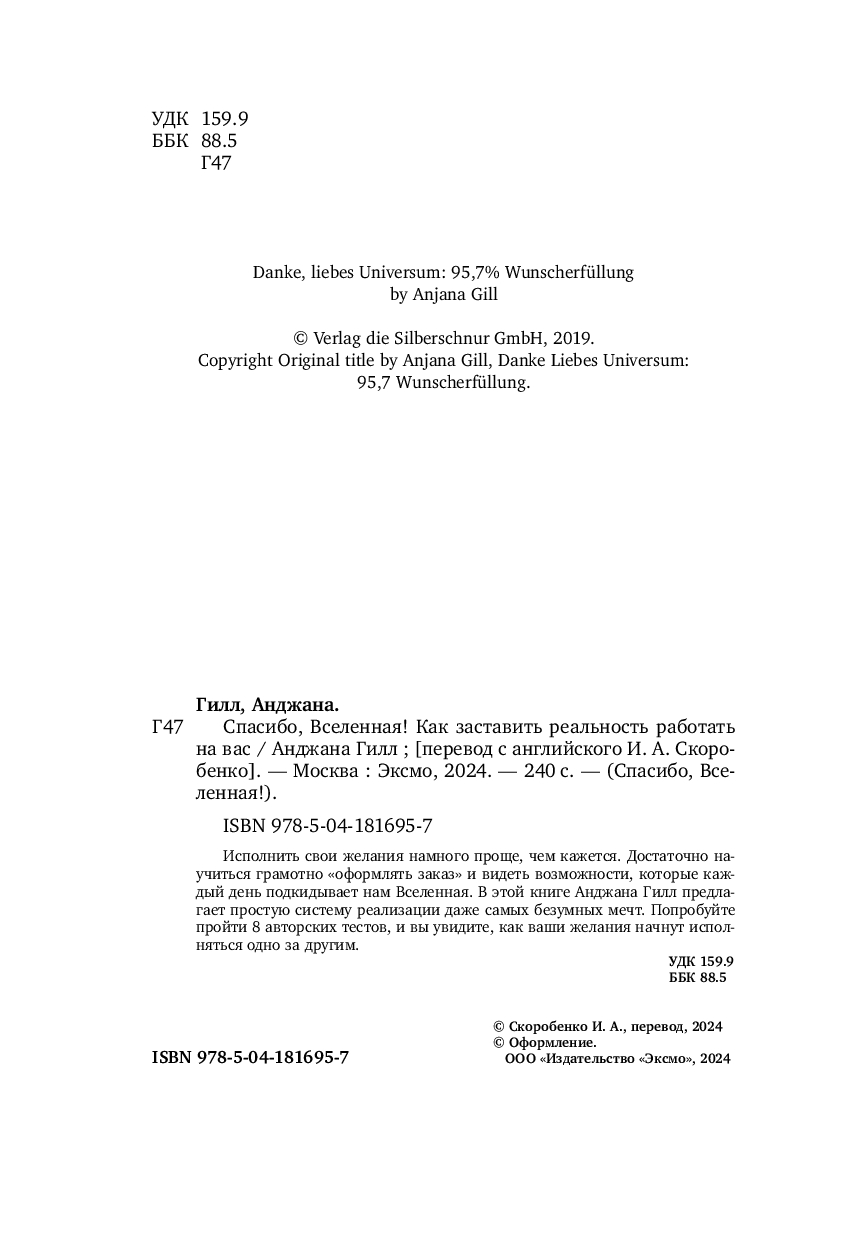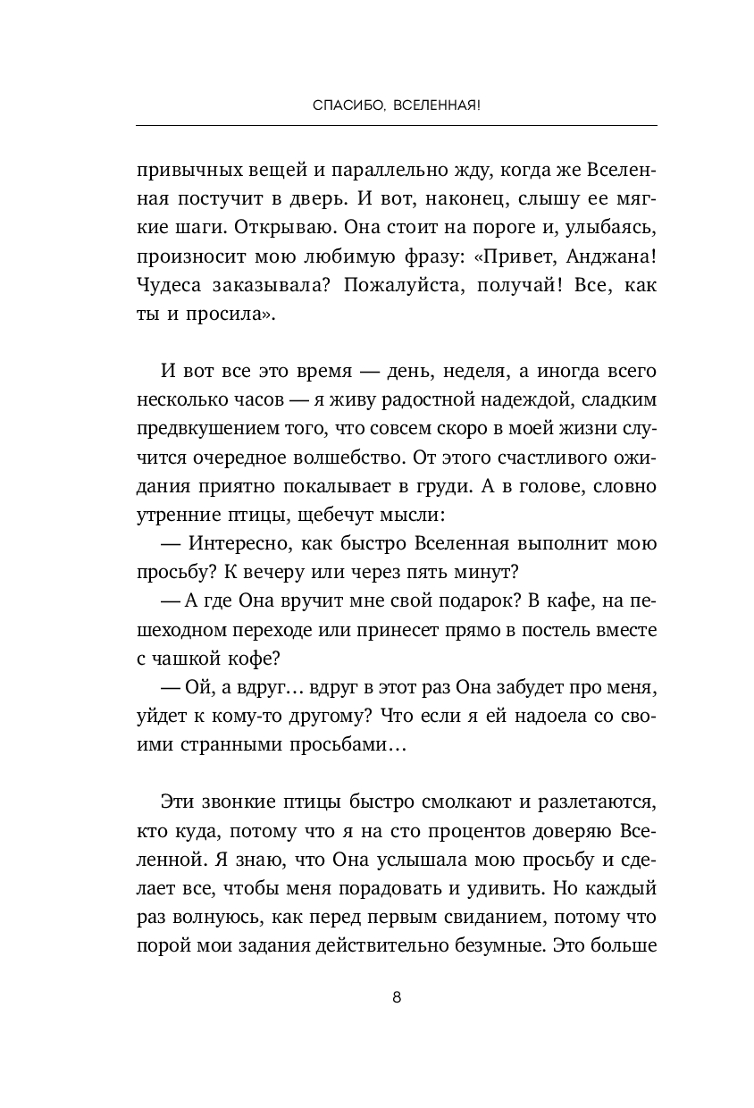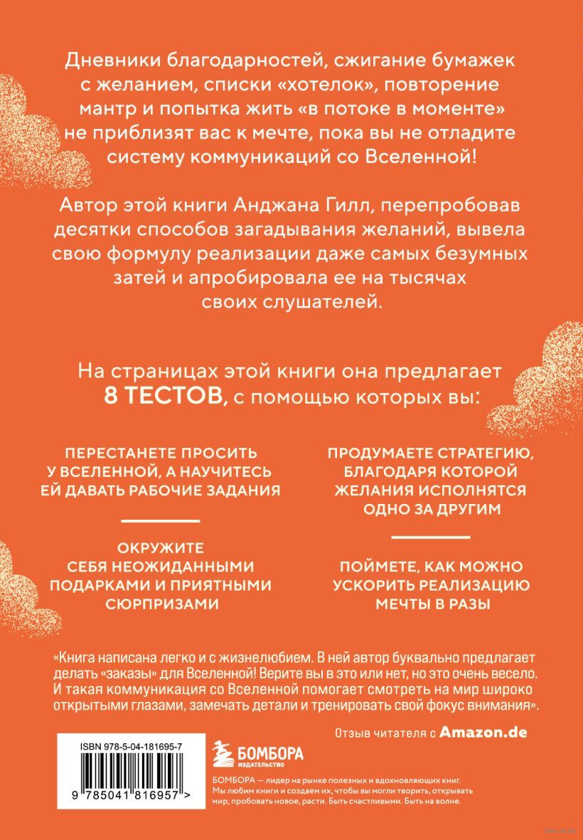 Дневники благодарностей, сжигание бумажек с желанием, списки "хотелок", повторение мантр и попытка жить "в потоке в моменте" – не приблизят вас к мечте пока вы не отладите "систему коммуникаций" со Вселенной! Так считает автор этой книги Анджана Гилл, которая, перепробовав десятки способов загадывания желаний, вывела свою формулу реализации даже самых безумных затей и апробировала ее на тысячах своих слушателей.