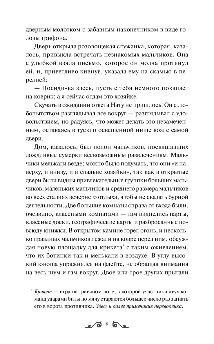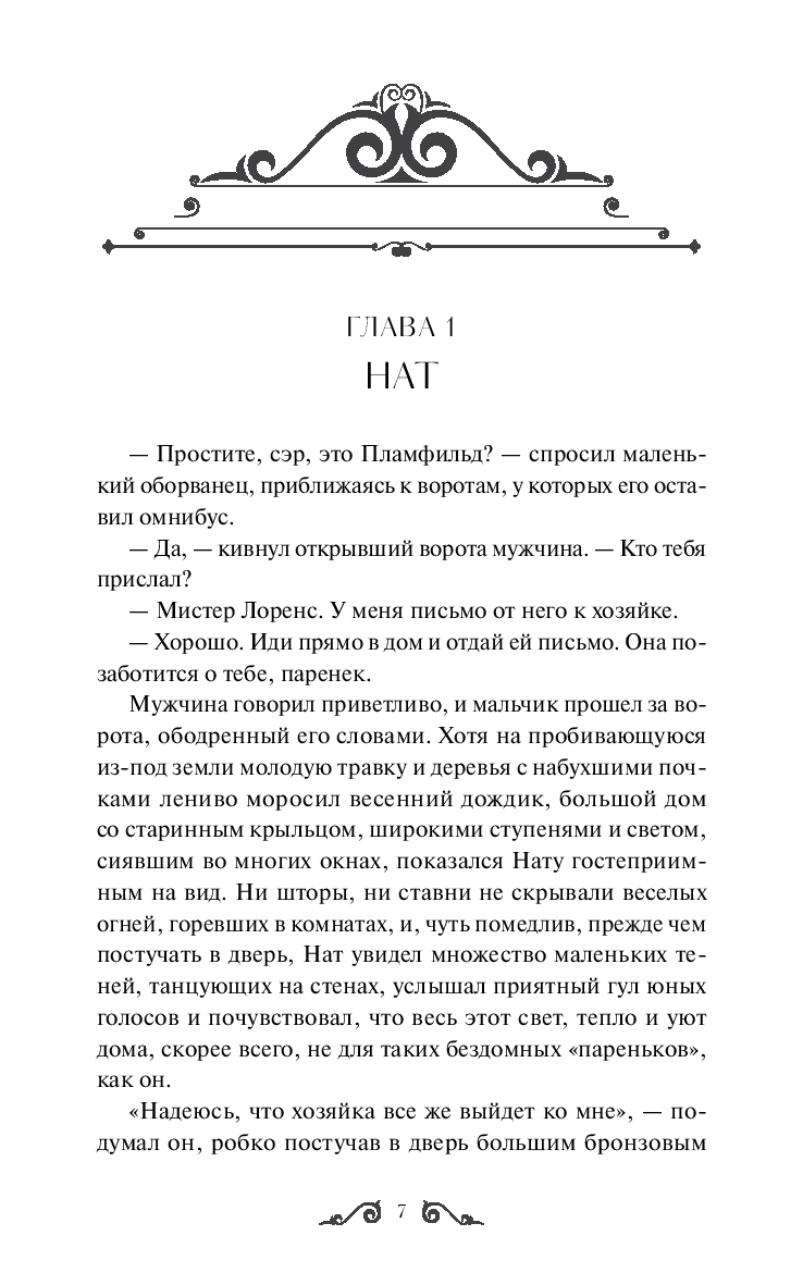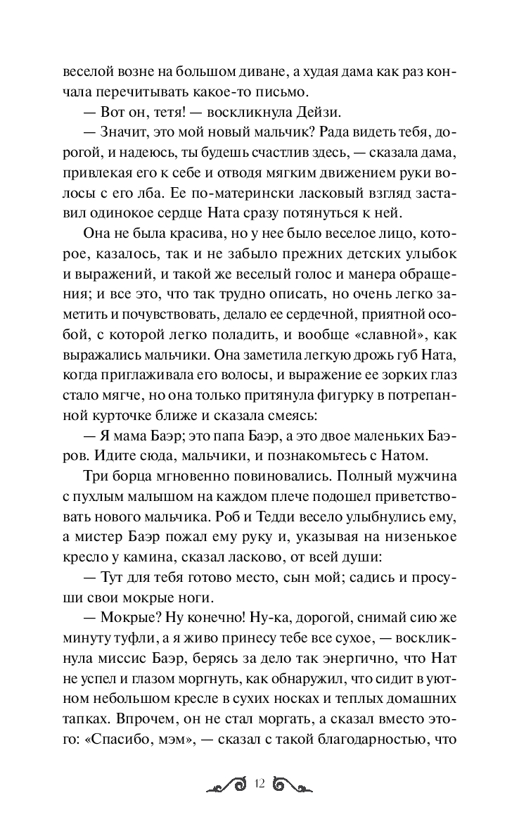 Третий роман американской писательницы Луизы Мэй Олкотт – о буднях и праздниках, маленьких победах и опасных приключениях воспитанников пансиона, который открыли Джо и Фриц Баэры. В пансионе ученики из разных социальных слоев учатся смелости, честности и доброте, а также занимаются самыми привычными для мальчишек вещами – веселятся, проказничают, находят друзей. Не так-то просто превратить непоседливых сорванцов в настоящих маленьких мужчин, однако нет на свете задачи, с которой Джо не смогла бы справиться.