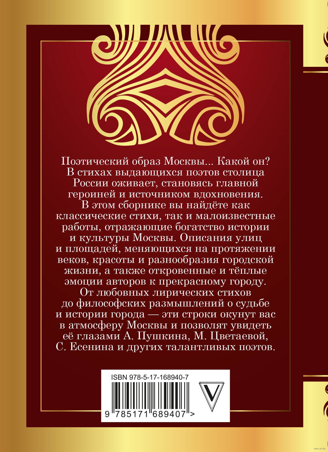 Поэтический образ Москвы... Какой он? В стихах выдающихся поэтов столица оживает, становясь главной героиней и источником вдохновения. В этом сборнике вы найдёте как классические стихи, так и малоизвестные работы, отражающие богатство истории и культуры Москвы. Описания улиц и площадей, меняющихся на протяжении веков, красоты и разнообразия городской жизни, а также откровенные и тёплые эмоции авторов к прекрасному городу. От лирических стихов до философских размышлений о судьбе и истории сердца России – эти строки окунут вас в атмосферу Москвы и позволят увидеть её глазами А. Пушкина, М. Цветаевой, С. Есенина и других талантливых поэтов.