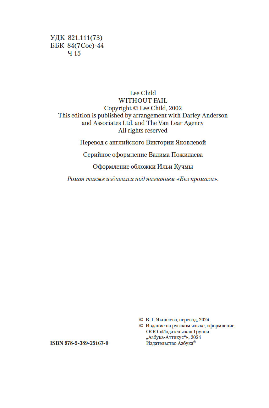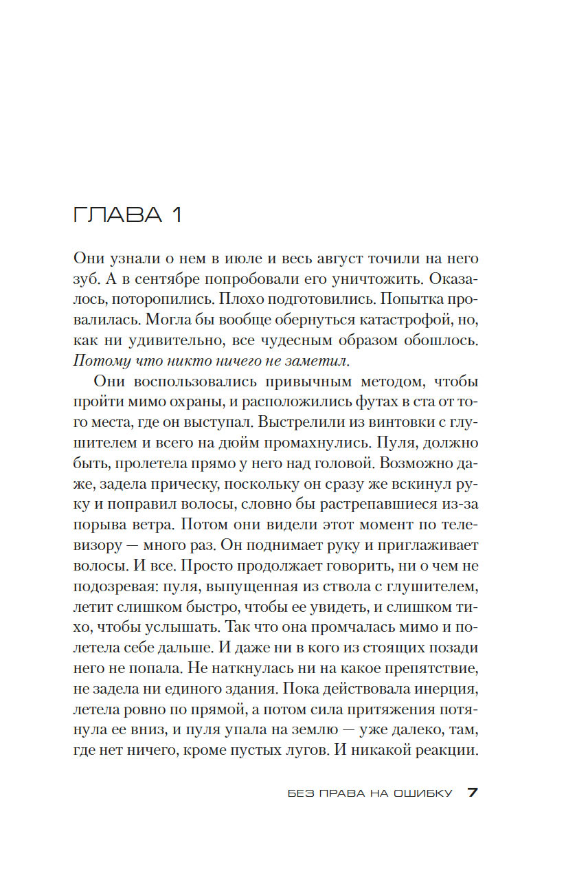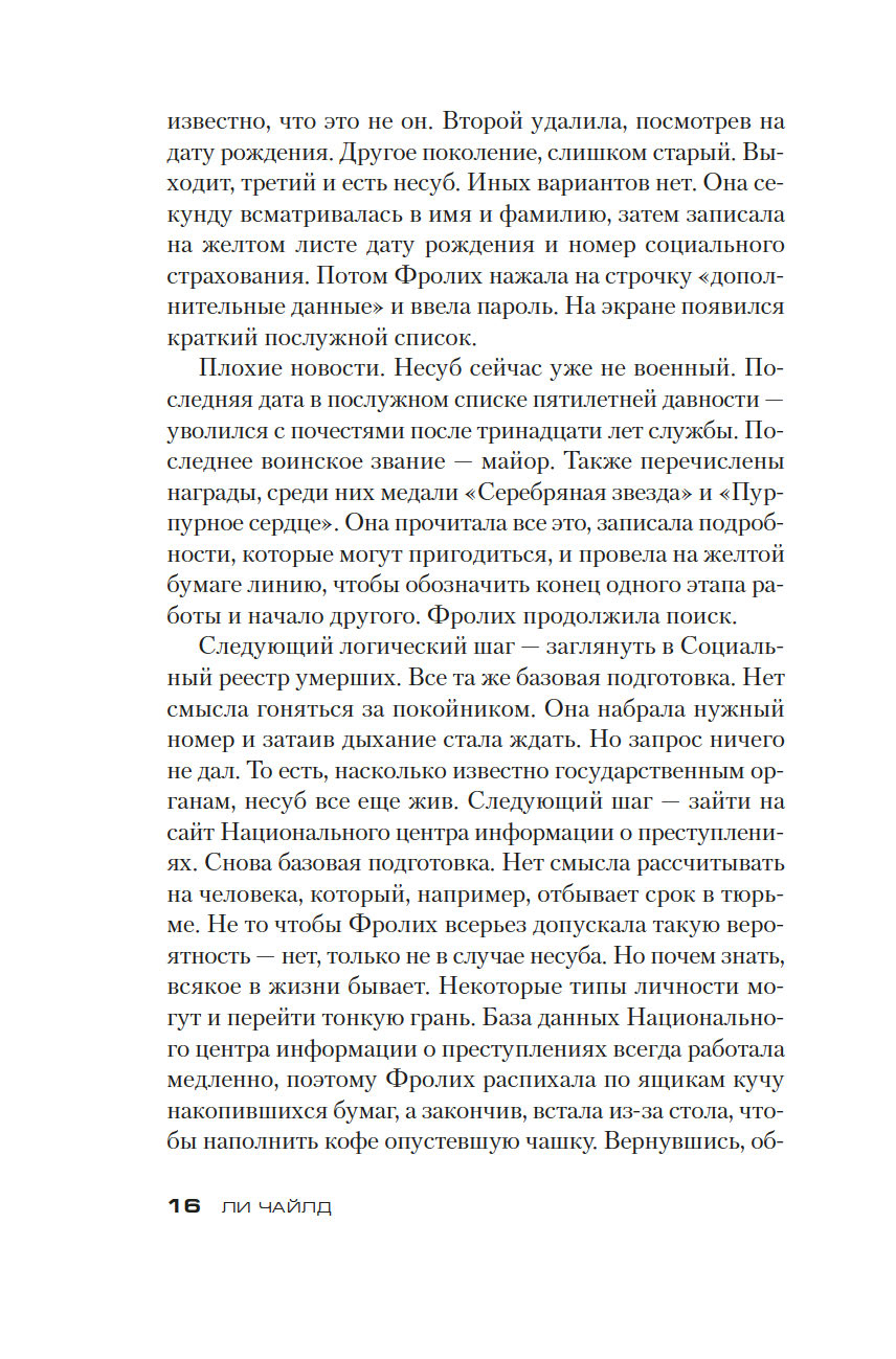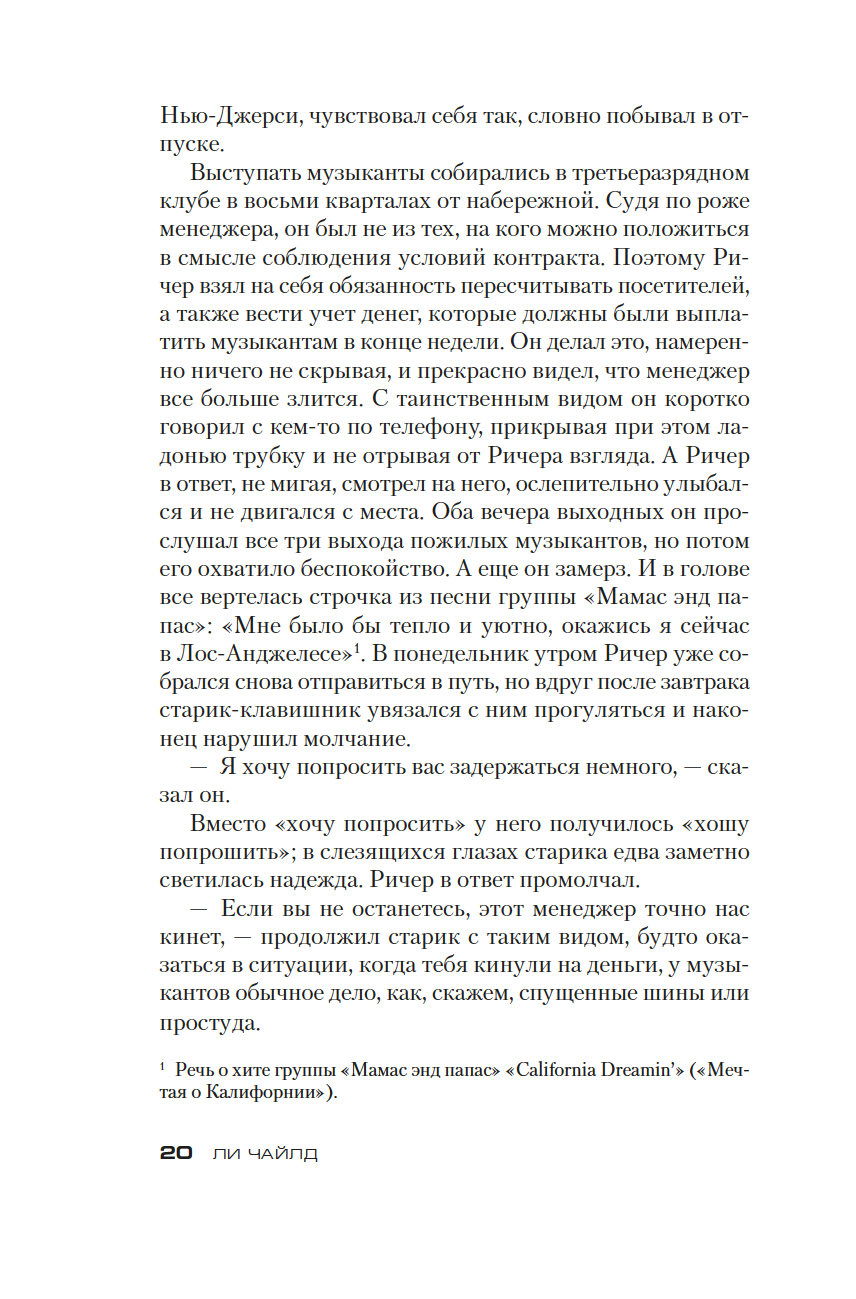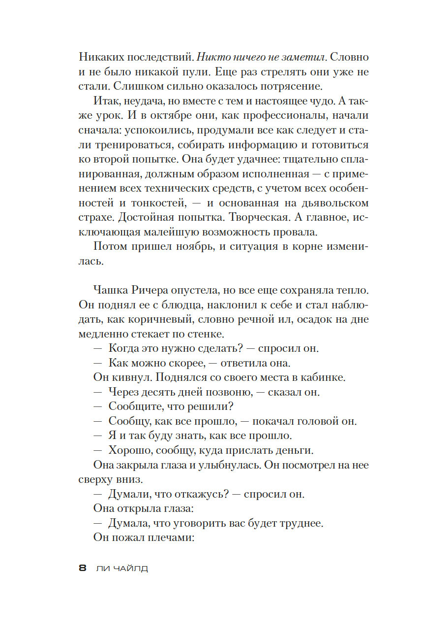 Джек Ричер, бывший военный полицейский, превыше всего ценит свою личную свободу. Доходы, налоги, недвижимость – все это не для него, да и длительные отношения с женщинами, по мнению Ричера, только обременяют человека. Другое дело, если дама обращается с просьбой о помощи, ведь чужие проблемы всегда решаются легче, чем собственные. Во всяком случае, Ричер до сих пор справлялся с этим превосходно. Вот и теперь он соглашается помочь одной милой девушке, – между прочим, она возглавляет спецгруппу охраны вице-президента Соединенных Штатов, которого взял на мушку тайный враг. Покушение четко спланировано, не учтен лишь один момент: в игру вмешался Джек Ричер, – и можно лишь посочувствовать тому, кто играет не по его правилам.