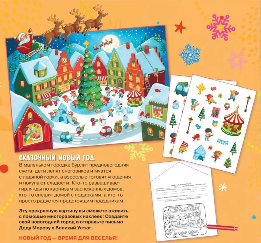 В маленьком городке бурлит предновогодняя суета: дети лепят снеговиков и мчатся с ледяной горки, а взрослые готовят угощения и покупают сладости. Кто-то развешивает гирлянды по карнизам заснеженных домов, кто-то спешит домой с подарками, а кто-то просто радуется предстоящим праздникам. Эту прекрасную картину вы сможете оживить с помощью многоразовых наклеек! Создайте свой новогодний город и отправьте письмо Деду Морозу в Великий Устюг. Новый Год – время для веселья!