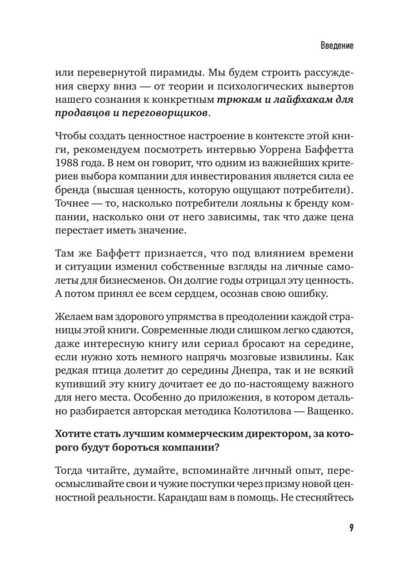 Авторы детально разбирают концепцию абстракции ценности в контексте бизнеса, предлагают образцы конкретного ролевого поведения в различных деловых ситуациях и с разными психотипами людей, представляют практические рекомендации для получения среднесрочного и долгосрочного доверия корпоративных клиентов с использованием абстракции ценности. На конкретных примерах показано, как изменить процесс повышения квалификации сотрудников компании, чтобы увеличить продажи при одновременном снижении издержек на обучение продавцов.
