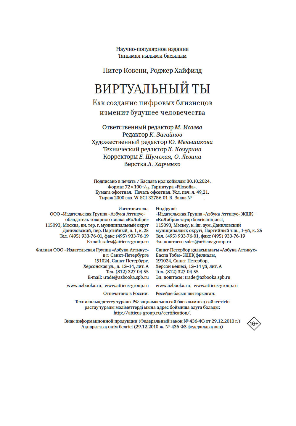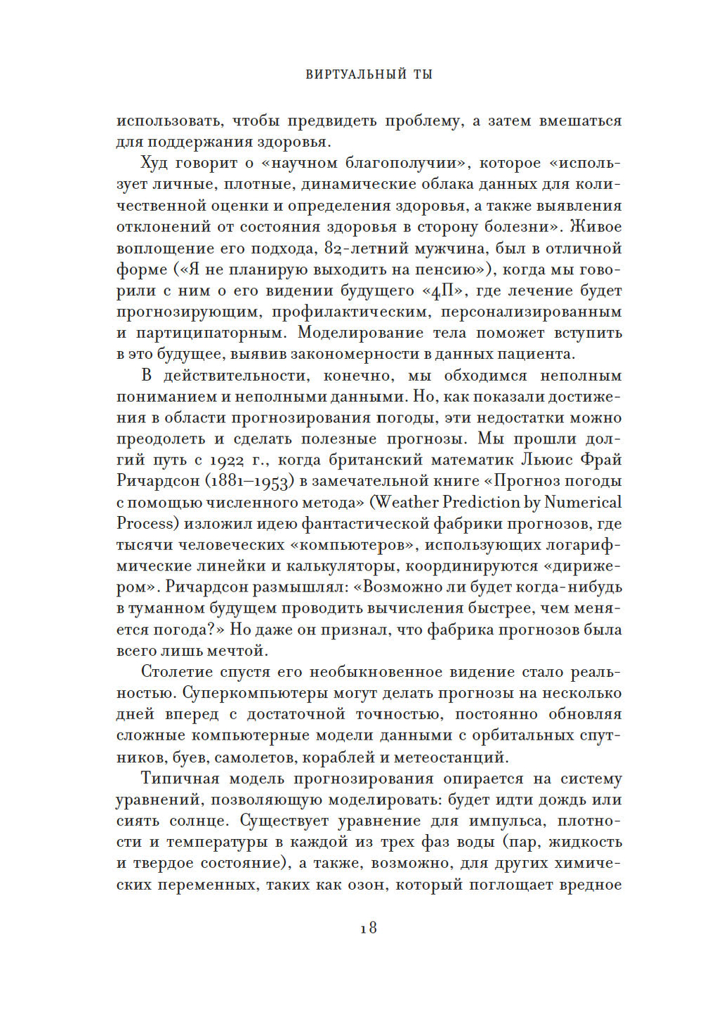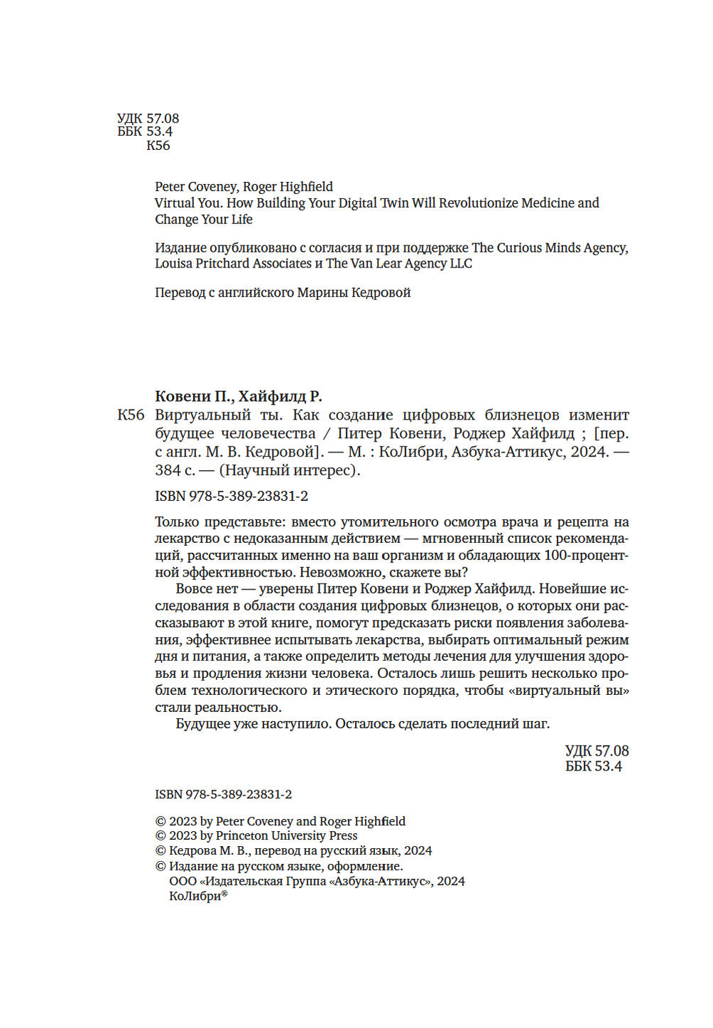 Вовсе нет – уверены Питер Ковени и Роджер Хайфилд. Новейшие исследования в области создания цифровых близнецов, о которых они рассказывают в этой книге, помогут предсказать риски появления заболевания, эффективнее испытывать лекарства, выбирать оптимальный режим дня и питания, а также определить методы лечения для улучшения здоровья и продления жизни человека. Осталось лишь решить несколько проблем технологического и этического порядка, чтобы "виртуальный вы" стали реальностью.