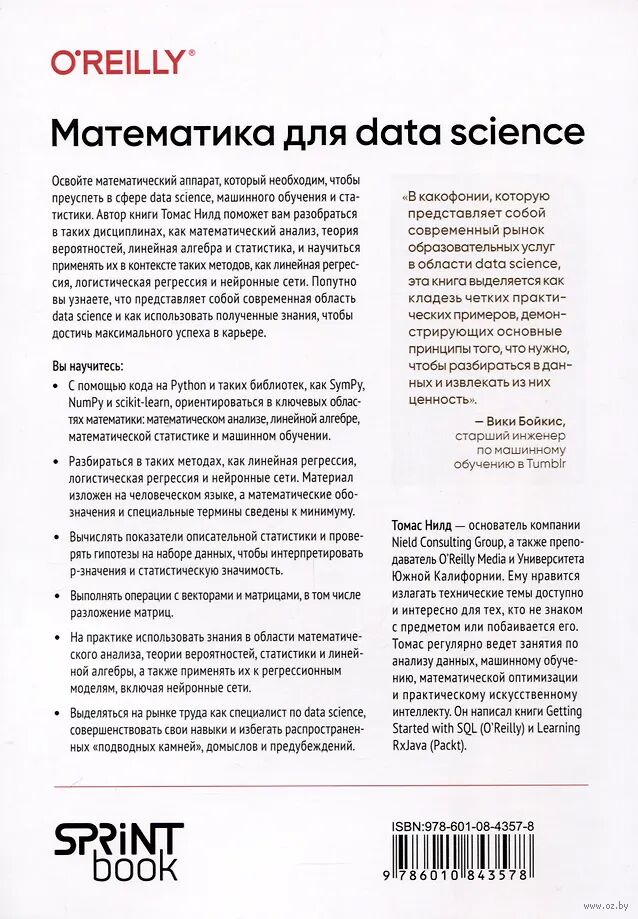 Освойте математический аппарат, который необходим, чтобы преуспеть в сфере data science, машинного обучения и статистики. Автор книги Томас Нилд поможет вам разобраться в таких дисциплинах, как математический анализ, теория вероятностей, линейная алгебра и статистика, и научиться применять их в контексте таких методов, как линейная регрессия, логистическая регрессия и нейронные сети. Попутно вы узнаете, что представляет собой современная область data science и как использовать полученные знания, чтобы достичь максимального успеха в карьере.