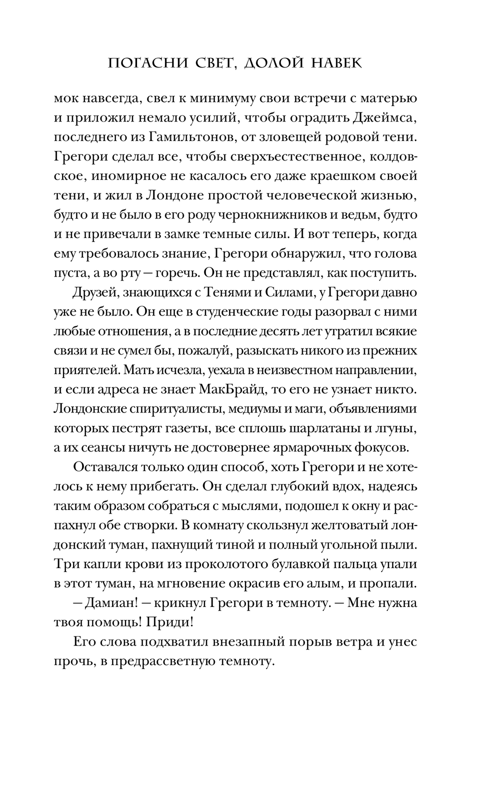 Следы босых ног в гардеробной – вот всё, что осталось после исчезновения Лауры Гамильтон и маленького Джеймса. Лорд Гамильтон уверен: в похищении его жены и наследника виноваты потусторонние силы. За помощью он обращается к младшему брату Демиану, эксцентричному чернокнижнику и гувернантке сына Элинор Кармайкл, которая способна видеть призраков. Но фамильный особняк Гамильтонов и мрачные улицы Лондона хранят слишком много секретов...