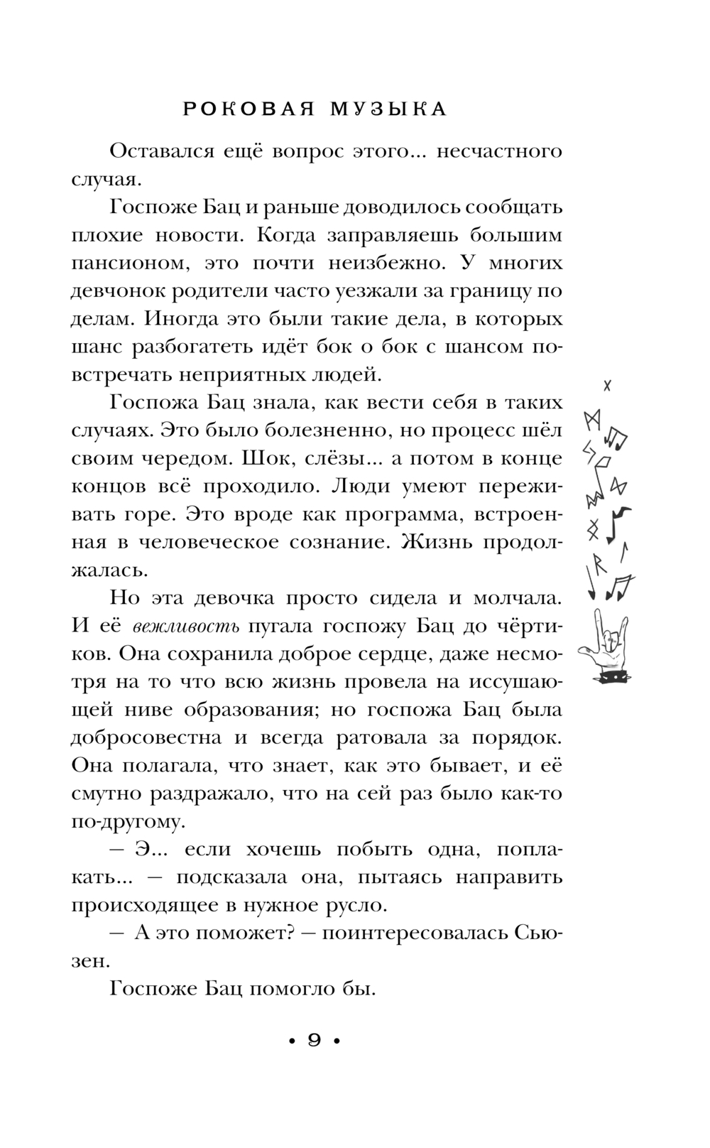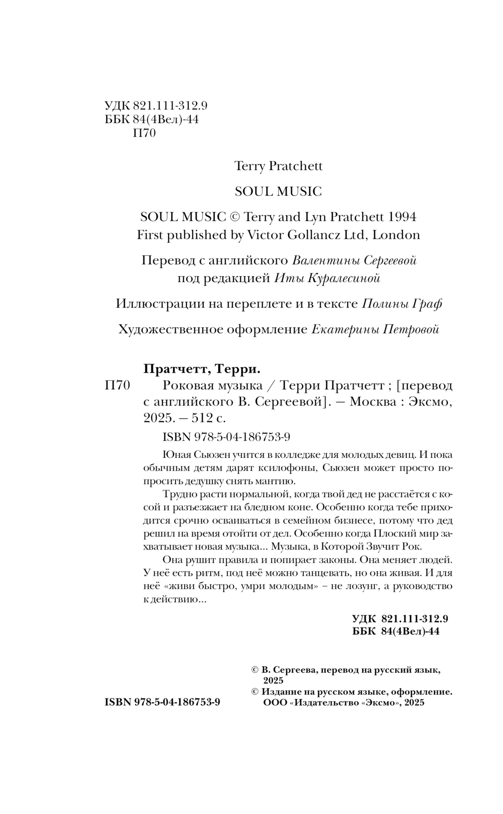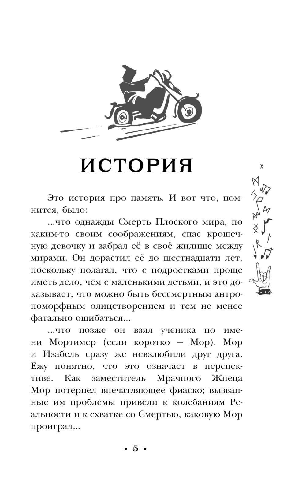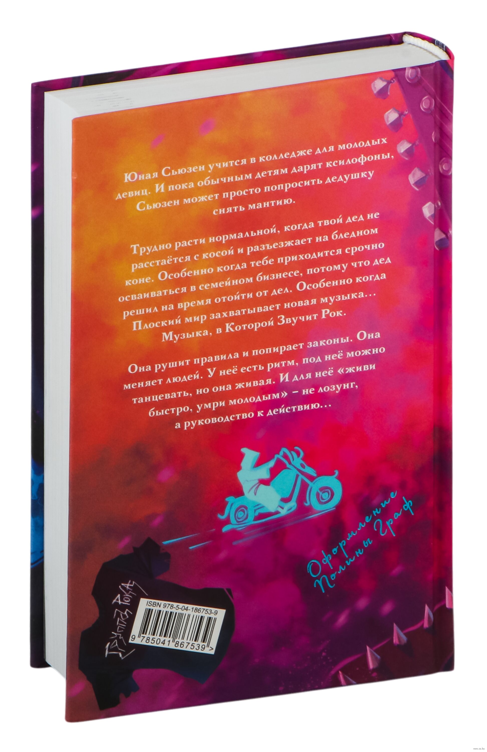 Трудно расти нормальной, когда твой дед не расстаётся с косой и разъезжает на бледном коне. Особенно когда тебе приходится срочно осваиваться в семейном бизнесе, потому что дед решил на время отойти от дел. Особенно когда Плоский мир захватывает новая музыка... Музыка, в Которой Звучит Рок.