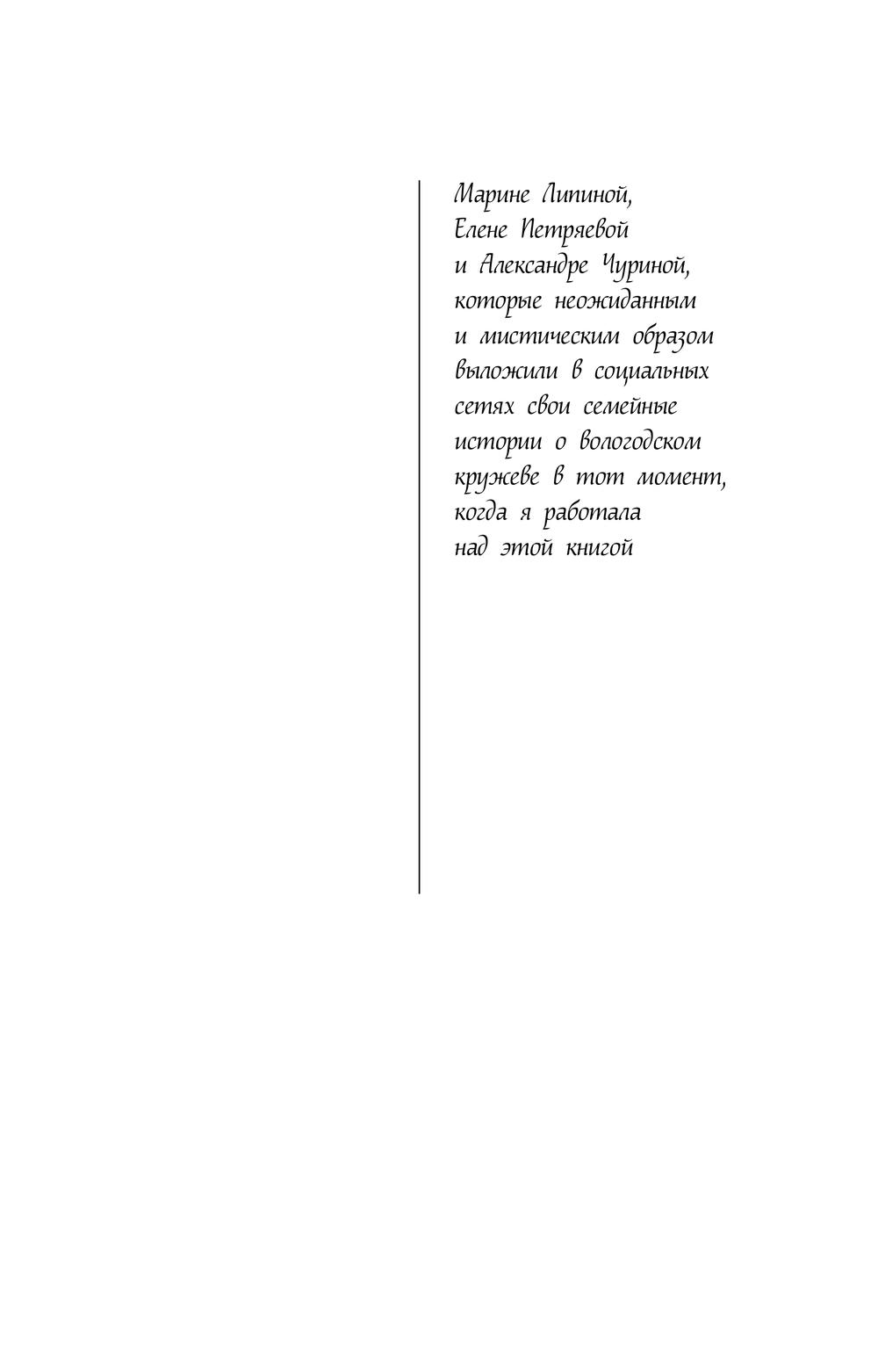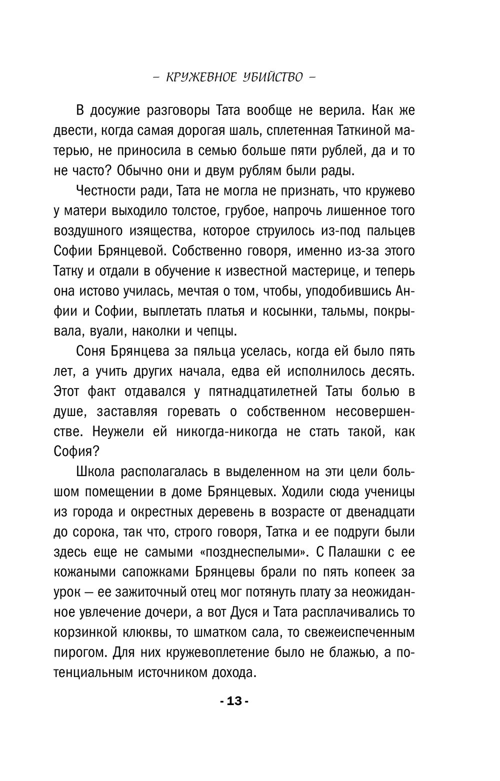 Снежана Машковская вела тихую уютную жизнь с мамой и работала в ателье, где занималась любимым делом – плетением кружева. Пока к ней не обратились из полиции с просьбой об экспертизе: в лесу был найден чемодан с останками пожилой женщины, там же лежал сколок – старинный эскиз кружева. Рисунок оказался подписан, и Снежана поняла, что он имеет непосредственное отношение к истории ее семьи и создан знаменитой кружевницей Татой Макаровой, ее далекой прародительницей. Но как он связан с убийством и его жертвой? Незаметно для себя Снежана втянулась в расследование, вместе с которым в ее жизнь вошли волнующие перемены...