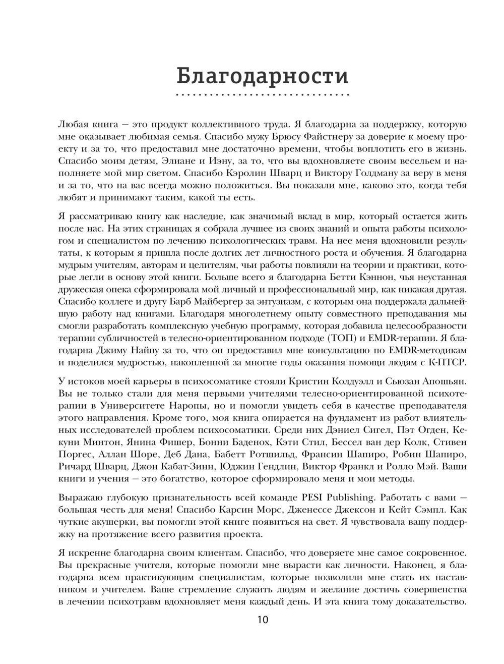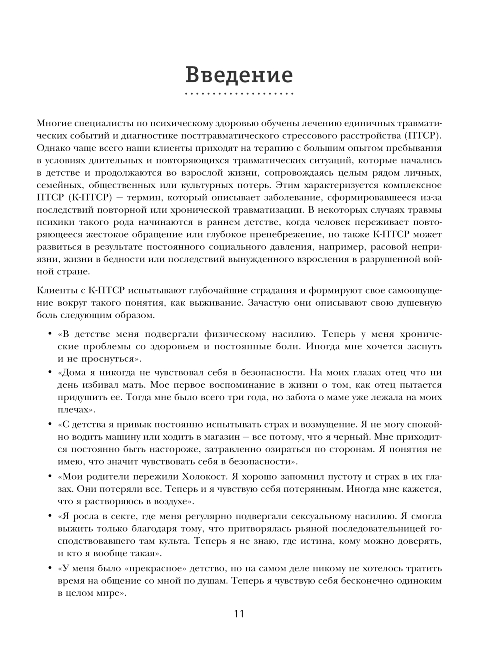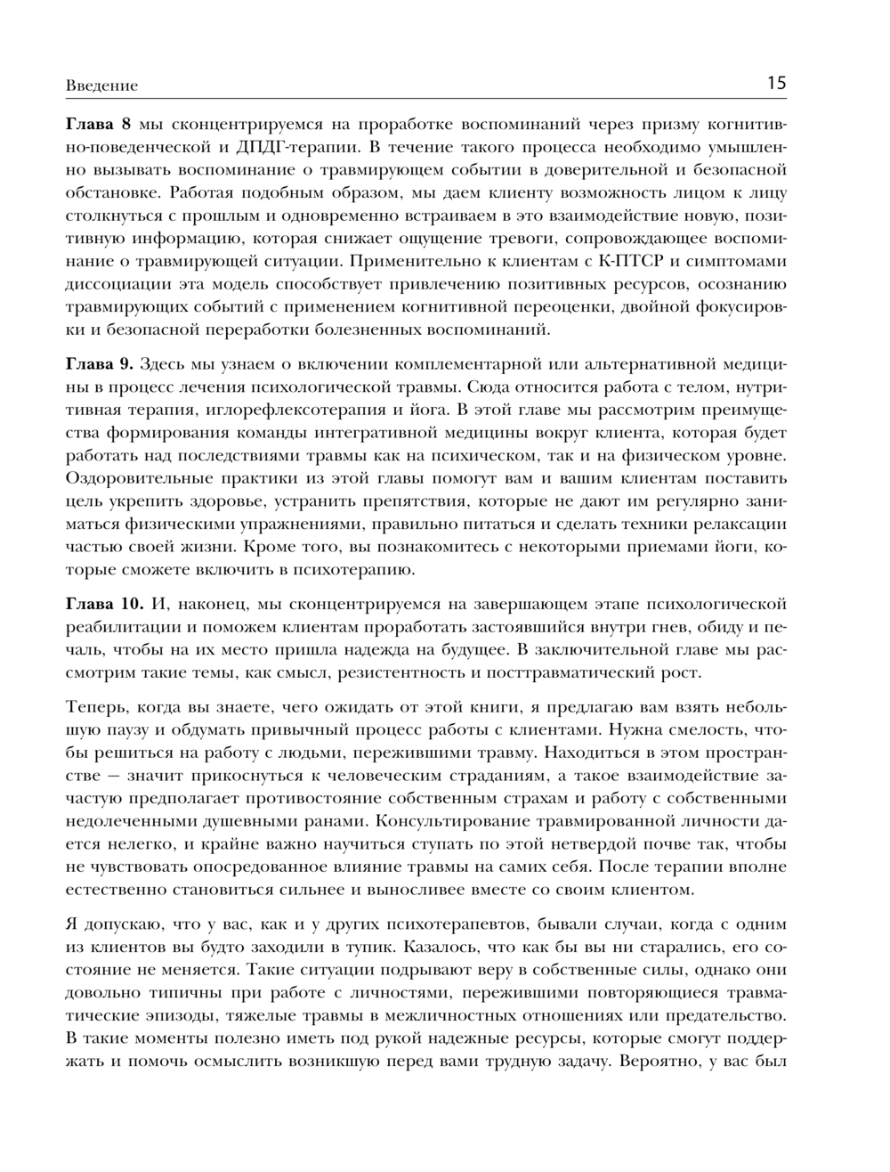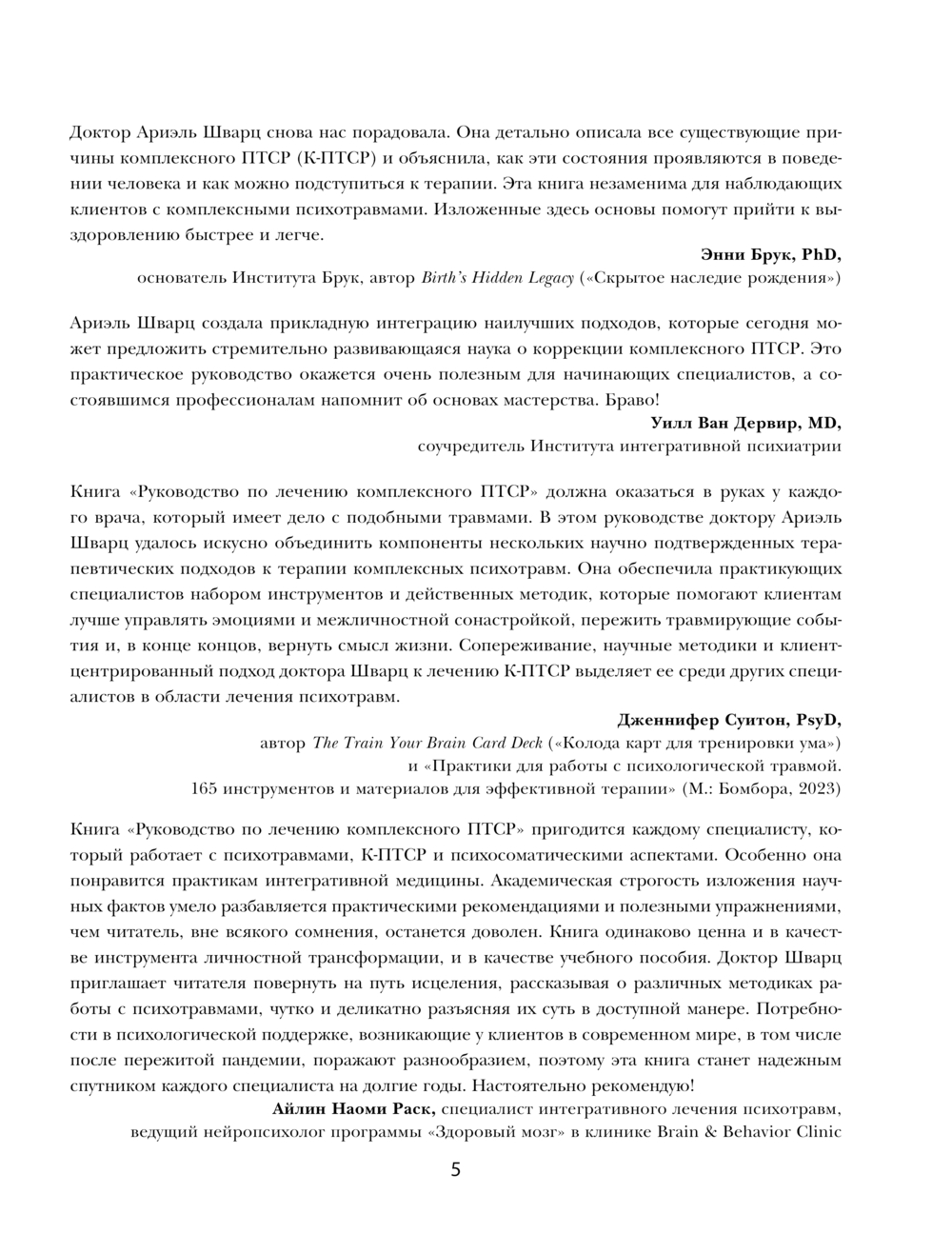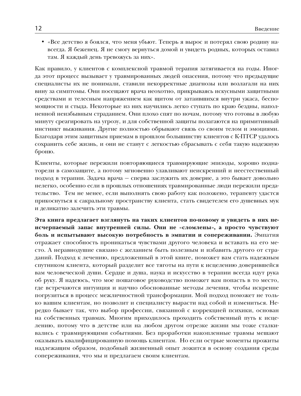 В своем практическом руководстве по работе с комплексным посттравматическим расстройством доктор Ариэль Шварц, клинический психолог и специалист по К-ПТСР, излагает разностороннюю методику терапии случаев К-ПТСР. Изложенная в форме понятных терапевтических упражнений-опросников, теоретических обоснований и случаев из практики, методика доктора Шварц станет полезным инструментом в арсенале разных специалистов, работающих с психотравмами: от психологов до психиатров. Различные подходы призваны переключить внимание пациента с внутренних переживаний и ретроспективы на ощущения собственного тела и его возможностей на настоящий момент.