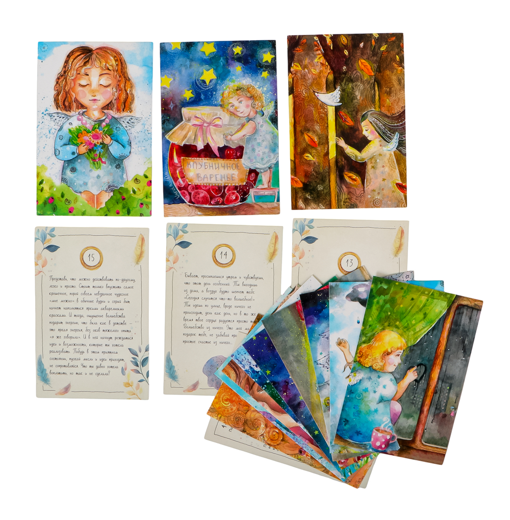 Светлые, сердечные, нежные образы метафорических открыток "Послания Ангелов" станут поддержкой и напутствием, помощью в работе с поиском ресурса от бессознательного. Варда Ма (Яна Куцовская) – автор популярных и давно полюбившихся метафорических колод "Послания Луны" и "Древо Рода". Ее работы всегда живые и "говорящие". Эти образы рождаются из глубины души и находят искренний отклик в сердцах.