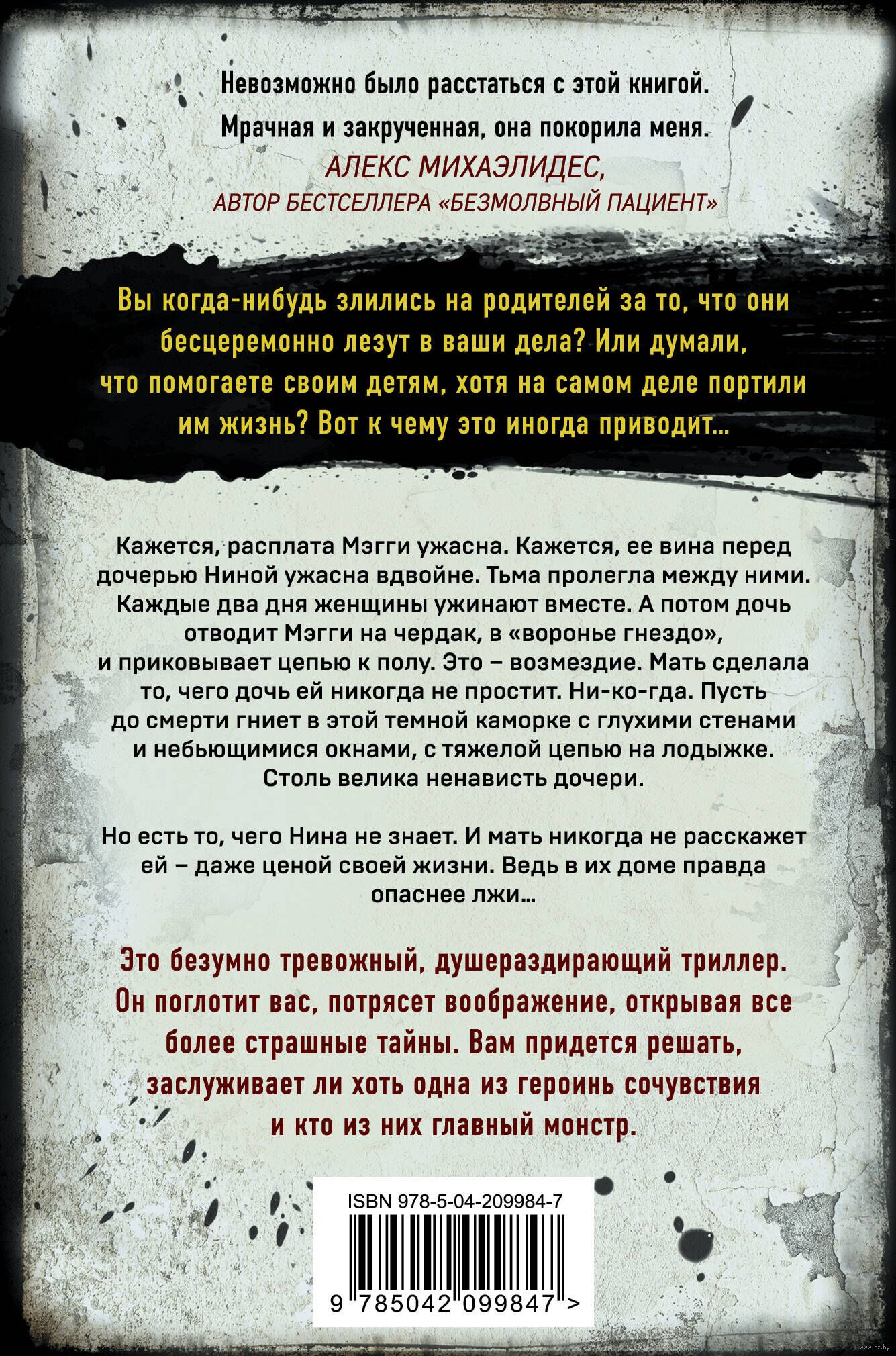 Кажется, расплата Мэгги – ужасна. Кажется, ее вина перед дочерью Ниной – ужасна вдвойне. Тьма пролегла между ними. Каждые два дня женщины ужинают вместе. А потом дочь отводит Мэгги на чердак, в "воронье гнездо", и приковывает цепью к полу. Это – возмездие. Мать сделала то, чего дочь ей никогда не простит. Ни-ко-гда. Пусть до смерти гниет в этой темной каморке с глухими стенами и небьющимися окнами, с тяжелой цепью на лодыжке. Столь велика ненависть дочери.