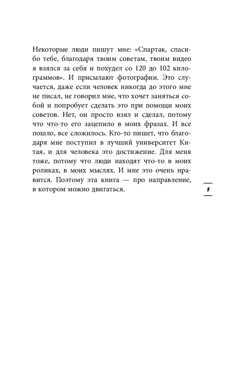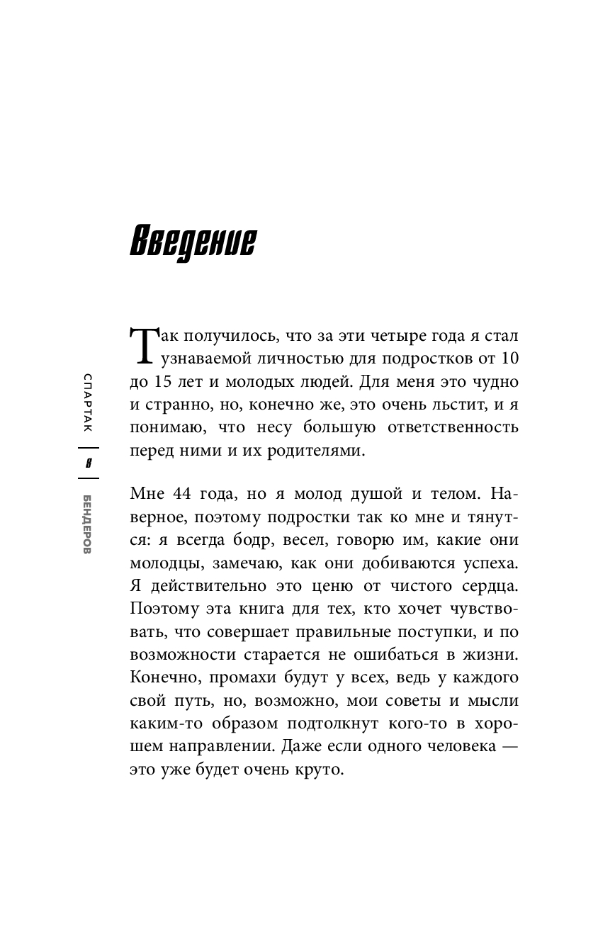 Оптимистичная установка, но именно уверенность – секрет любых достижений. Любая, самая амбициозная мечта достижима, если есть желание и силы ее воплотить. Так считает Спартак Бендеров, спортсмен и фитнес-тренер, ставший известным благодаря своим каналам SJBody и SJBATYA в социальных сетях. Начать карьеру блогера, окунуться с головой в новый, неизведанный мир и обрести популярность, набрав аудиторию в более чем 9 млн подписчиков – это ли не история успеха? А что, если за ней стоит упорный труд, взлеты и падения, сомнения и неудачи? В книге "Слово Спартака" автор расскажет, как идти к цели, не терять мотивацию, строить отношения с окружающими и поддерживать себя в хорошей форме.