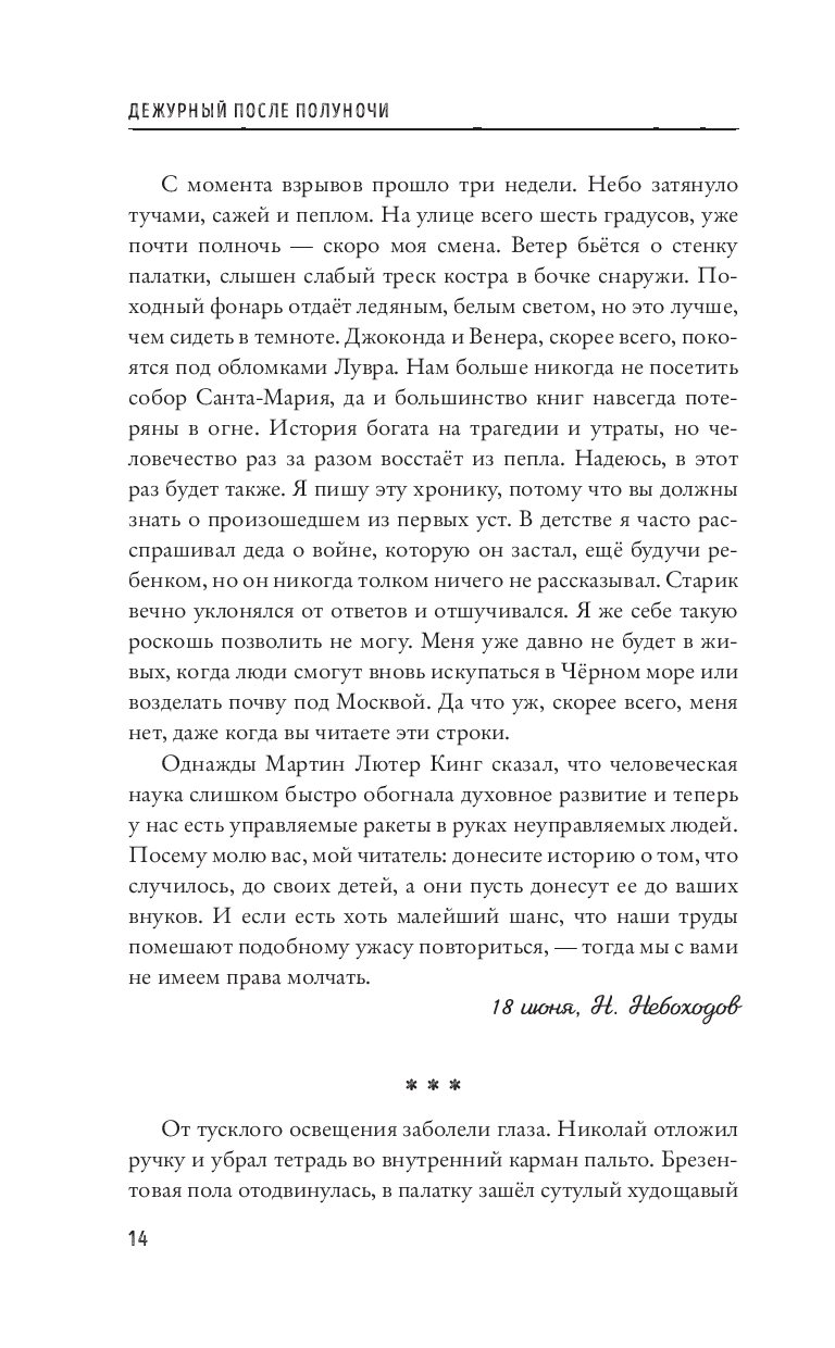 Николай Небоходов – врач лагеря выживших. Он считает запасы медикаментов, помогает заболевшим и раненым. Берет на себя больше, чем должен, потому что понимает – кто будет на стороне людей, если не он? Но в условиях ограниченной еды и надвигающихся туч с радиоактивными осадками шансы выжить стремятся к нулю, а военные явно что-то скрывают...