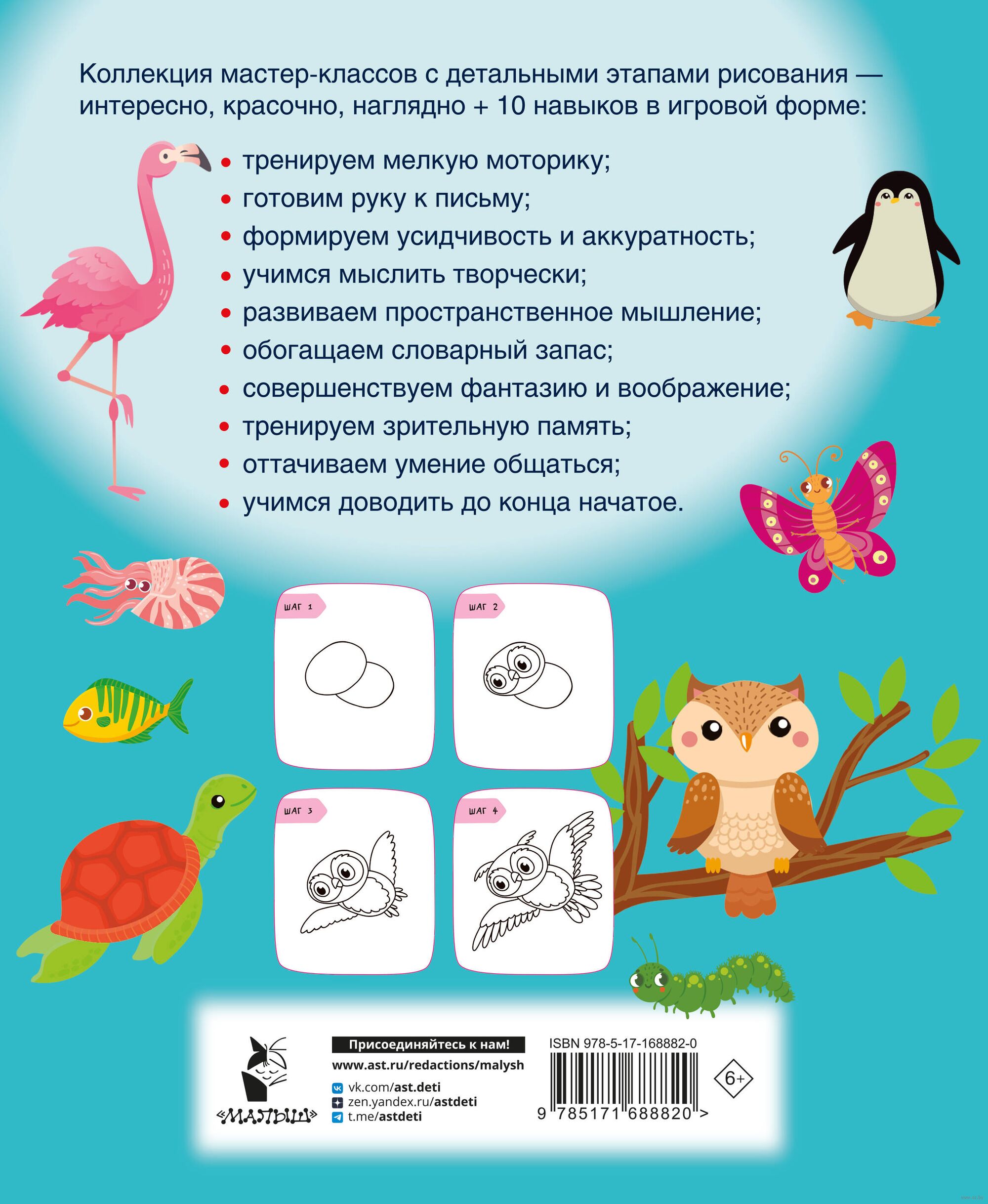 В нашей замечательной книжке – коллекция пошаговых рисовалок. С первых страниц маленький художник поймёт, как в четыре этапа нарисовать всё, что хочется, – пингвина, сову, бабочку, рыбу-клоуна, кузнечика, дельфина, стрекозу и жука-оленя, фламинго и многое другое. А заботливые папы и мамы смогут помочь малышу в творческом начинании.