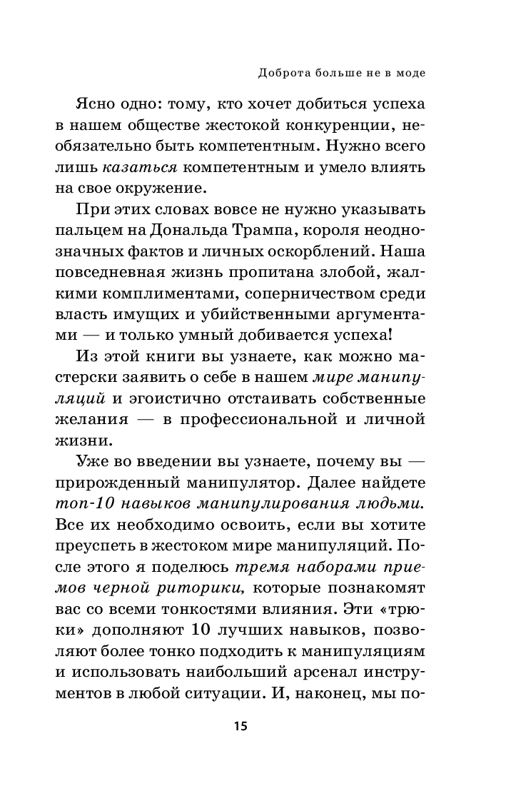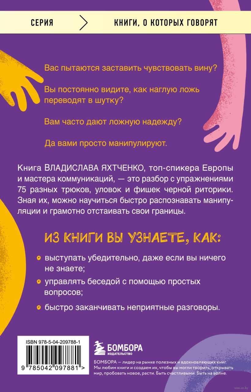 Искусство манипуляции многообразно. Кто-то использует одни и теже приемы, а кто-то постоянно оттачивает навыки черной риторики, чтобы эффективнее влиять на других. Знать об этих способах полезно, чтобы понимать, когда на вас оказывается тайное воздействие. В этой книге вы найдете 75 манипулятивных трюков и способы защиты от них. Узнаете, как грамотно отстаивать личные границы, отражать агрессию и повысить уверенность в себе. А еще познакомитесь с топ-10 навыков деструктивных людей, чтобы вовремя определять их и не позволять манипулировать собой.
