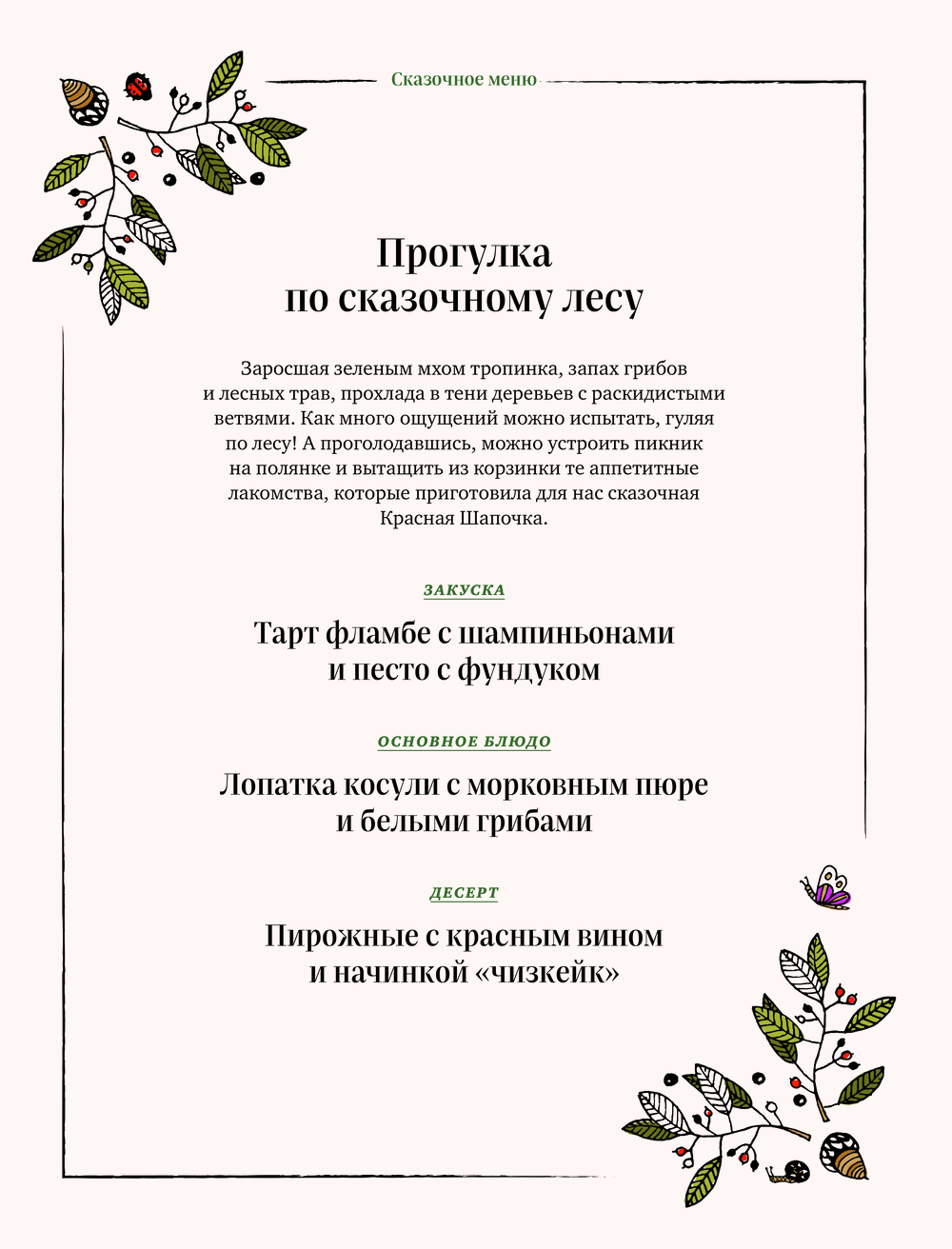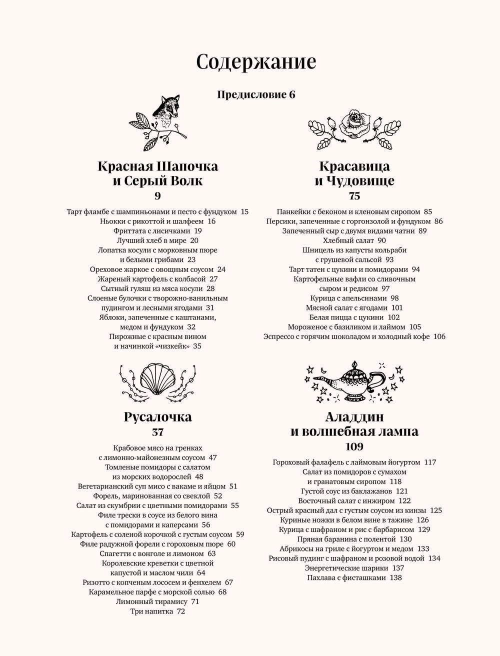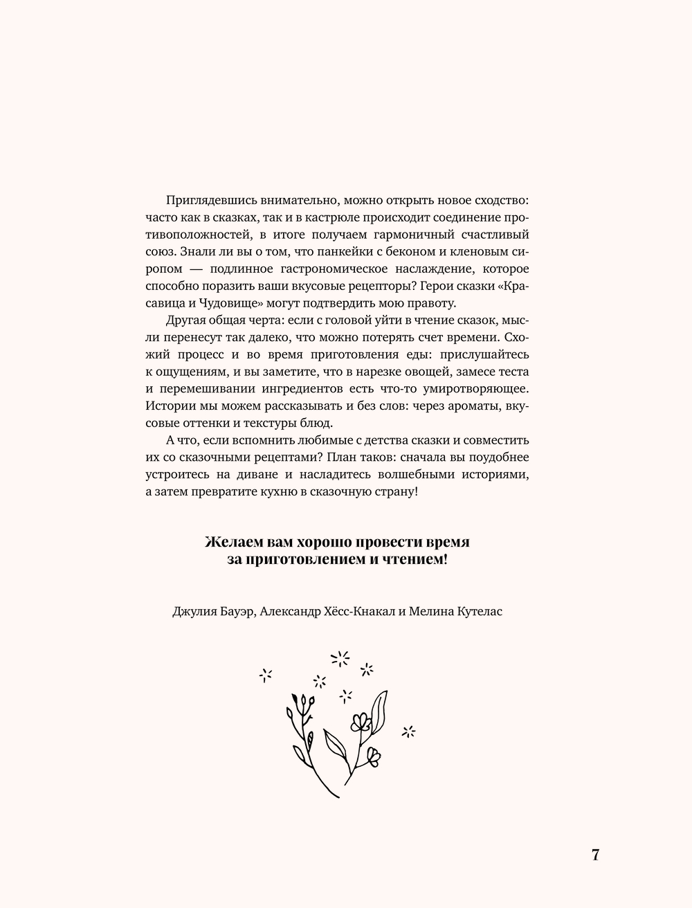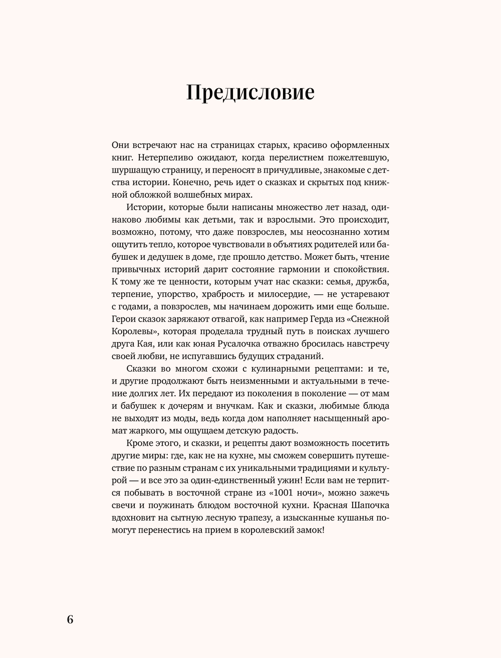 Сказки и рецепты дают возможность посетить другие миры: где, как не на кухне, мы сможем совершить путешествие по разным странам с их уникальными традициями и культурой – и все это за один-единственный ужин! Если вам не терпится побывать в восточной стране из "Алладина и волшебной лампы", можно зажечь свечи и поужинать блюдом восточной кухни. "Красная Шапочка" вдохновит на сытную лесную трапезу, а изысканные блюда помогут перенестись на прием в королевский замок! А что, если вспомнить любимые с детства сказки и совместить их со сказочными рецептами? План таков: сначала вы поудобнее устроитесь на диване и насладитесь волшебными историями, а затем превратите кухню в сказочную страну! В этой книге ореховое жаркое и сытный гуляш сменяются маринованной форелью и карамельным парфе с морской солью. А запеченные персики или сыр – мороженым с базиликом и эспрессо с горячим шоколадом. Изысканно, ярко, вкусно и по-настоящему волшебно!
