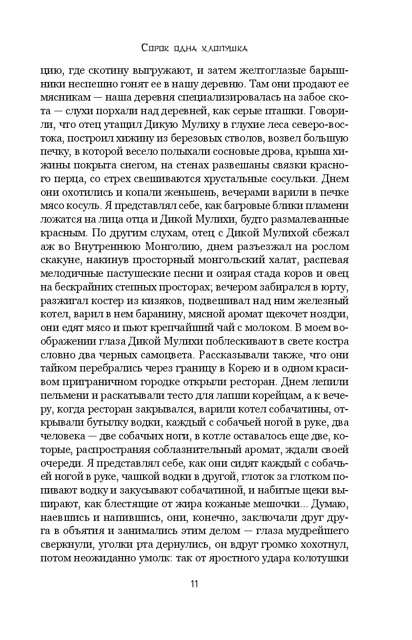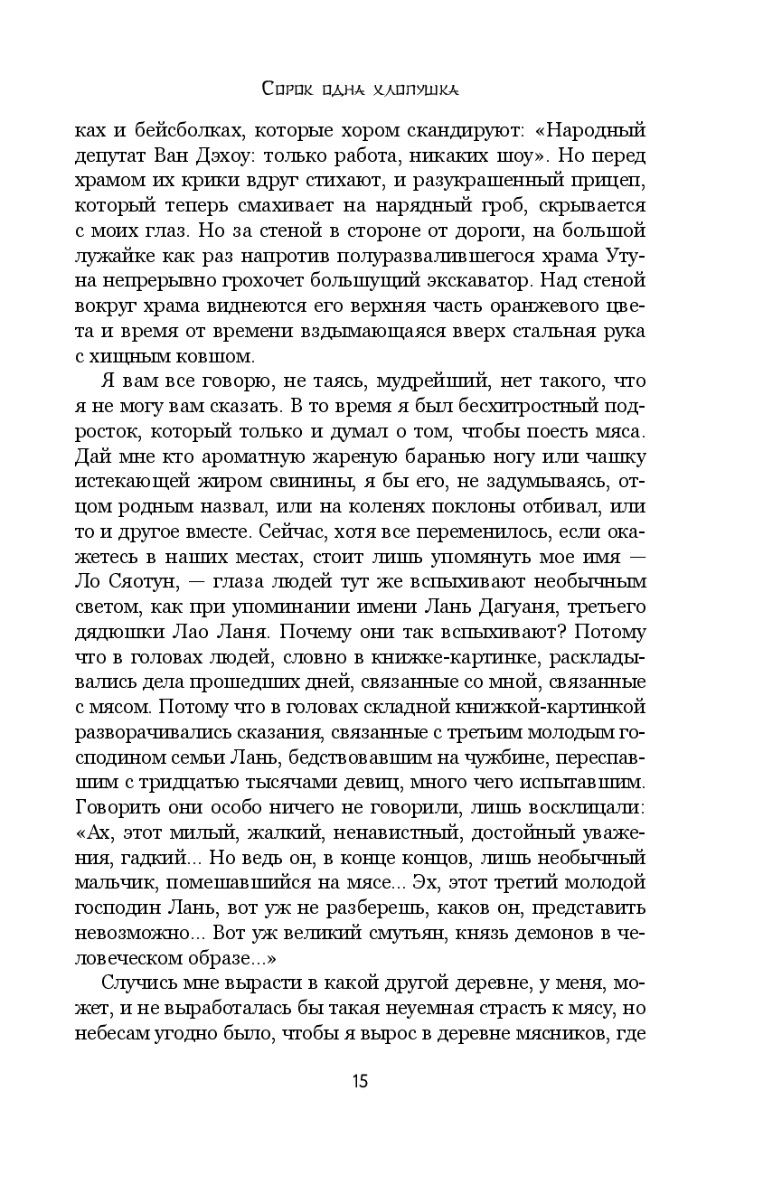В городе, где родился и вырос Ло Сяотун, все без ума от мяса. Рассказывая старому монаху, а заодно и нам истории из своей жизни и жизней других горожан, Ло Сяотун заводит нас все глубже в дебри и тайны диковинного городка. Страус, верблюд, осел, собака – как из рога изобилия сыплются угощения из мяса самых разных животных, а истории становятся все более причудливыми, пугающими и – смешными? Повествователь, сказочник, мифотворец, сатирик, мастер аллюзий и настоящий галлюциногенный реалист... Затейливо переплетая несколько нарративов, Мо Янь исследует самую суть и образ жизни современного Китая.