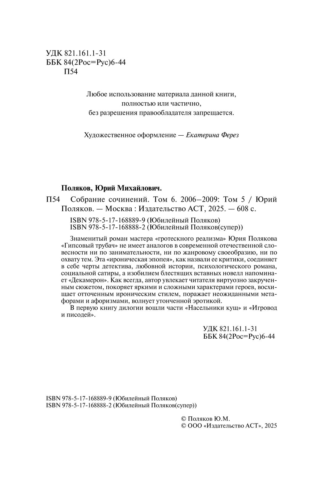 Знаменитый роман мастера "гротескного реализма" Юрия Полякова "Гипсовый трубач" не имеет аналогов в современной отечественной словесности ни по занимательности, ни по жанровому своеобразию, ни по охвату тем. Эта "ироническая эпопея", как назвали ее критики, соединяет в себе черты детектива, любовной истории, психологического романа, социальной сатиры, а изобилием блестящих вставных новелл напоминает "Декамерон". Как всегда, автор увлекает читателя виртуозно закрученным сюжетом, покоряет яркими и сложными характерами героев, восхищает отточенным ироническим стилем, поражает неожиданными метафорами и афоризмами, волнует утонченной эротикой.
