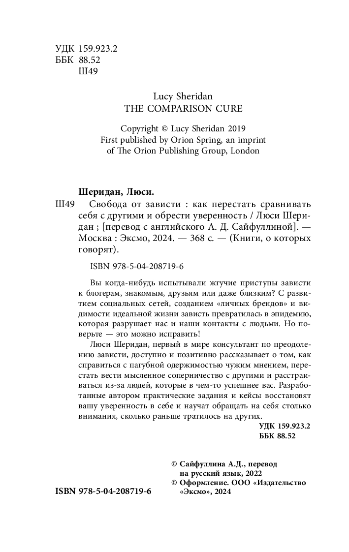 Люси Шеридан, первый в мире консультант о преодолении зависти, доступно и позитивно рассказывает о том, как справиться с пагубной одержимостью чужим мнением, перестать вести мысленное соперничество с другими и расстраиваться из-за людей, которые в чем-то успешнее вас. Разработанные автором практические задания и кейсы восстановят вашу уверенность в себе и научат обращать на себя столько внимания, сколько раньше тратилось на других.