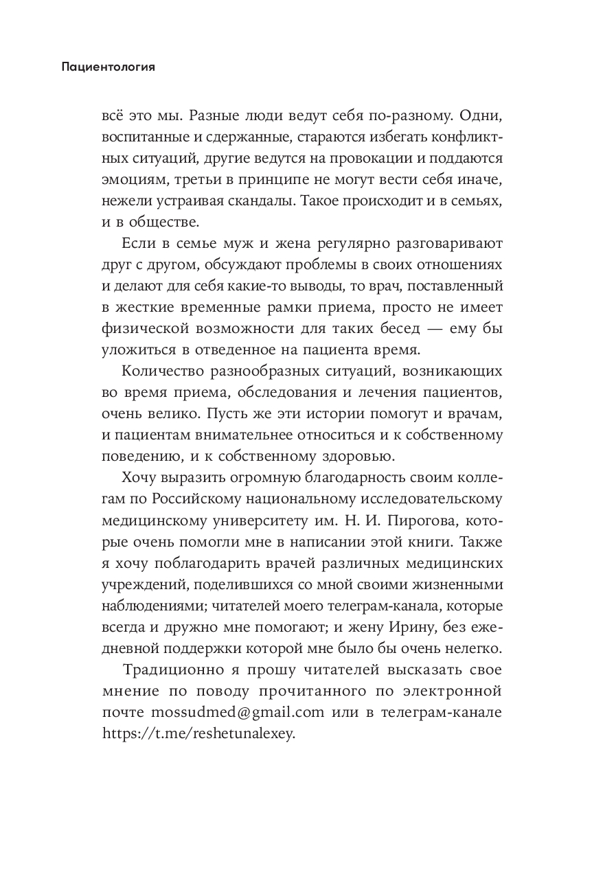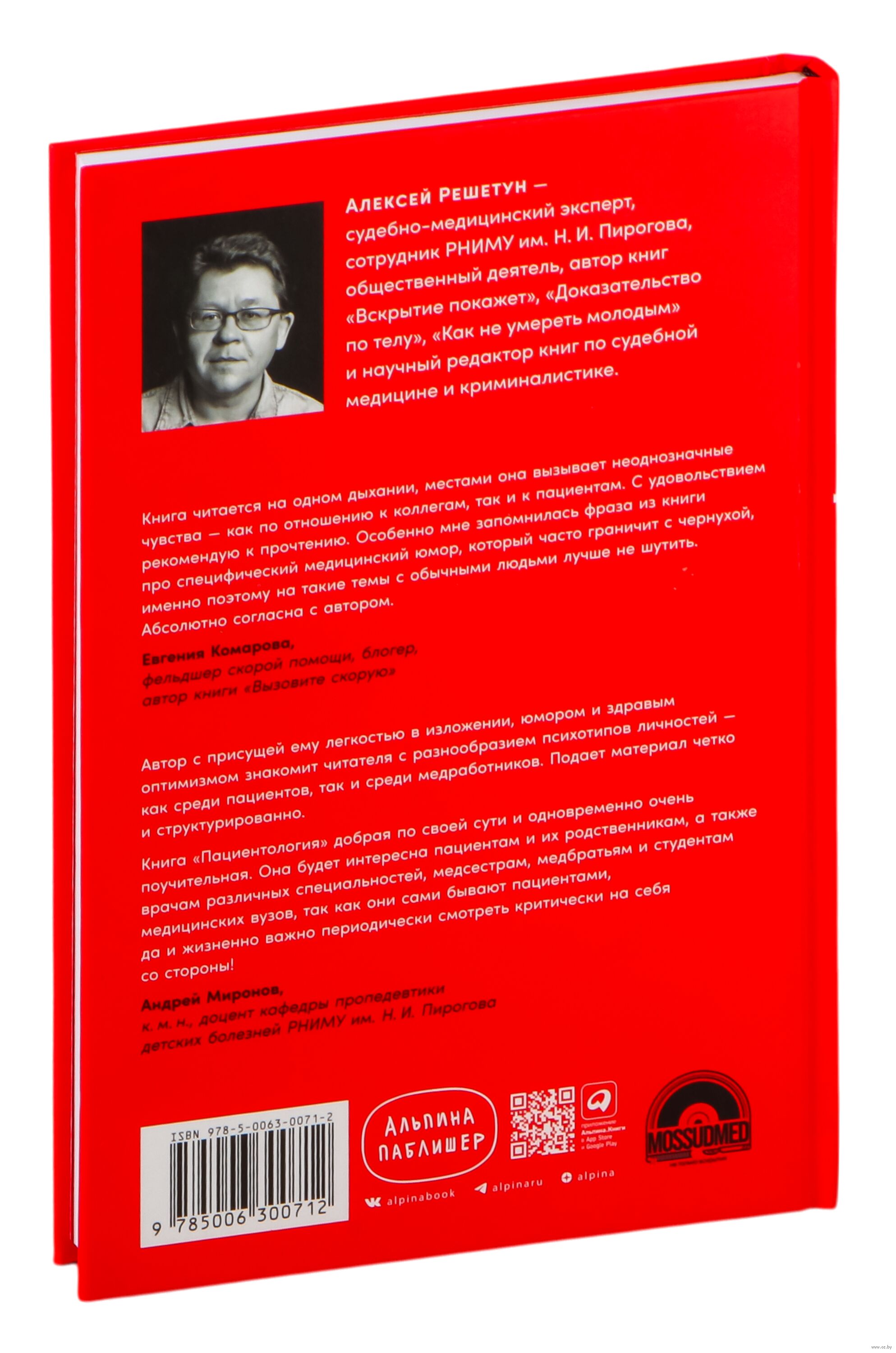 Новая книга судмедэксперта Алексея Решетуна, автора бестселлера "Вскрытие покажет", – ироничный путеводитель по сложному миру взаимоотношений врача и пациента. Автор приглашает взглянуть на привычные ситуации, с которыми мы сталкиваемся в поликлиниках и больницах, с неожиданной стороны. Опираясь на личный опыт и реальные истории своих коллег, он с юмором и любовью рассказывает о главных героях книги – пациентах: опоздунах, паникерах, ждунах и чудиках. Вы также узнаете, почему интернет не лучший советчик в вопросах лечения, к чему приводит страх перед стоматологами и чего не стоит делать в очереди к терапевту. Книга "Пациентология" будет интересна и тем, кто хотя бы раз в жизни обращался к врачу, и тем, кто носит белые халаты.