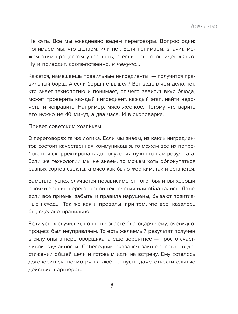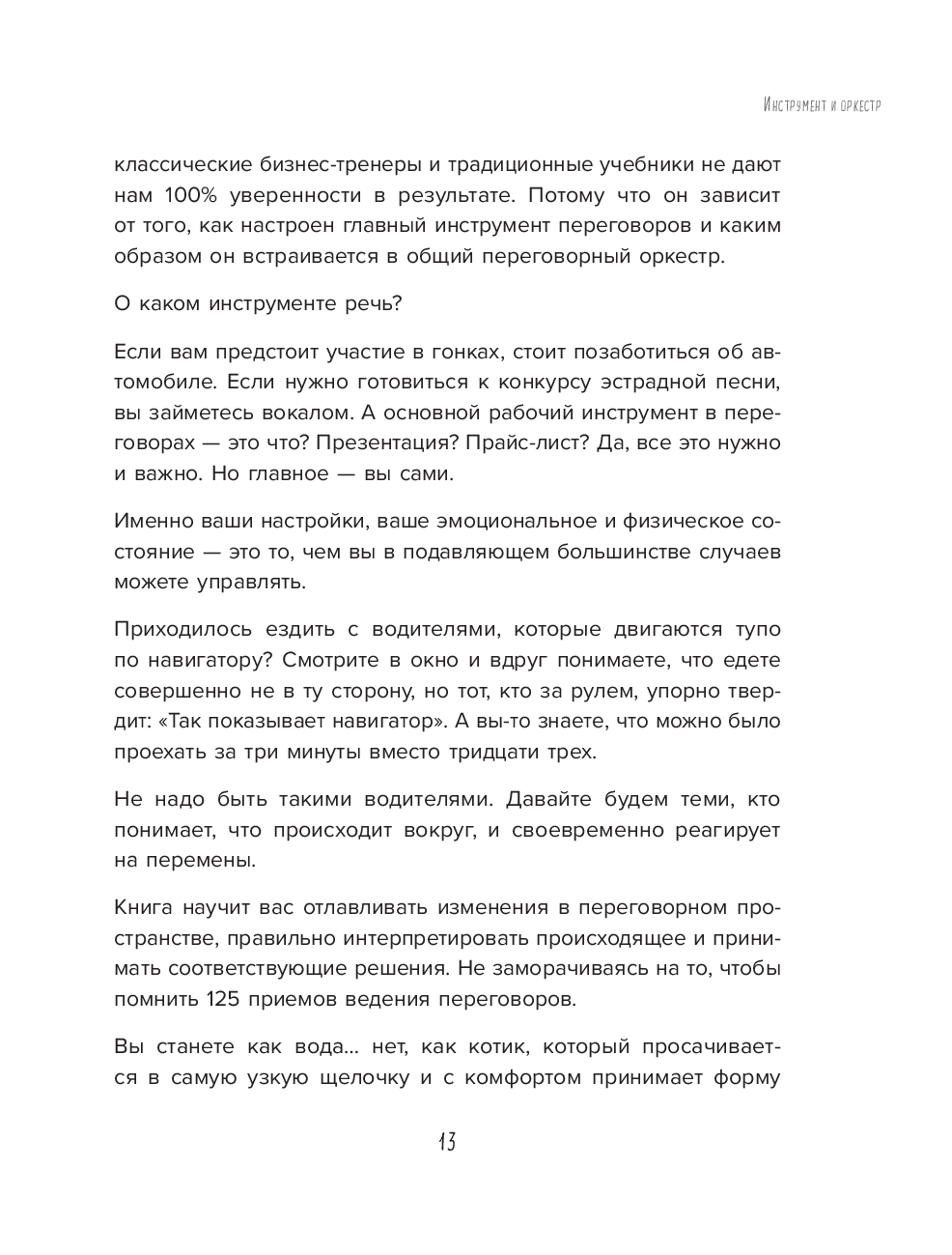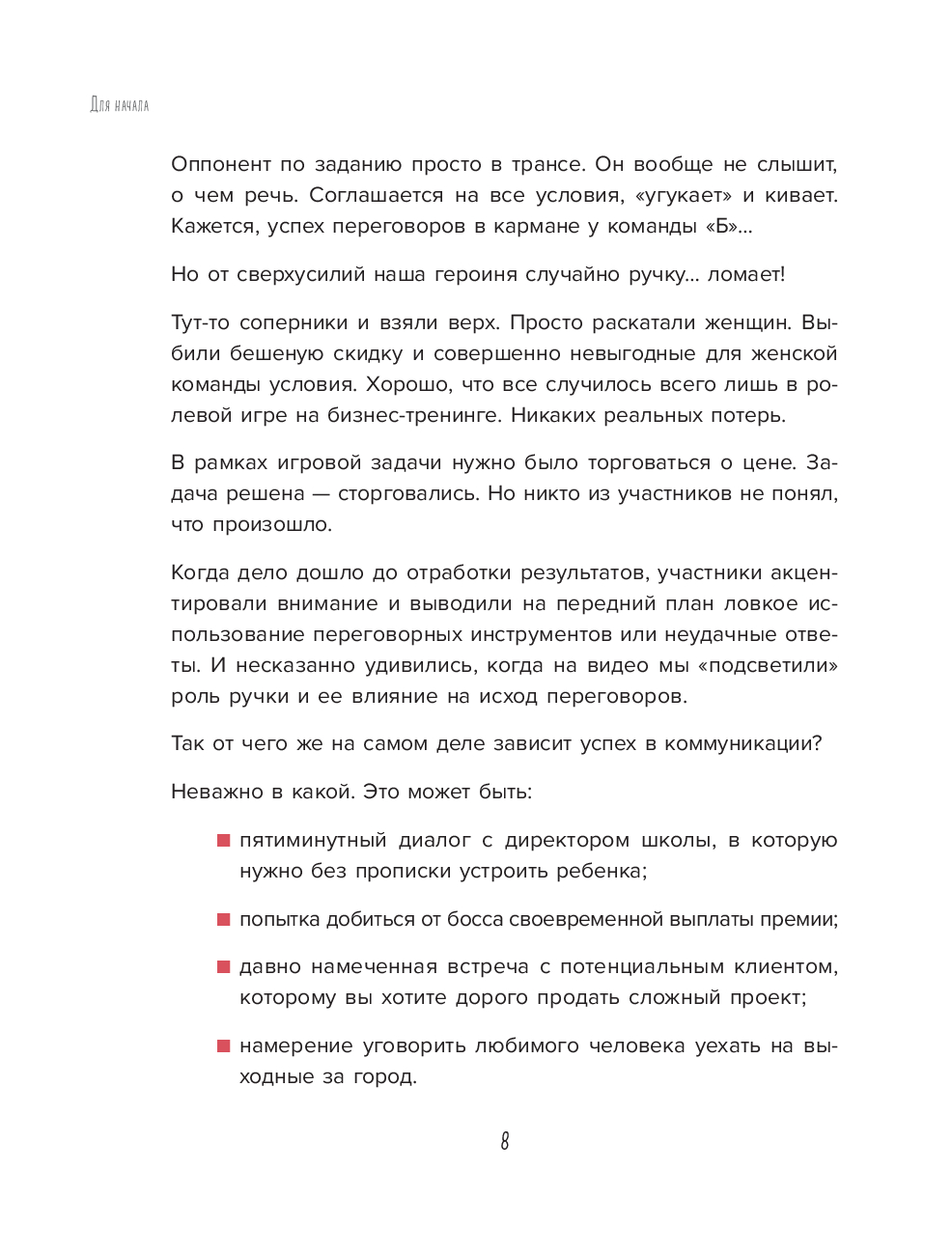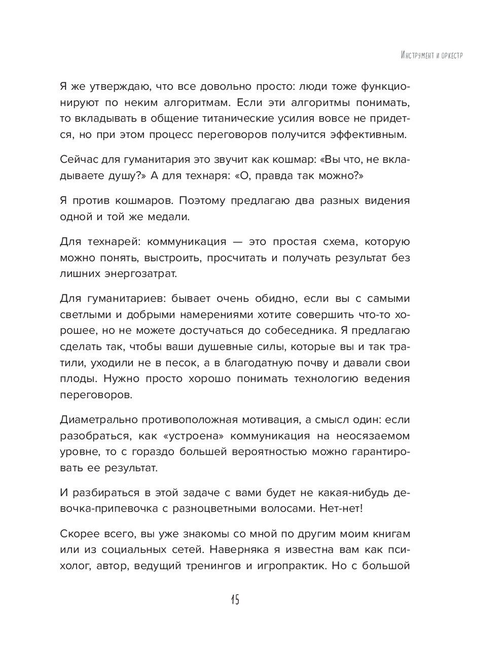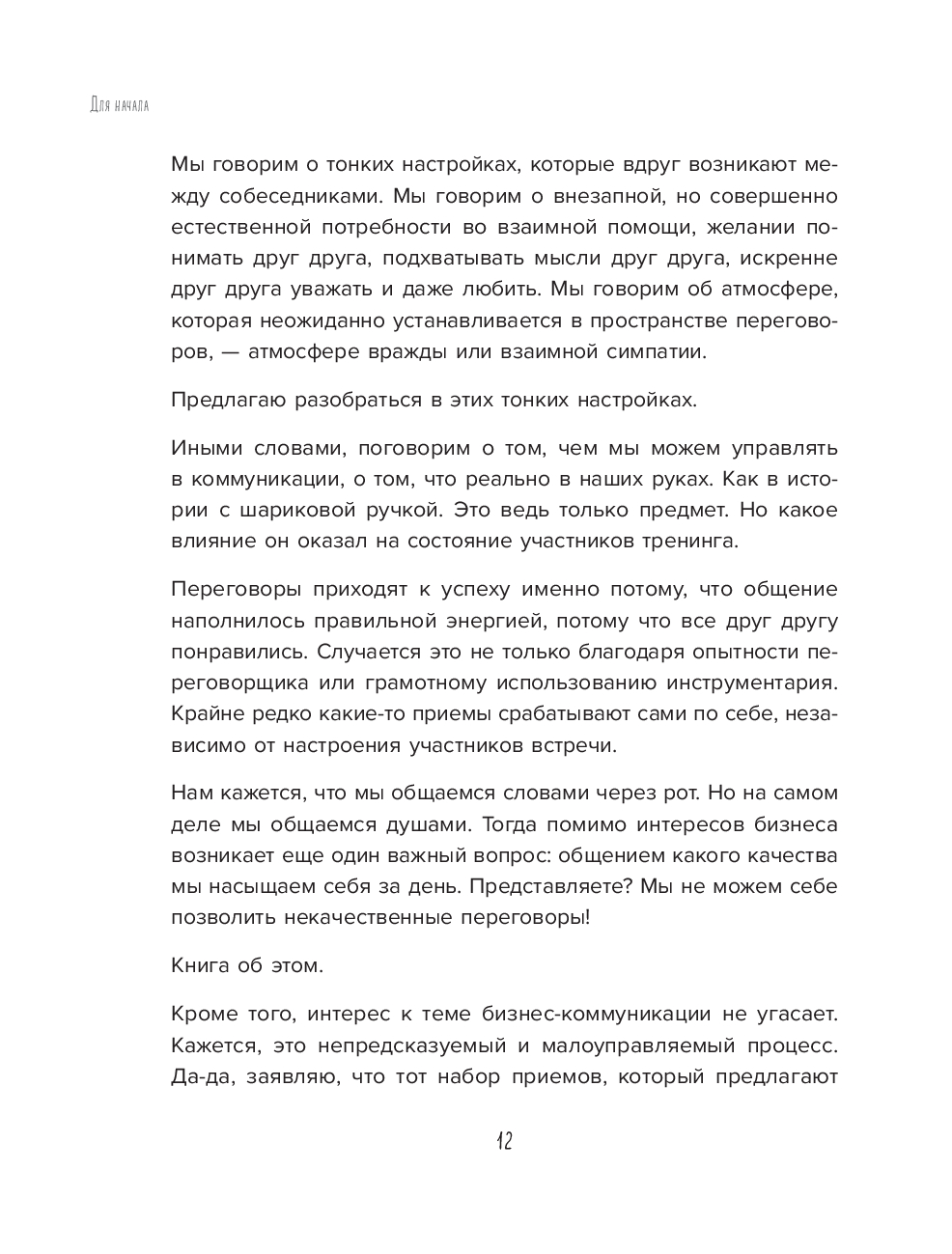 Не только в овальных кабинетах случаются переговоры. Вы договариваетесь об уборке комнаты с ребенком, о датах отпуска с партнером, о скидке на помидоры с продавцом. И каждый раз вы оказываетесь в трехмерном переговорном пространстве, которое, по Татьяне Мужицкой, состоит из задач, отношений и энергии. Задачи – это цели коммуникации, отношения – стиль взаимодействуя участников, энергия – их состояние. И, чтобы коммуникация была результативной, важно поймать баланс по всем трем направлениям. Для этого автор предлагает простую поэтапную технологию. Освоив ее, можно изменить свое отношение к переговорам. Сделать их и эффективными, и интересными. Не зря ведь книга называется "Переговоры по душам".