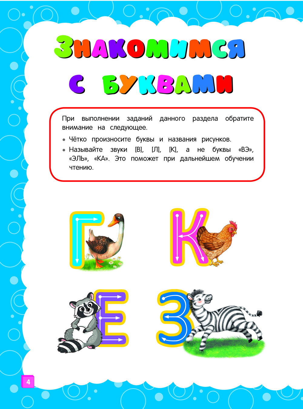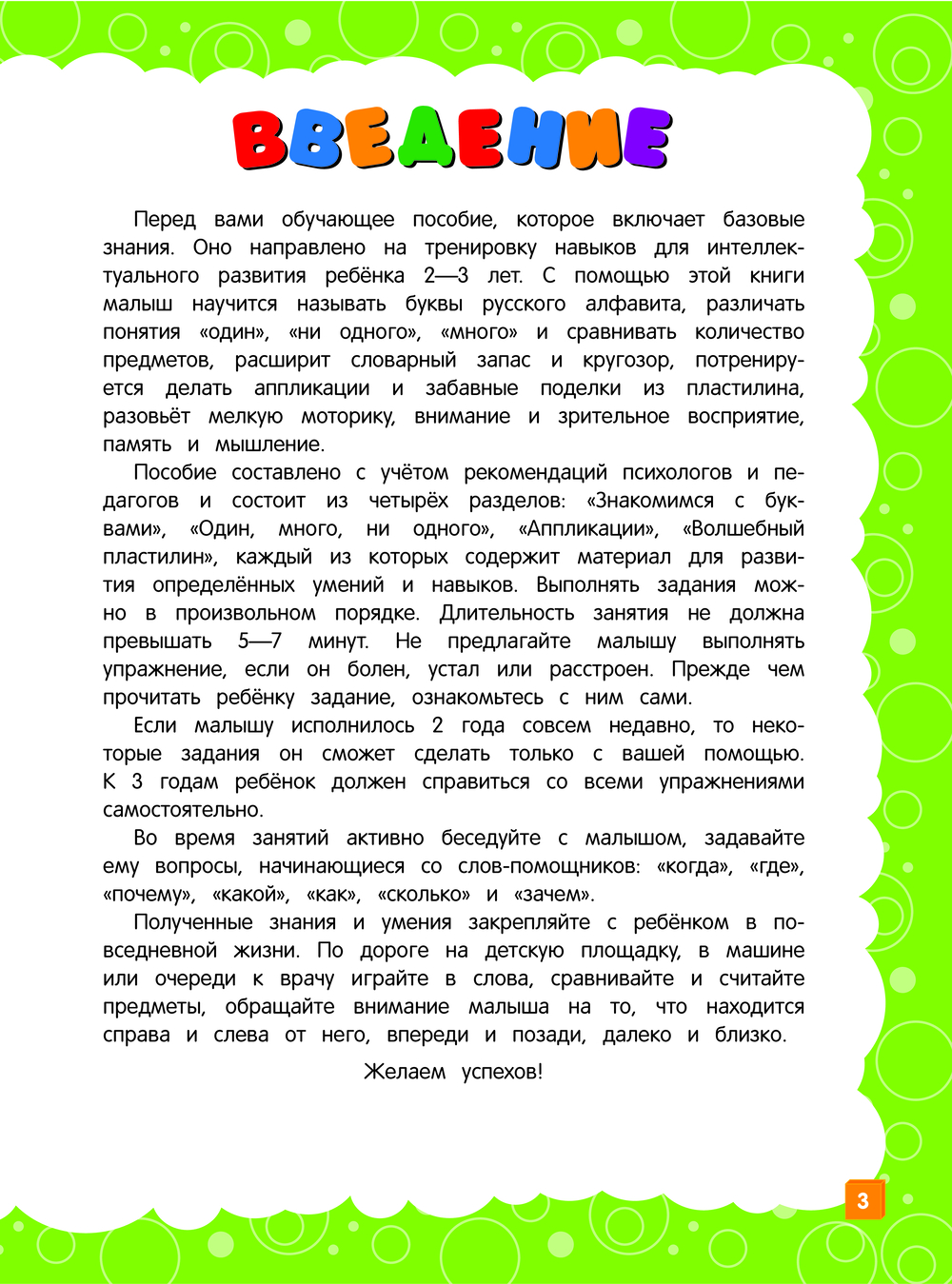 Основная цель пособия – дать ребёнку первые знания по базовым темам. Тематика включённых в книгу разделов соответствует ФГОС. Выполняя увлекательные задания, малыш научится называть буквы русского алфавита, различать понятия "один", "ни одного", "много" и сравнивать количество предметов, расширит словарный запас и кругозор, потренируется делать аппликации и забавные поделки из пластилина, разовьёт мелкую моторику, внимание, память и мышление.
