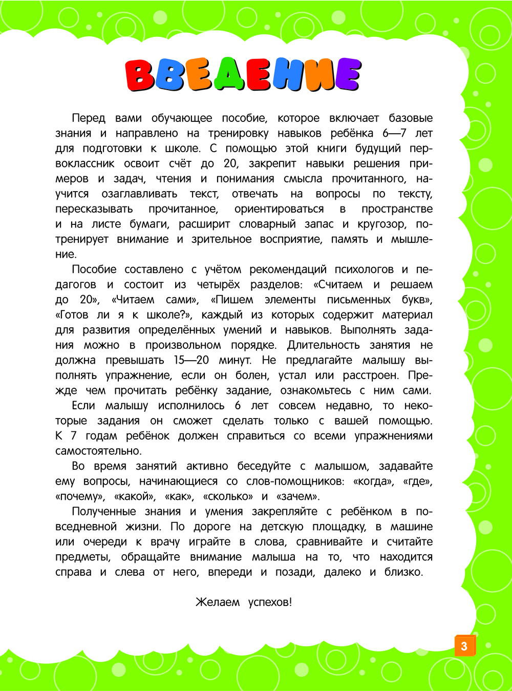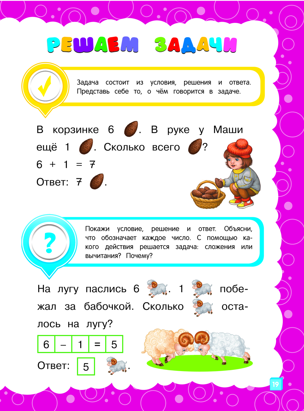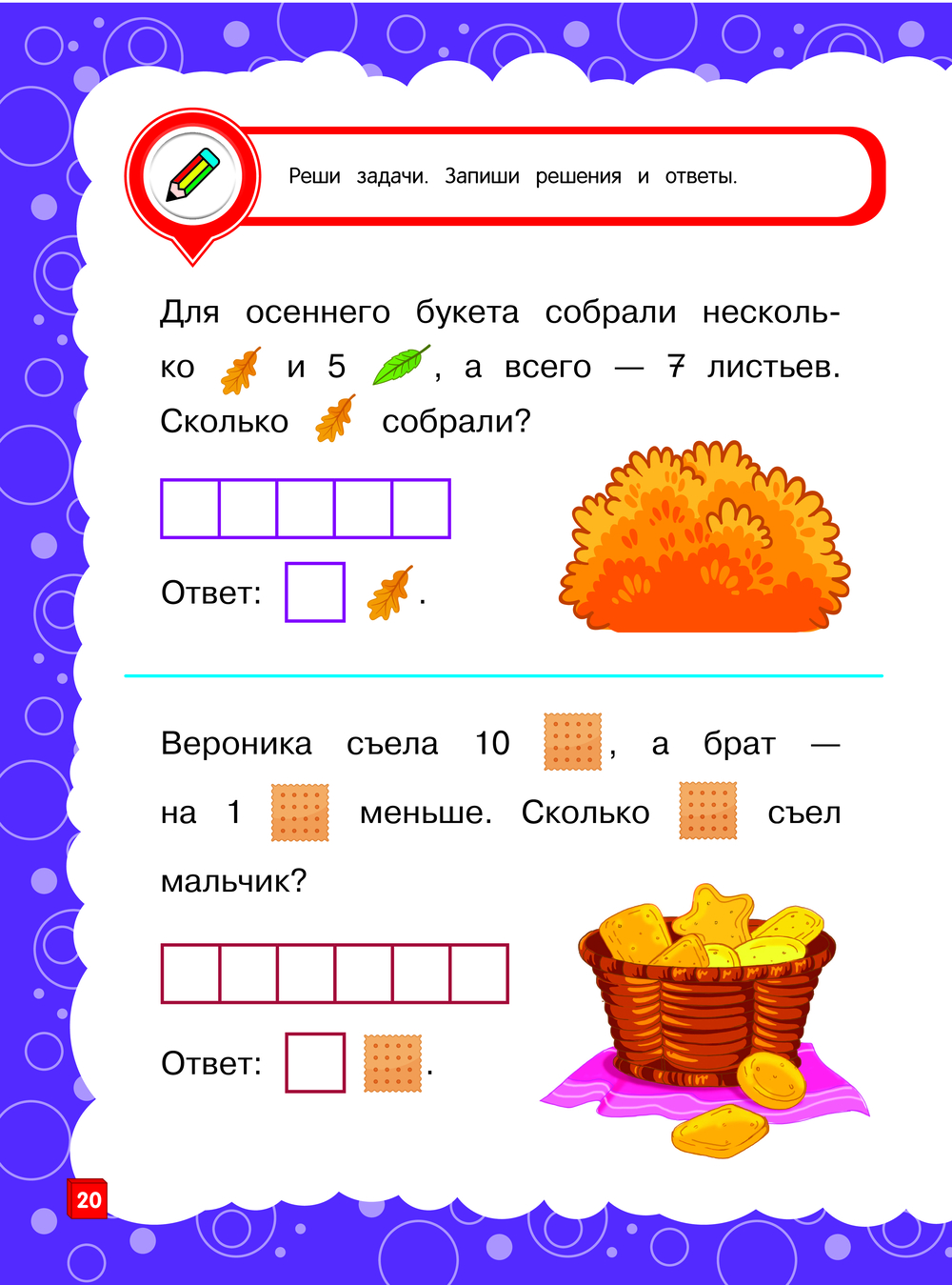 Основная цель пособия – дать ребёнку необходимые знания по базовым темам. Тематика включённых в книгу разделов соответствует ФГОС. Выполняя увлекательные задания, ребенок освоит счет до 20, закрепит навыки решения примеров и задач, чтения и понимания смысла прочитанного; потренируется озаглавливать текст, отвечать на вопросы, пересказывать; будет ориентироваться на листе бумаги; сможет расширить словарный запас и кругозор, развить внимание, память и мышление.