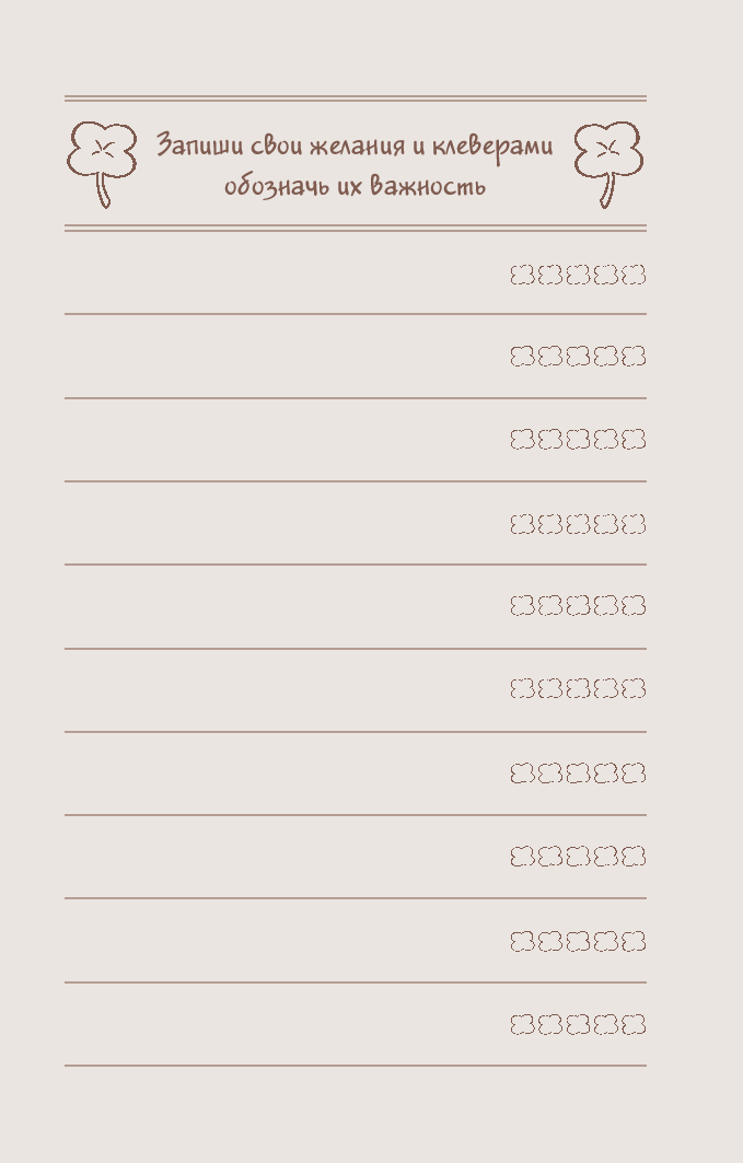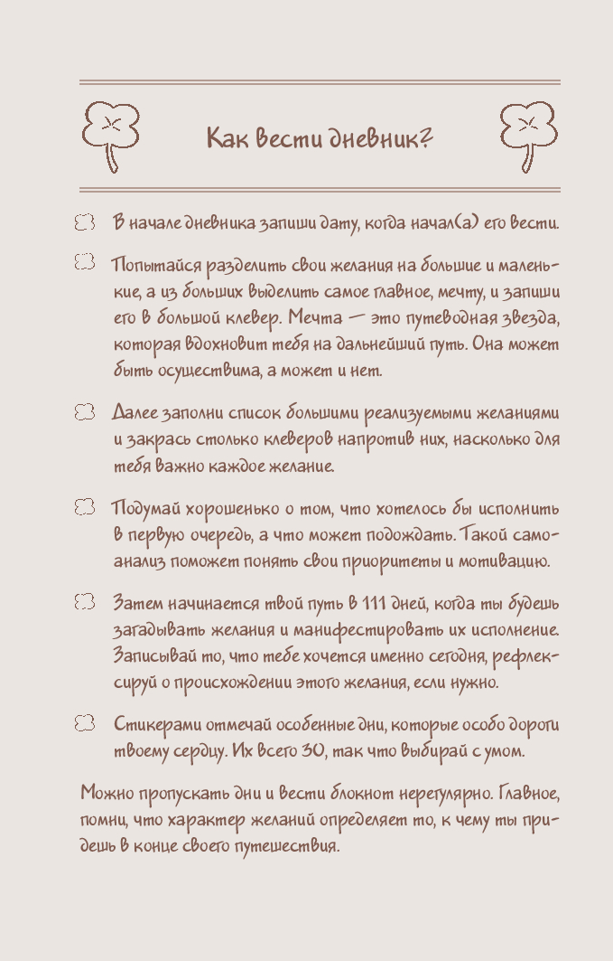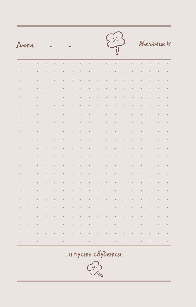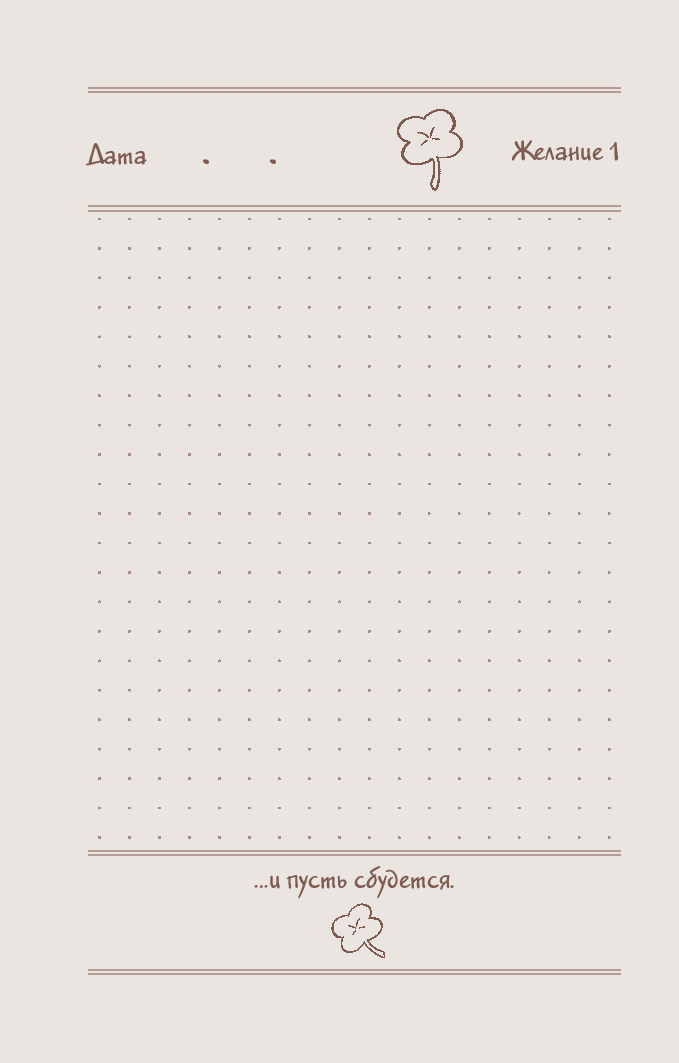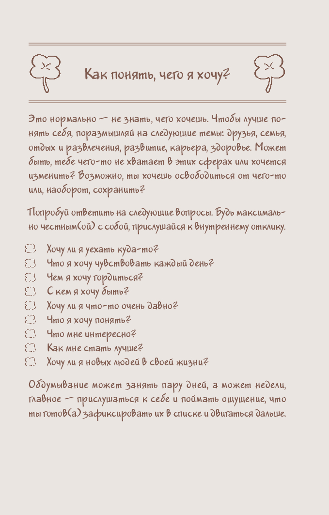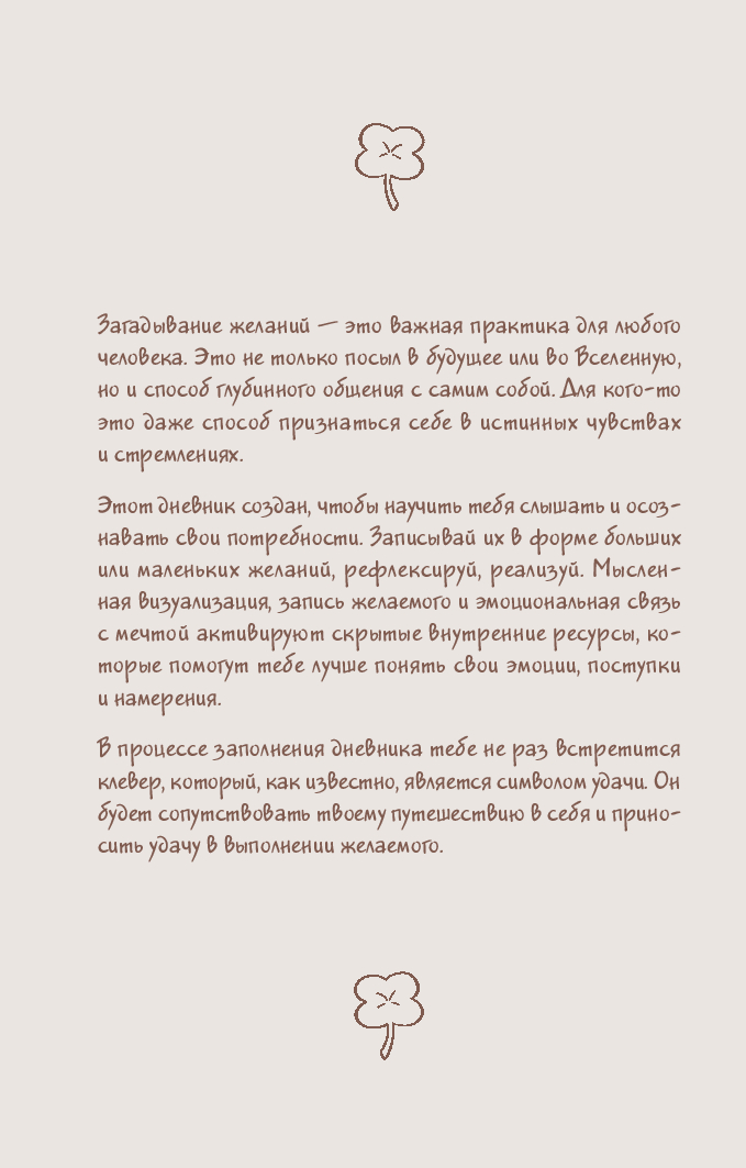 Дневник предлагает окунуться в самопознание через курс терапии желаниями и познакомиться ближе с тем, что кроется глубоко внутри тебя. Он помогает развить осознанность, мотивацию, планирование и укрепить эмоциональное равновесие.