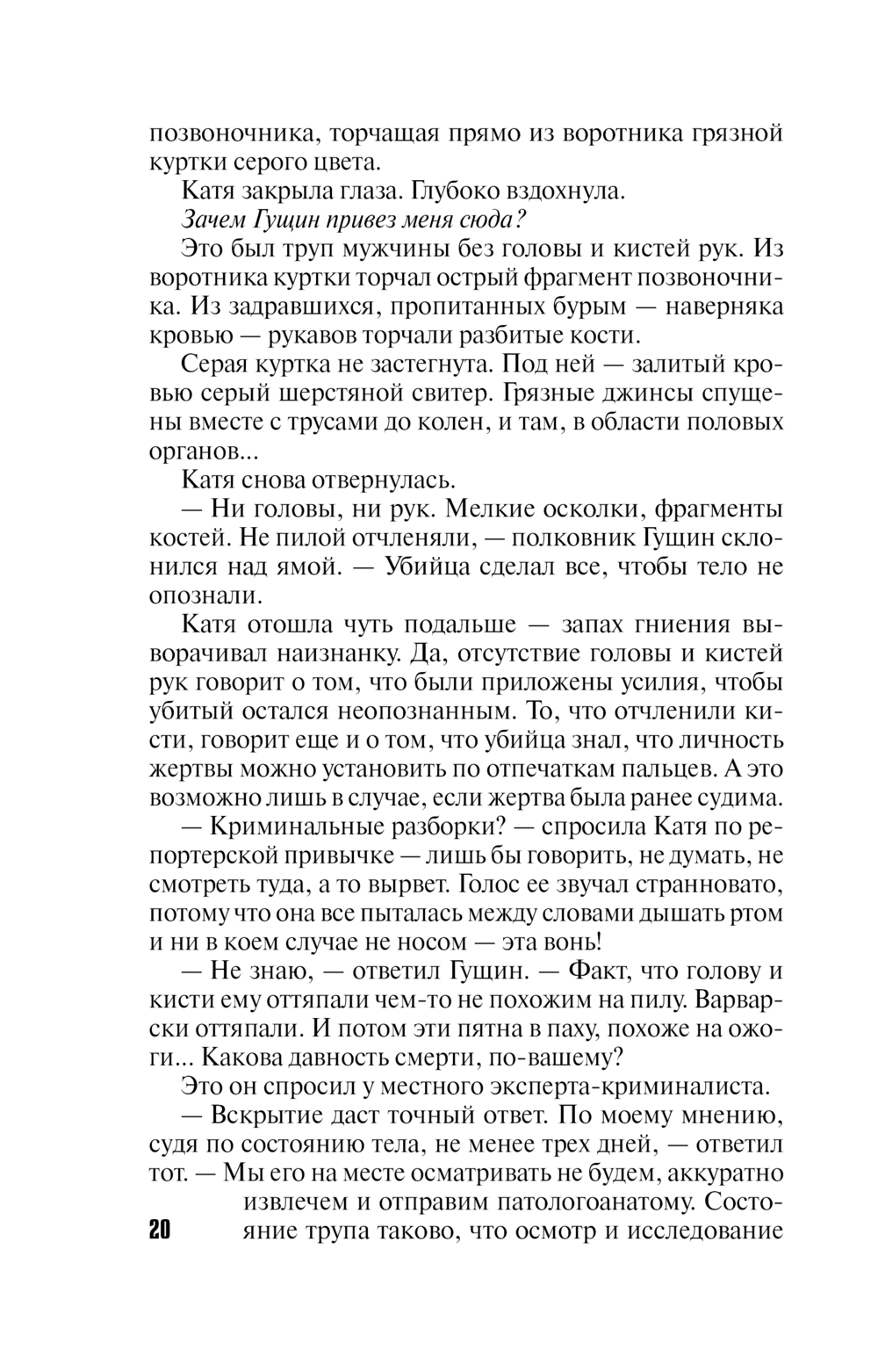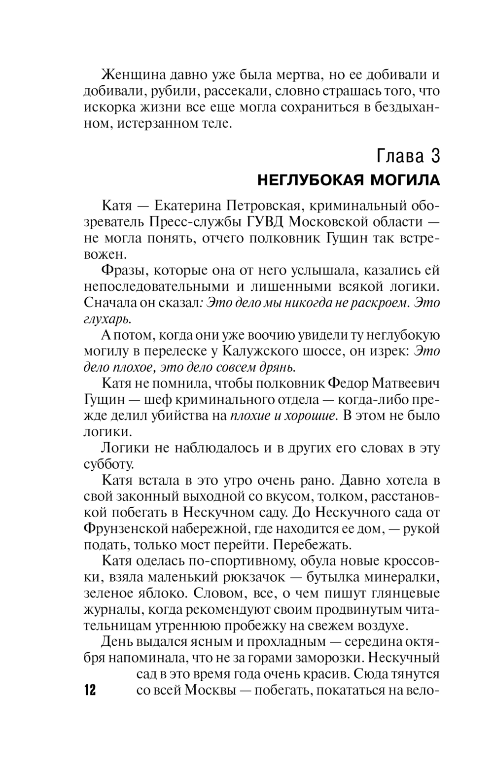 За свою многолетнюю службу в Пресс-центре ГУВД Екатерина Петровская привыкла ко многому. Но ее, как и шефа криминального отдела полиции полковника Гущина, потрясло дело, которое они расследовали на этот раз. В подмосковном лесу обнаружен обезображенный труп мужчины – с отрубленной головой и кистями рук, со следами пыток. Это преступление потянуло за собой цепочку других загадочных убийств, и все они вместе ведут к знаменитым еще со времен Булгакова Патриаршим прудам. Там, в одном из фешенебельных домов, обитает роскошная красавица Регина Кутайсова и ее дочь Пелопея, потерявшая три года назад после аварии память и красоту. Кате и ее новому напарнику Клавдию Мамонтову предстоит узнать и понять, что же такого жуткого произошло три года назад, раз месть оказалась настолько страшна?..
