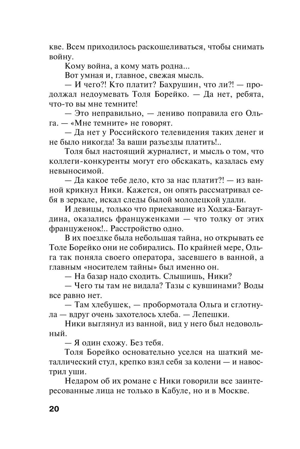 Афган, дикая страна, странная война... Корреспонденты Российского телевидения Ольга Шелестова и Никита Беляев в тот день выехали снимать передовые позиции. На обратной дороге Ольга пересела в машину к коллегам-журналистам, чтобы успеть к эфиру, и бесследно исчезла вместе с ними. В гостиничном номере царил разгром, значит, это не случайное похищение?.. Беляев вернулся в Москву один. Коллеги смотрели косо: как случилось, что он уцелел? Его шеф и Ольгин муж, директор информационных программ канала Бахрушин, вынужден довериться Беляеву. Стало известно, что недавно тайно сняли на видео неуловимого лидера талибов Акбара. Сведения пришли из Парижа, а накануне похищения Ольга получила оттуда посылку, где среди продуктов была и кассета. Потом она пропала. Бахрушин летит в Кабул на поиски жены, а Беляев знакомится с новой ведущей новостей красавицей Алиной Храбровой. Он бросается ей на выручку – ее грозятся убить, если она не уберется с канала...