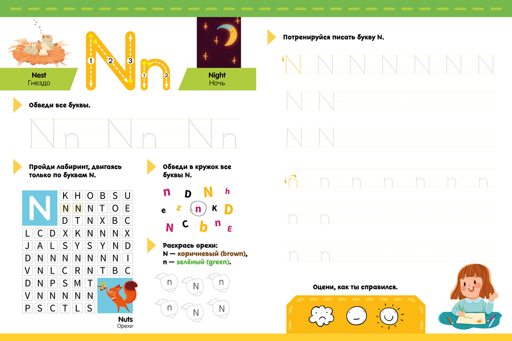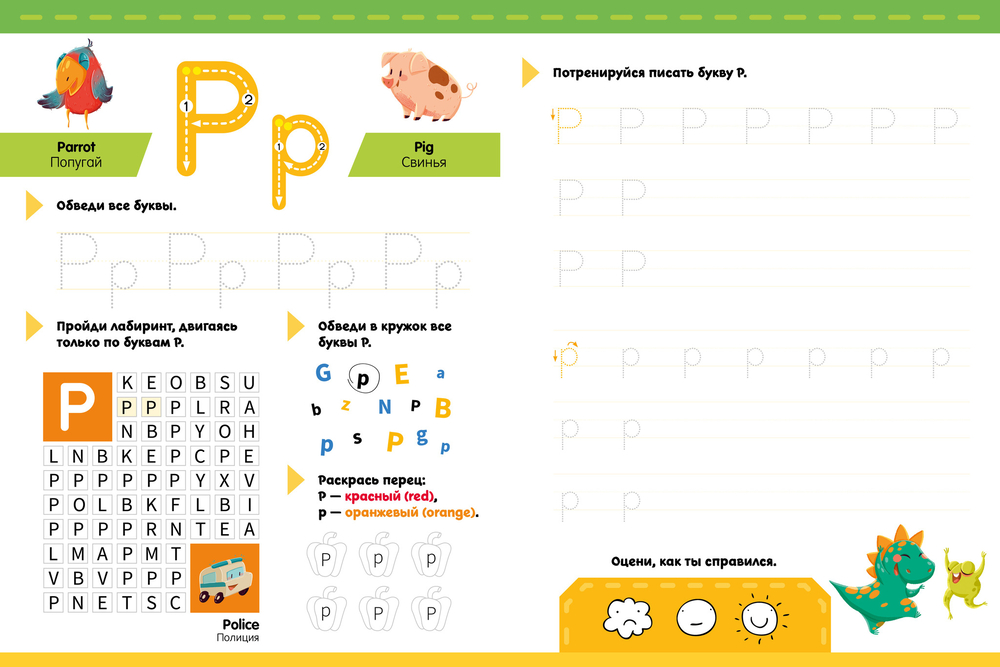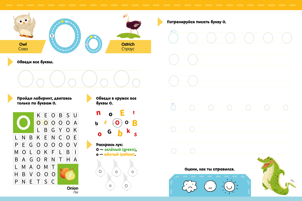 С чего начать веселое и увлекательное знакомство с английскими буквами? Английские прописи – яркая и веселая книга, которая поможет дошкольнику подготовить руку к письму и одновременно выучить английский алфавит, познакомиться с числами до 10, а также пополнить словарный запас новыми английскими словами.