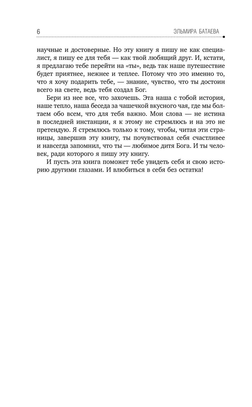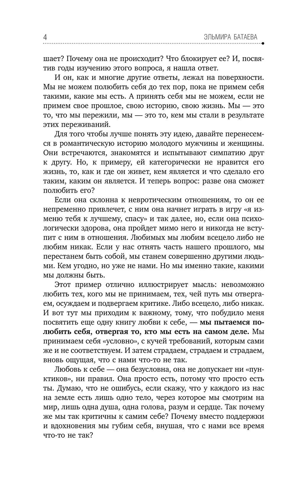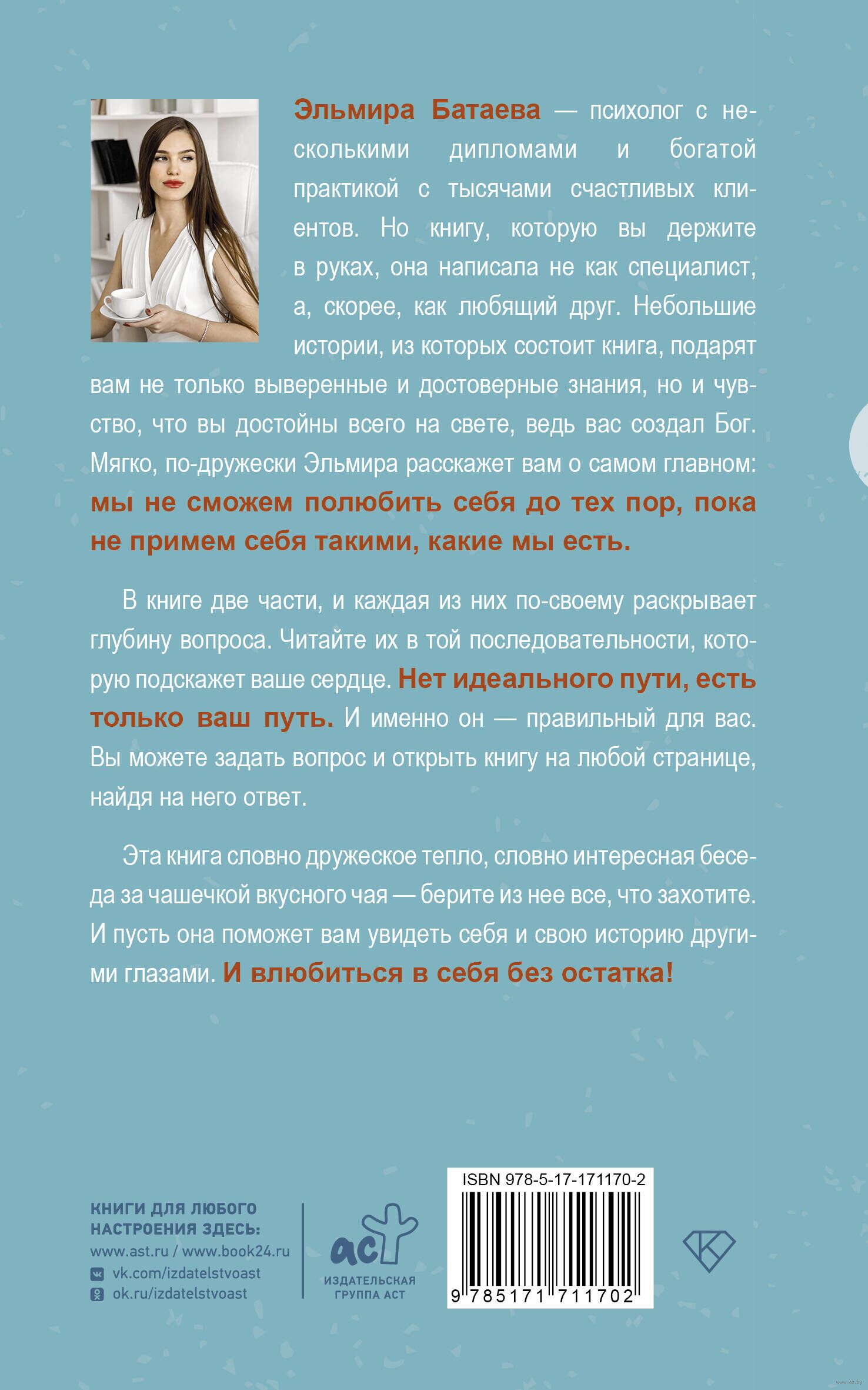Эльмира Батаева – психолог с несколькими дипломами и богатой практикой с тысячами счастливых клиентов. Но книгу, которую вы держите в руках, она написала не как специалист, а, скорее, как любящий друг. Небольшие истории, из которых состоит книга, подарят вам не только выверенные и достоверные знания, но и чувство, что вы достойны всего на свете, ведь вас создал Бог. Мягко, по-дружески Эльмира расскажет вам о самом главном: мы не сможем полюбить себя до тех пор, пока не примем себя такими, какие мы есть.