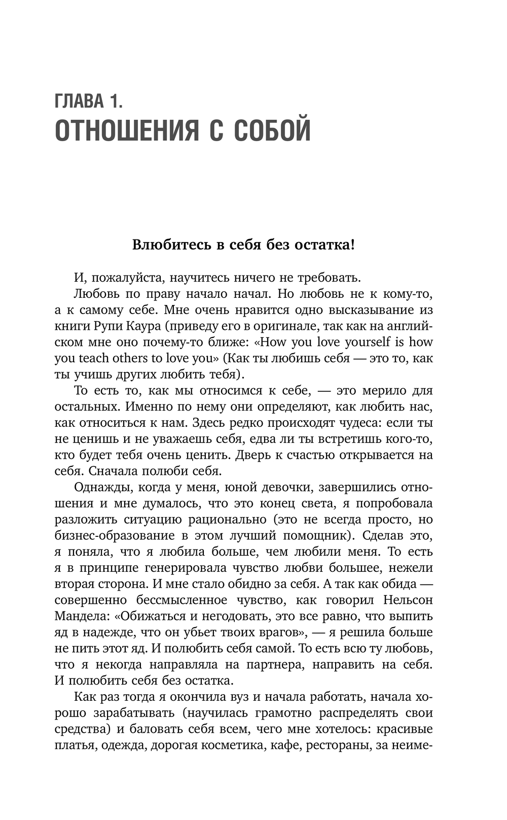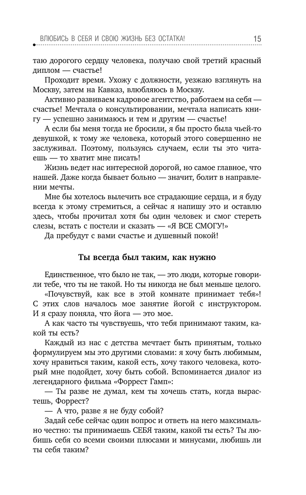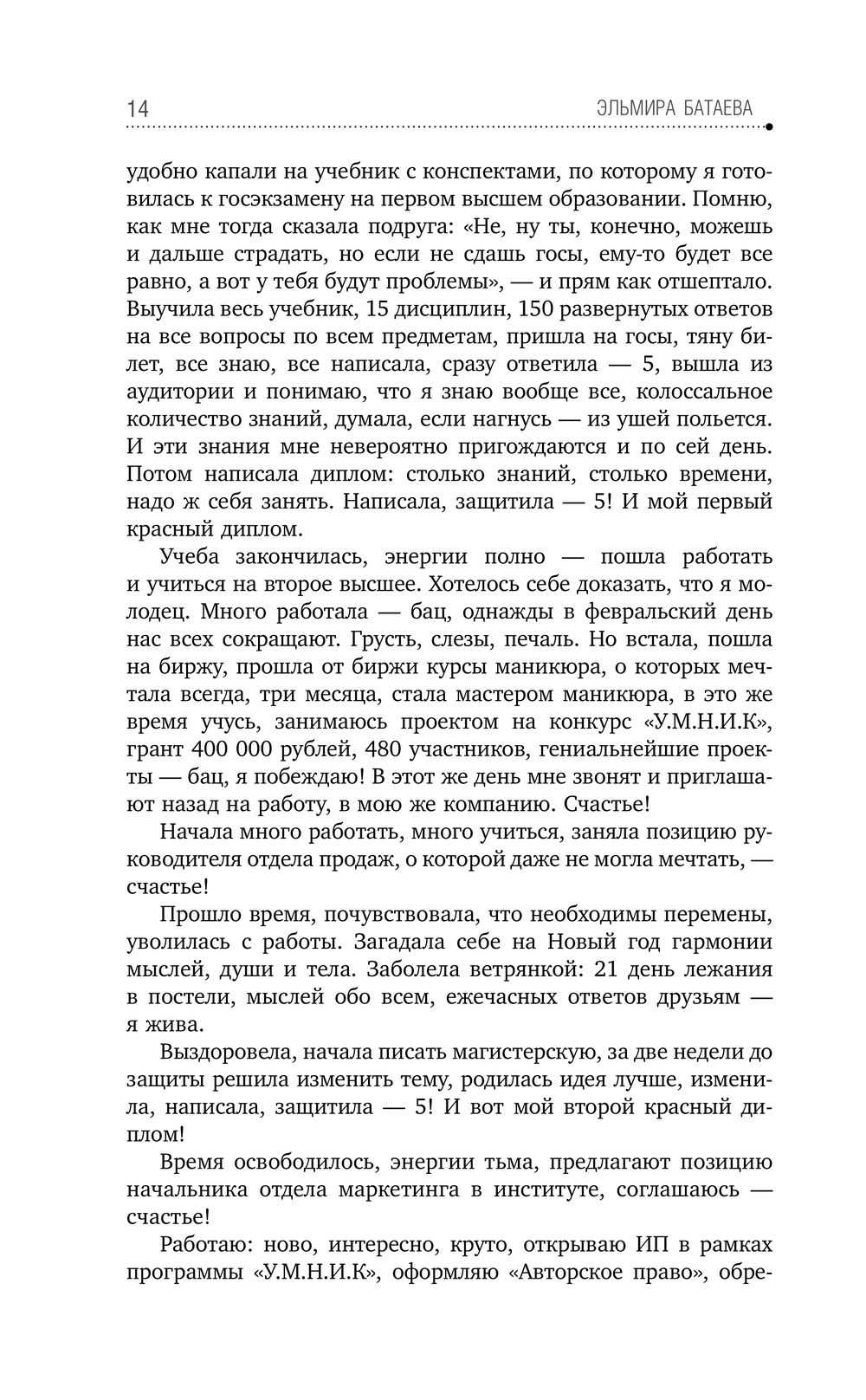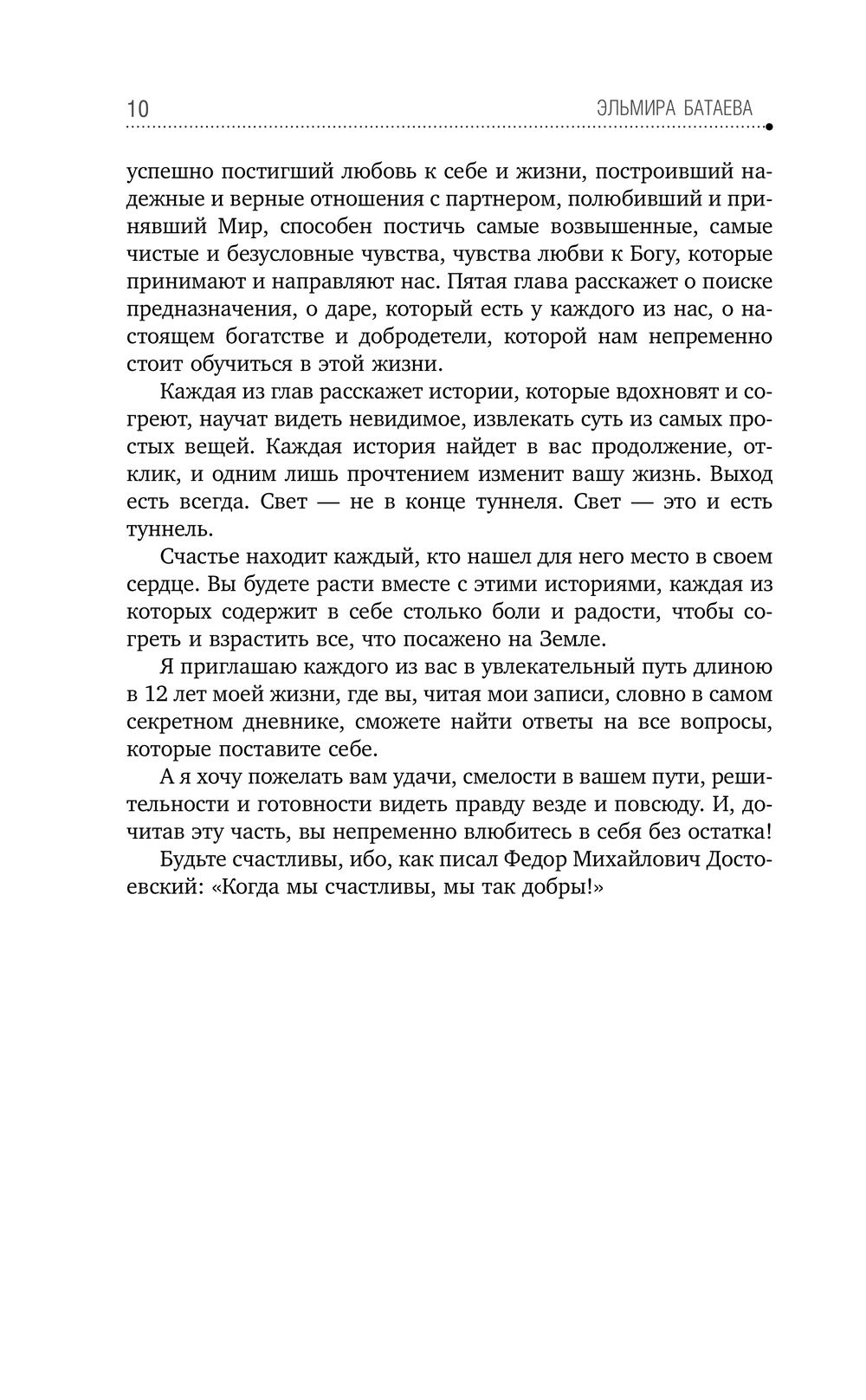 Эльмира Батаева – психолог с несколькими дипломами и богатой практикой с тысячами счастливых клиентов. Но книгу, которую вы держите в руках, она написала не как специалист, а, скорее, как любящий друг. Небольшие истории, из которых состоит книга, подарят вам не только выверенные и достоверные знания, но и чувство, что вы достойны всего на свете, ведь вас создал Бог. Мягко, по-дружески Эльмира расскажет вам о самом главном: мы не сможем полюбить себя до тех пор, пока не примем себя такими, какие мы есть.