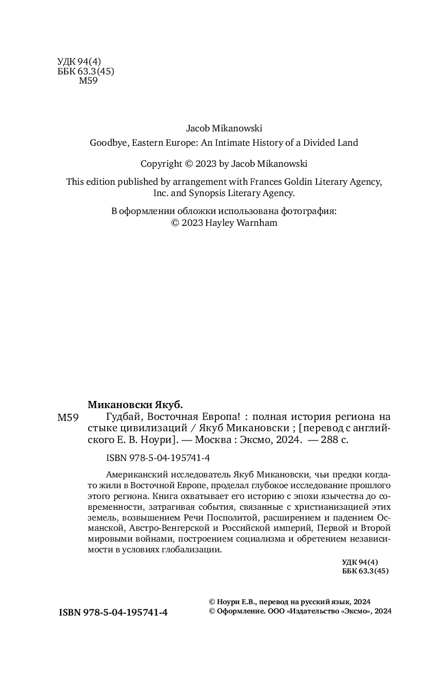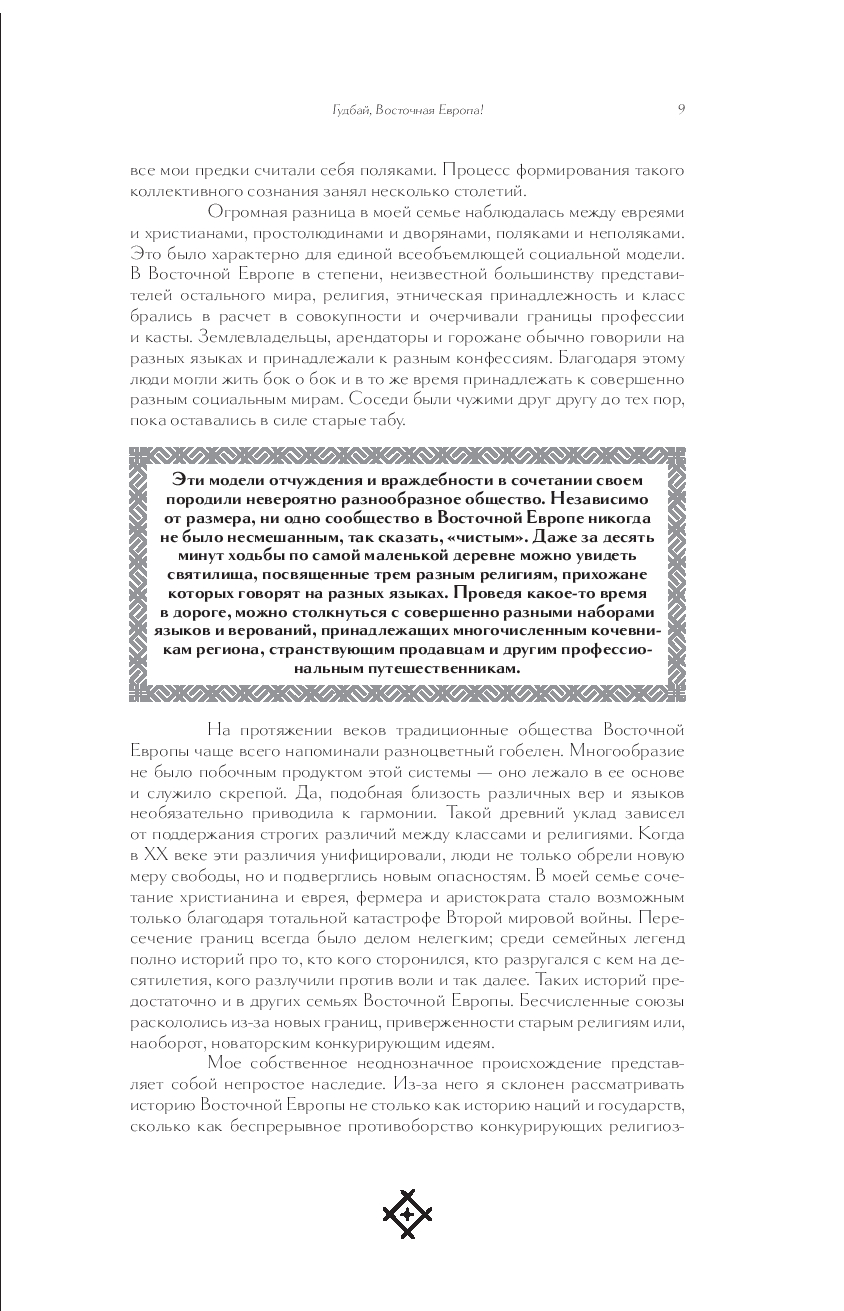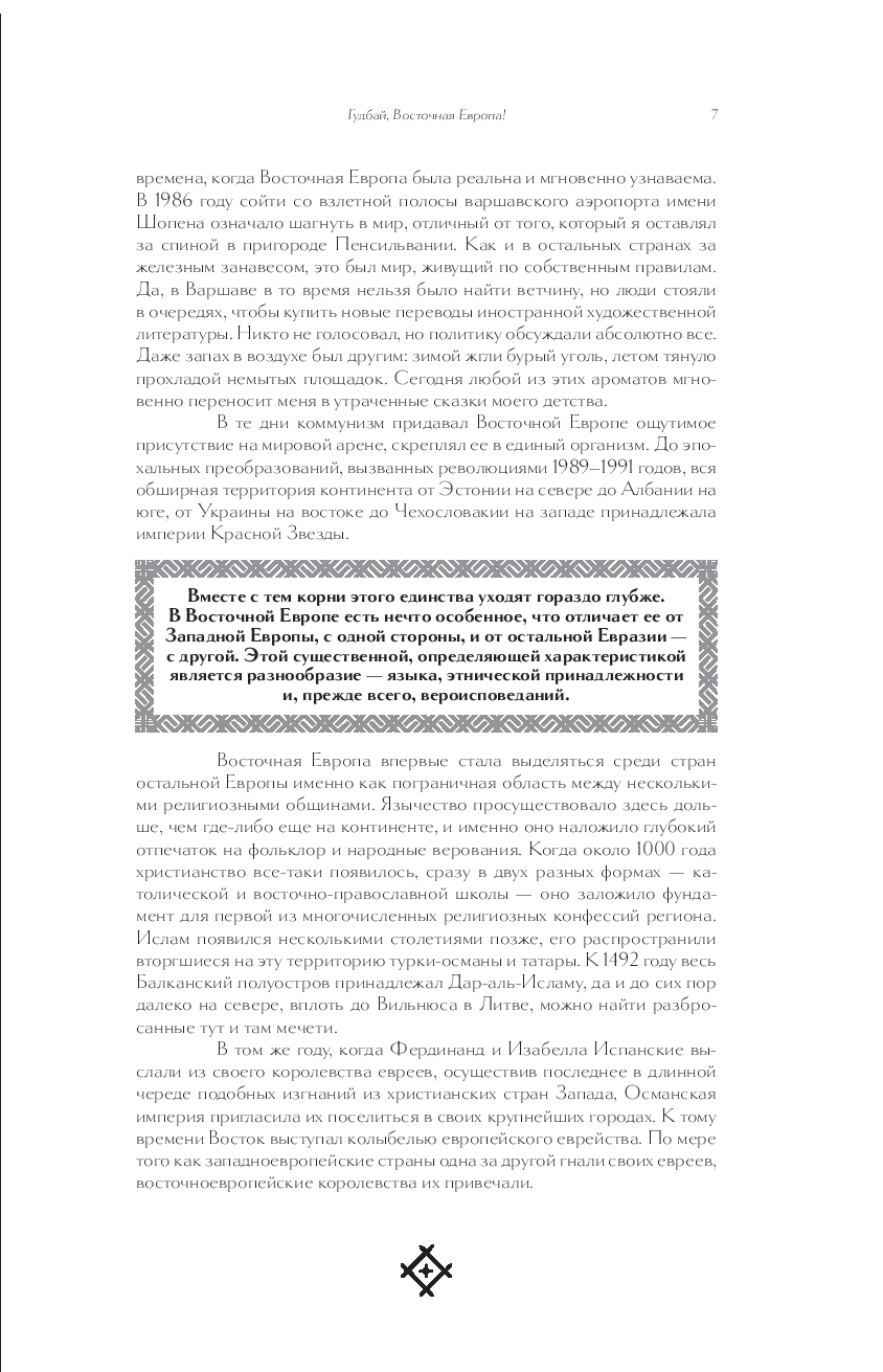Слишком экономное издание... 1) Очень мелкий шрифт, очень неудобно читать. 2) Половина страниц буквы не черные, а серые, чтобы еще более усложнить читателю жизнь. 3) Нет научного редактора. Поэтому на страницах книги можно встретить "рыцарей Нерона" (стр. 15), литовских герцогов (стр. 33), графов Радзивиллов вместо князей (стр. 77), живущих в долине Днестра филиппинцев вместо старообрядцев филипповцев (стр. 107), черную и апельсиновую икру (стр. 164, наверное, красную икру, но Гугл-переводчик знает лучше) и т.д. 4) Слишком оригинальная верстка - по всему тексту разбросаны цитаты жирным шрифтом в толстых черных рамочках - сплошные "некрологи". Очень пугает. Хотя, название книги "Гудбай, Восточная Европа!" обязывает выдержать трагический тон. При этом сам текст увлекательный, автор в теме и глубоко сопереживает тем, о ком он пишет. Только к "полной истории региона" это не имеет никакого отношения. А вот в качестве примера того, как американцы видят и понимают этот регион, книга не имеет себе равных на русском языке. Кстати, автор завершил сбор материала в 2021 г., издал на английском в 2023 г., а в 2024 г. уже есть русское издание. Спасибо! Поскольку покупал для работы - остался очень доволен, но так издавать книги серьезному издательству нельзя. Короче, "пирожок горячий и вкусный", но "упаковка" никуда не годится.