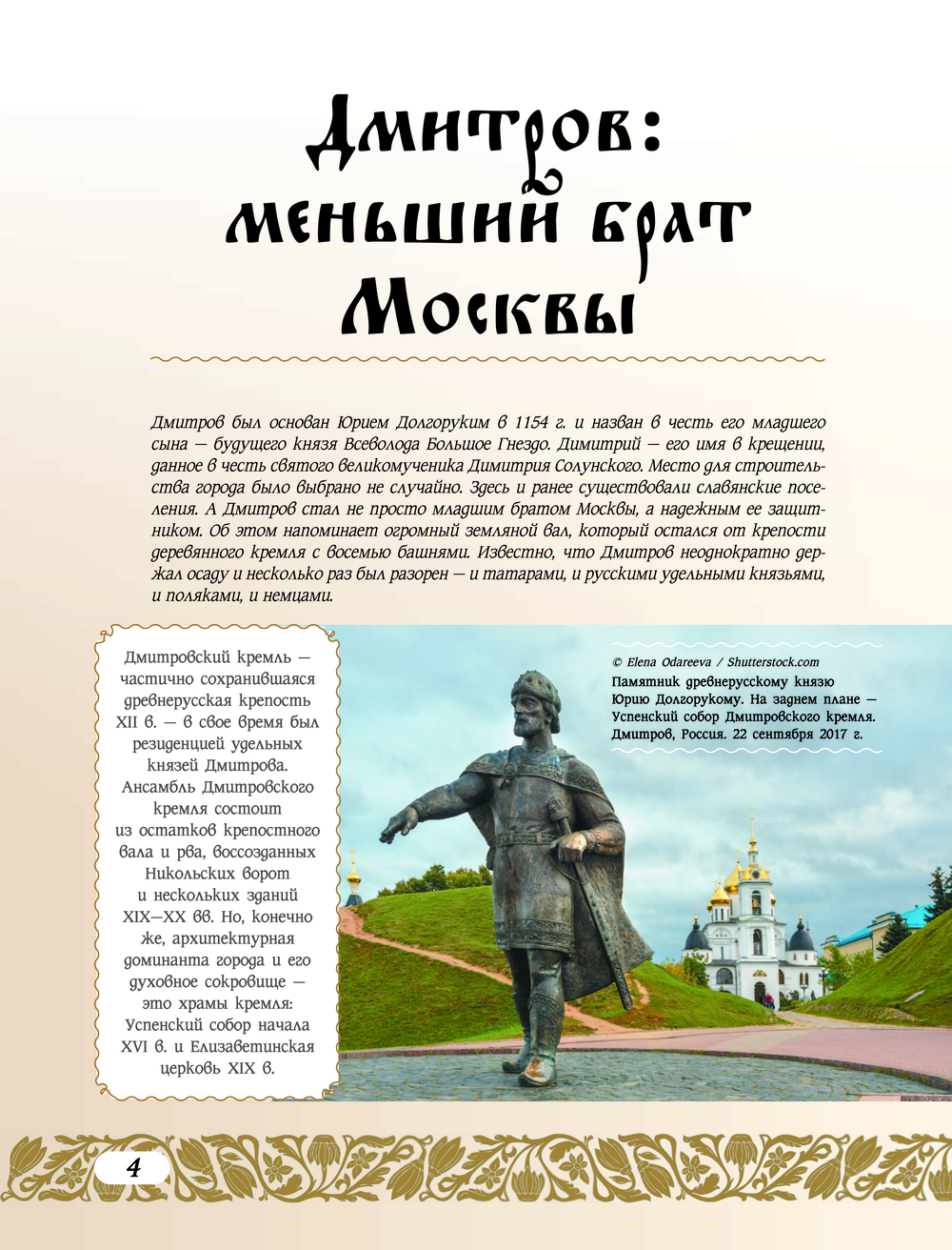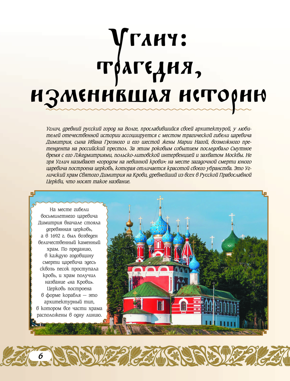 Эта книга содержит очерки о тех памятных местах и знаменательных событиях отечественной истории, которые век за веком формировали могущественное и независимое Российское государство. Она станет надежным проводником для тех, кто хочет глубже понять историческое и культурное наследие нашего Отечества. Вы познакомитесь с Дмитровом – "младшим братом Москвы" и Псковом – "Ольгиным градом", исследуете трагические страницы прошлого в Угличе и героические в Кронштадте и Выборге, узнаете, почему Нижний Новгород называли "купеческим карманом России", а Невьянск – "дедушкой уральских заводов". Вы сможете открыть для себя величие многих русских храмов и монастырей, например, Успенского собора в Москве, где короновались российские императоры, и Спаса на Крови в Санкт-Петербурге, ставшего музеем-памятником в честь трагической гибели Александра II, а также Ипатьевской обители, названной колыбелью династии Романовых, и Троице-Сергиевой лавры, именуемой духовным щитом Руси.