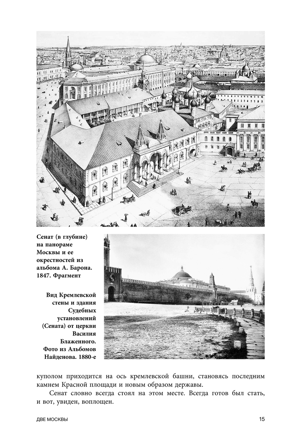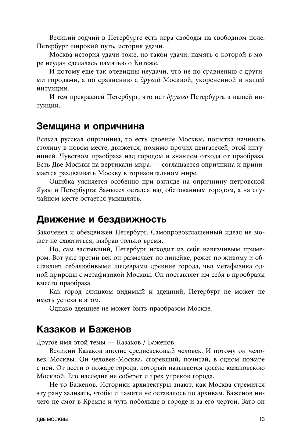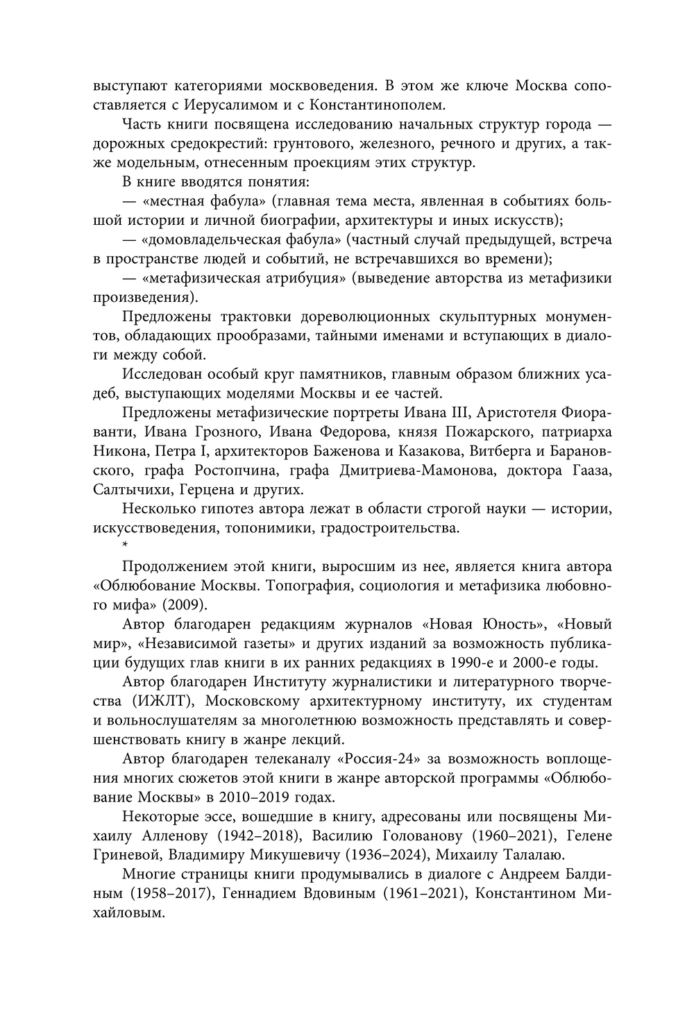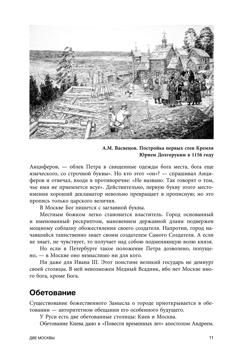 Сравнивая ее с Римом, Иерусалимом, Константинополем, а также с Петербургом и другими русскими городами, он видит Москву как чудо проявления Высшего замысла, воплощаемого на протяжении многих веков в событиях истории, в художественных памятниках, в городской топографии, в символическом пространстве городских монастырей и бывших загородных усадеб. Во временах Московского Великого княжества и Русского царства, в петербургскую эпоху и в XX столетии. В деяниях Ивана Калиты и святого митрополита Петра, Ивана III и Ивана Грозного, первопечатника Ивана Федорова и князя Пожарского, Петра I и Екатерины II, зодчих Баженова и Казакова и многих других героев первой книги.