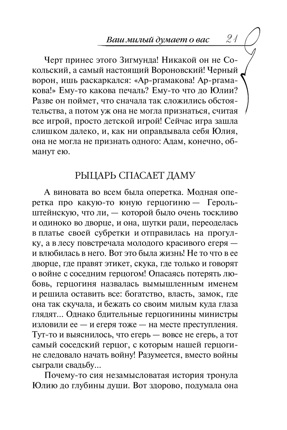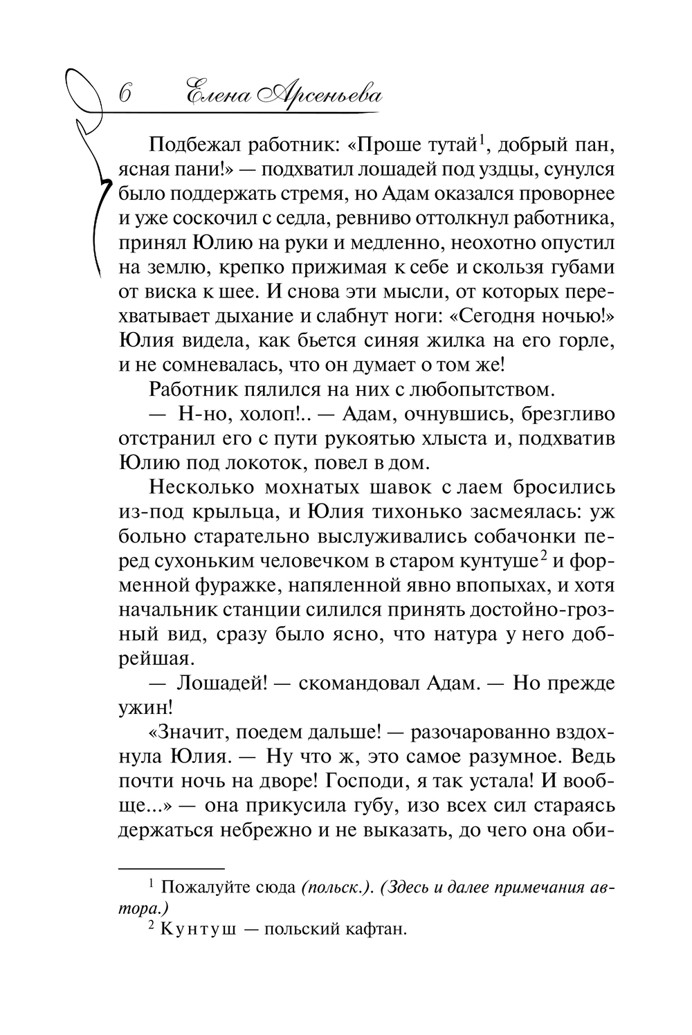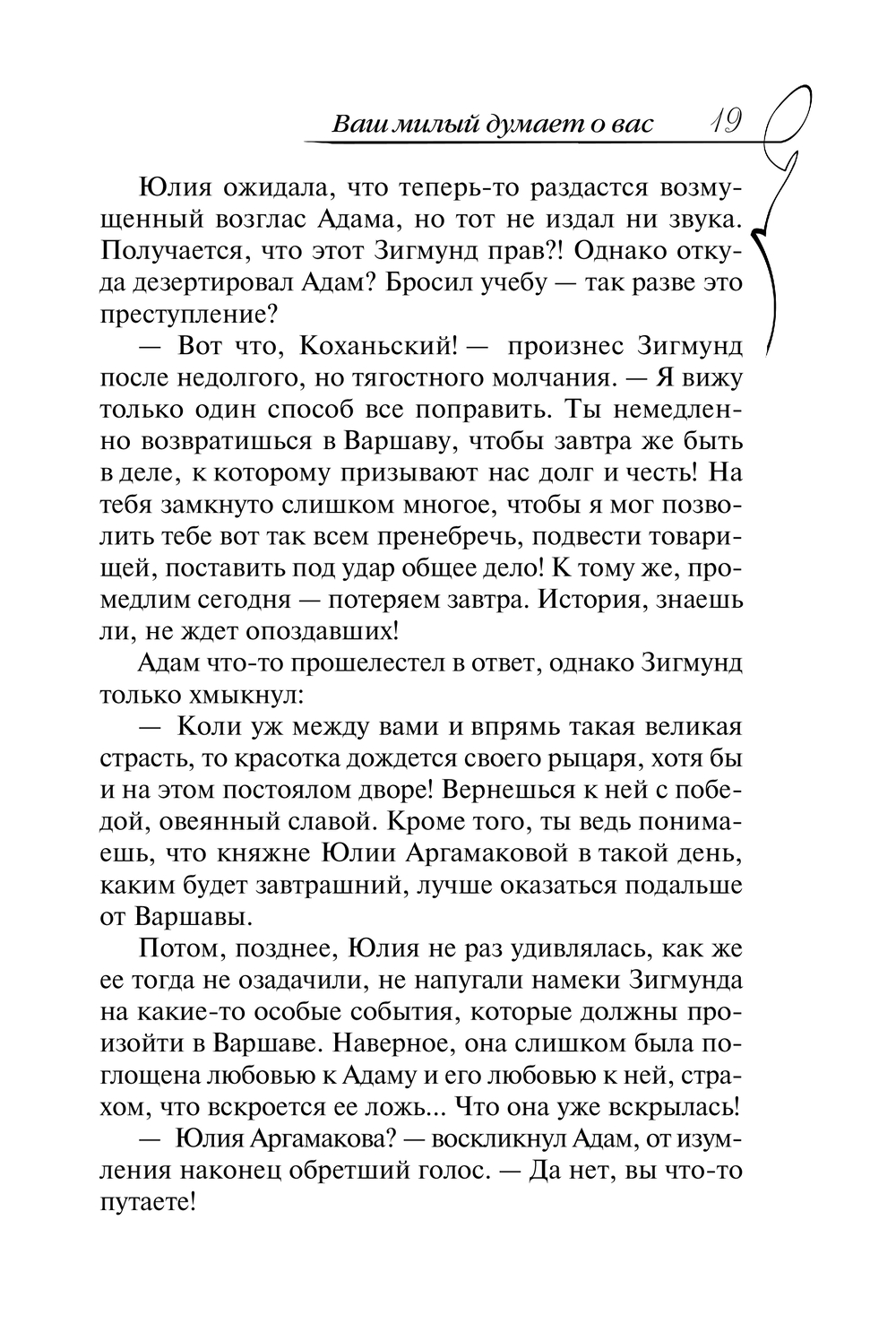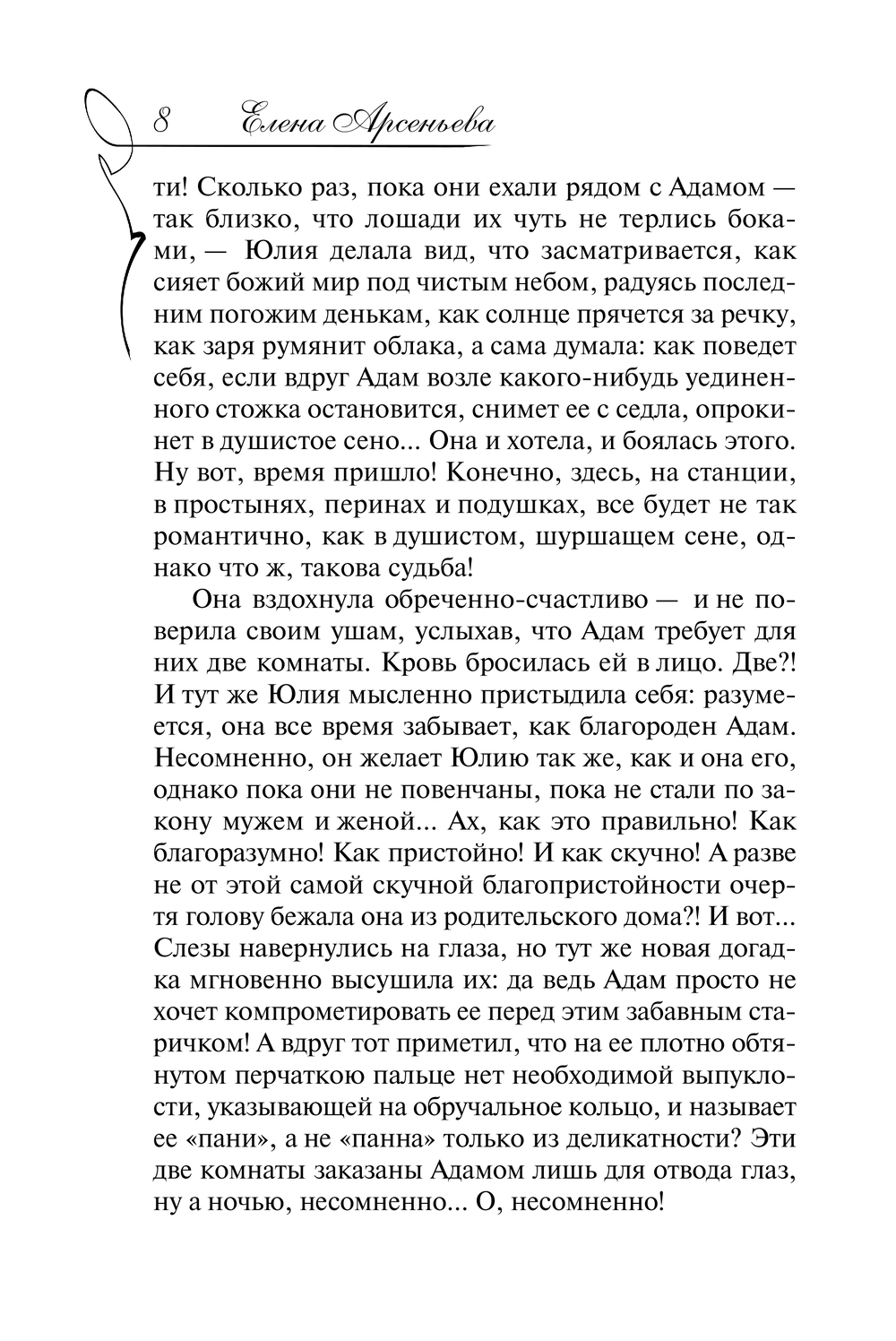 "Ваш милый думает о вас, а все страдания закончатся венчанием". Вот что запомнила из гадания Юлия Аргамакова. Но кто он, этот милый? Сладкий красавчик Адам, с которым Юлия бежала из родительского дома и собиралась выйти за него замуж, быстро разочаровал. А все мысли и чувства захватил Зигмунд Сокольский, с которым она провела роковую ночь, перевернувшую судьбу девушки. Теперь Юлия в плену страсти. Но Зигмунд пропал – ведь разгорелось Польское восстание, гибнут русские люди, целостность страны под угрозой, а он офицер. Вот только какой армии? Он свой или враг?..