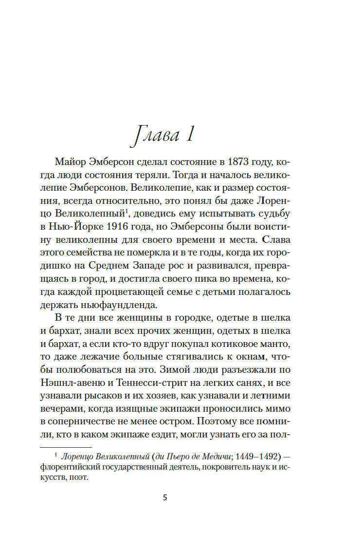 "Великолепные Эмберсоны" – один из самых прославленных американских романов начала XX века, удостоенный Пулицеровской премии, история крушения богатой семьи, беззаветной любви и жестокого высокомерия. Главный герой книги – Джордж Эмберсон, последний отпрыск могущественного рода, эгоистичный, избалованный юноша, готовый принести в жертву своей гордости чувства самых близких людей. Однако грядет его падение: почтенный мир элегантных особняков, конных экипажей и богатых землевладельцев уходит в прошлое, уступая место многоквартирным домам, машинам и ушлым дельцам. Только любовь остается равнодушной к смене времен, лишь она одна способна спасти утратившего "великолепие" Джорджа Эмберсона.