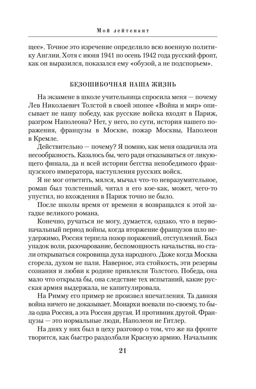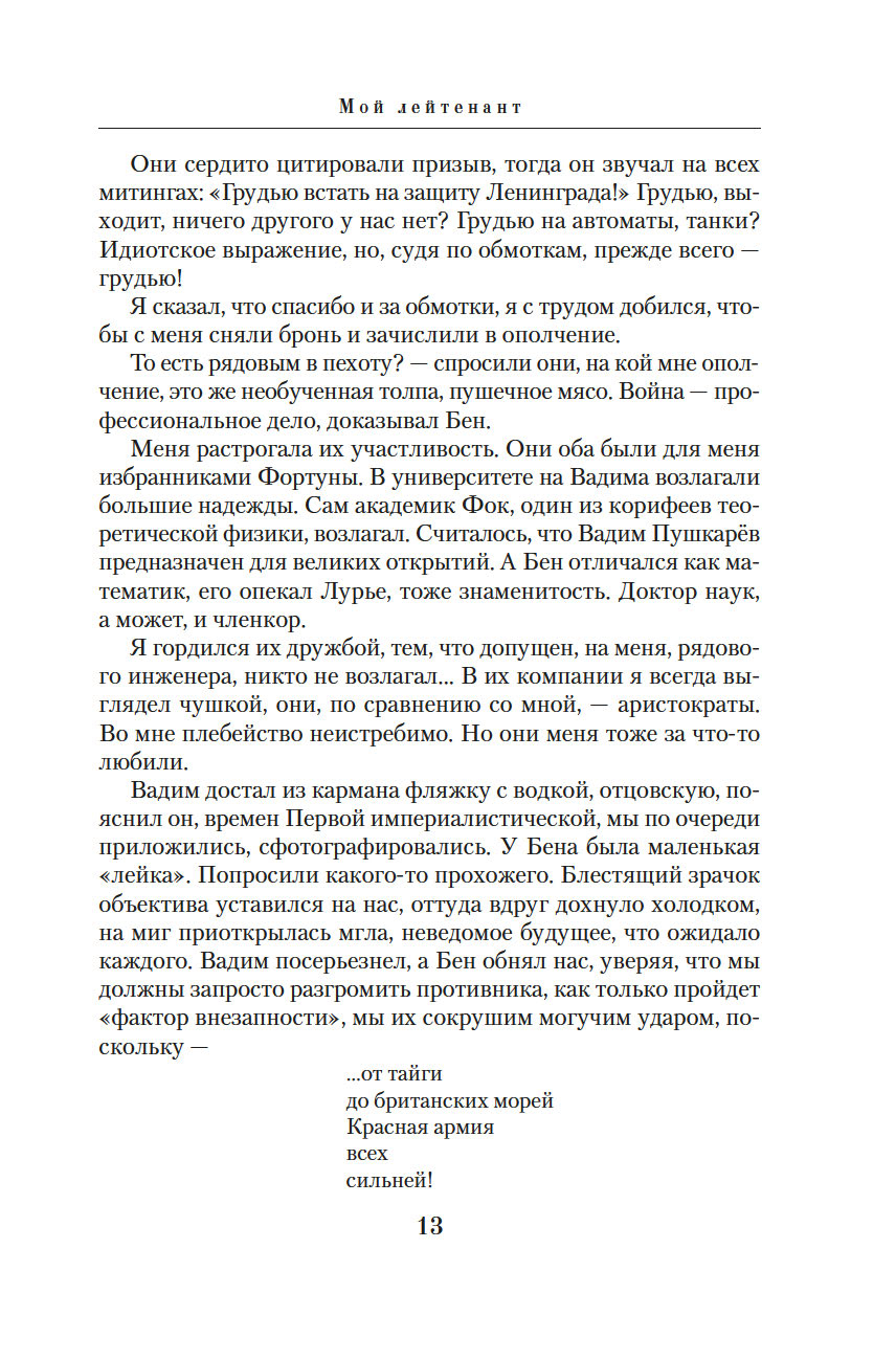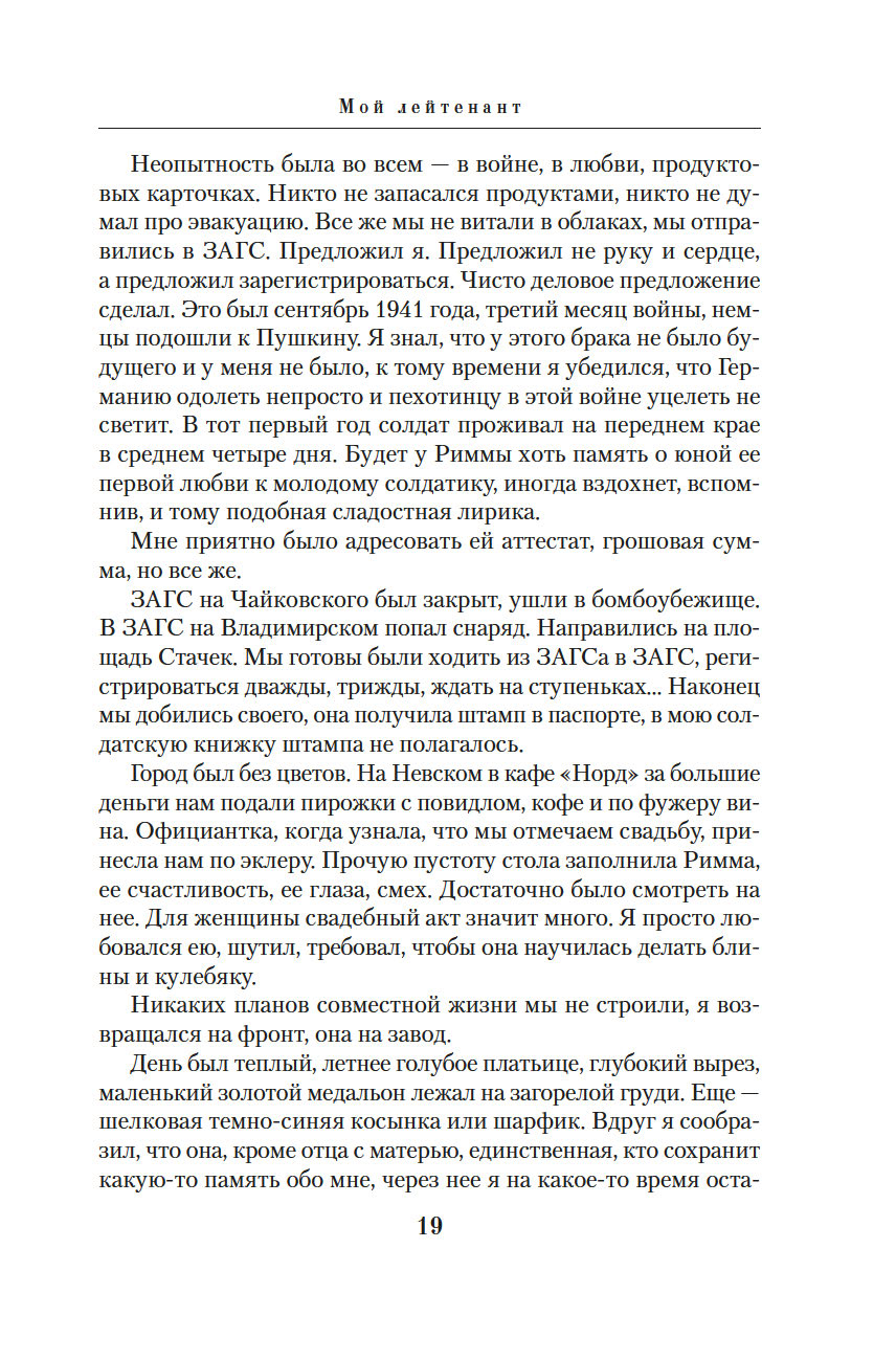 Роман "Мой лейтенант", предлагаемый вниманию читателей, увидел свет в 2011 году и был удостоен национальной премии "Большая книга". По признанию критиков, "Мой лейтенант" расширил каноны военной прозы и стал "последним романом, где есть правда о войне" (Б. Аверин). В нем рассказана история солдата, одного из тех, кто во время Великой Отечественной войны сражался на подступах к Ленинграду. Оглядываясь на прошлое, повествователь с удивлением вспоминает себя, лейтенанта Д., молодого мечтателя, поступки которого не всегда понятны нынешнему "лейтенанту Д.", alter ego автора.