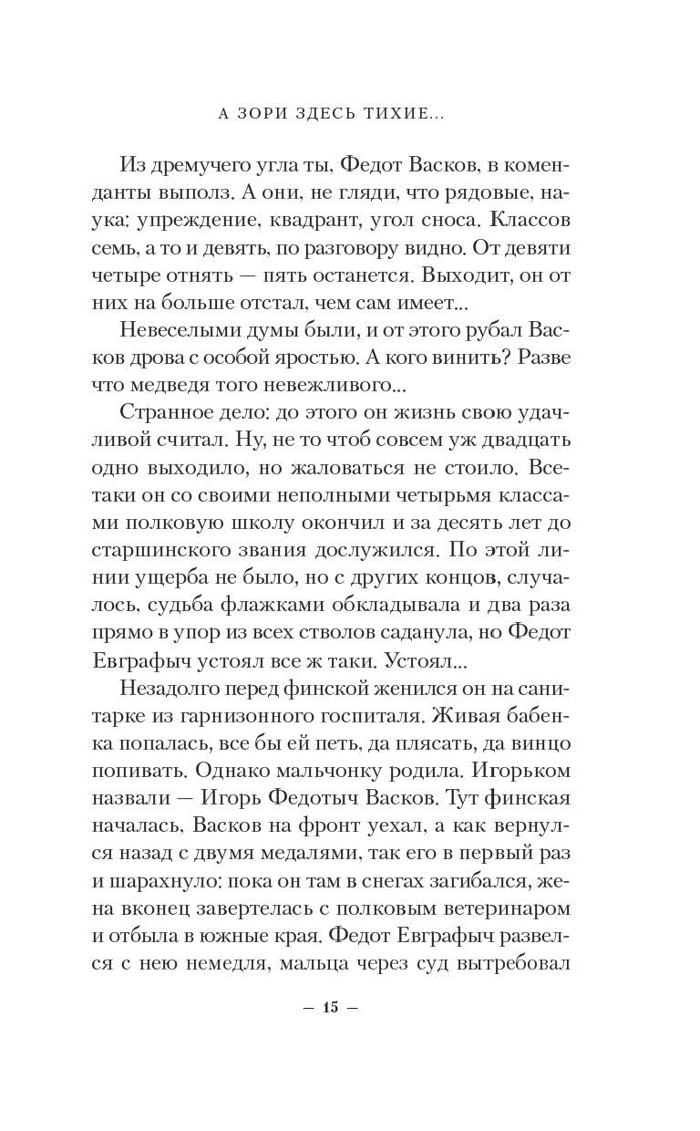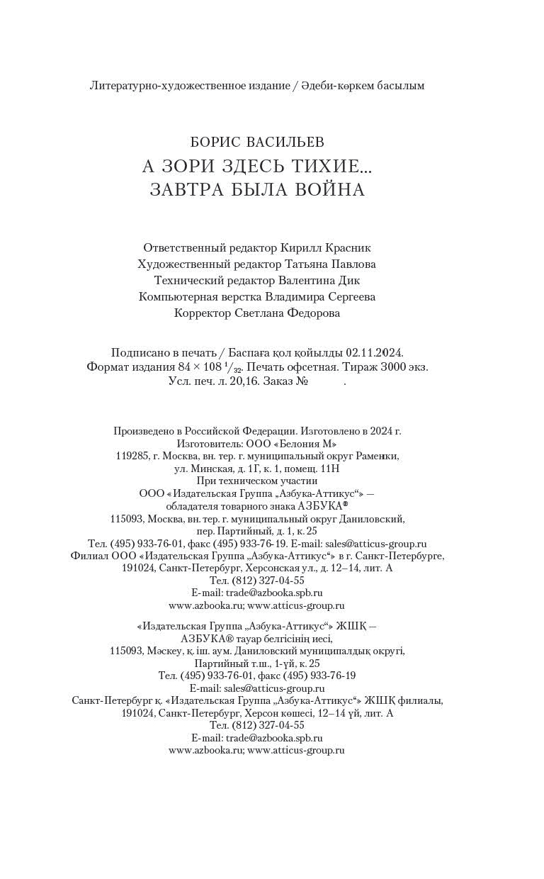 В настоящее издание вошли повесть "А зори здесь тихие..." и роман "Завтра была война", представляющие характерные особенности многогранной васильевской прозы: философские размышления, романтичность и нежность, иронию, прозорливость, мужество и бескомпромиссность в поисках истины.
