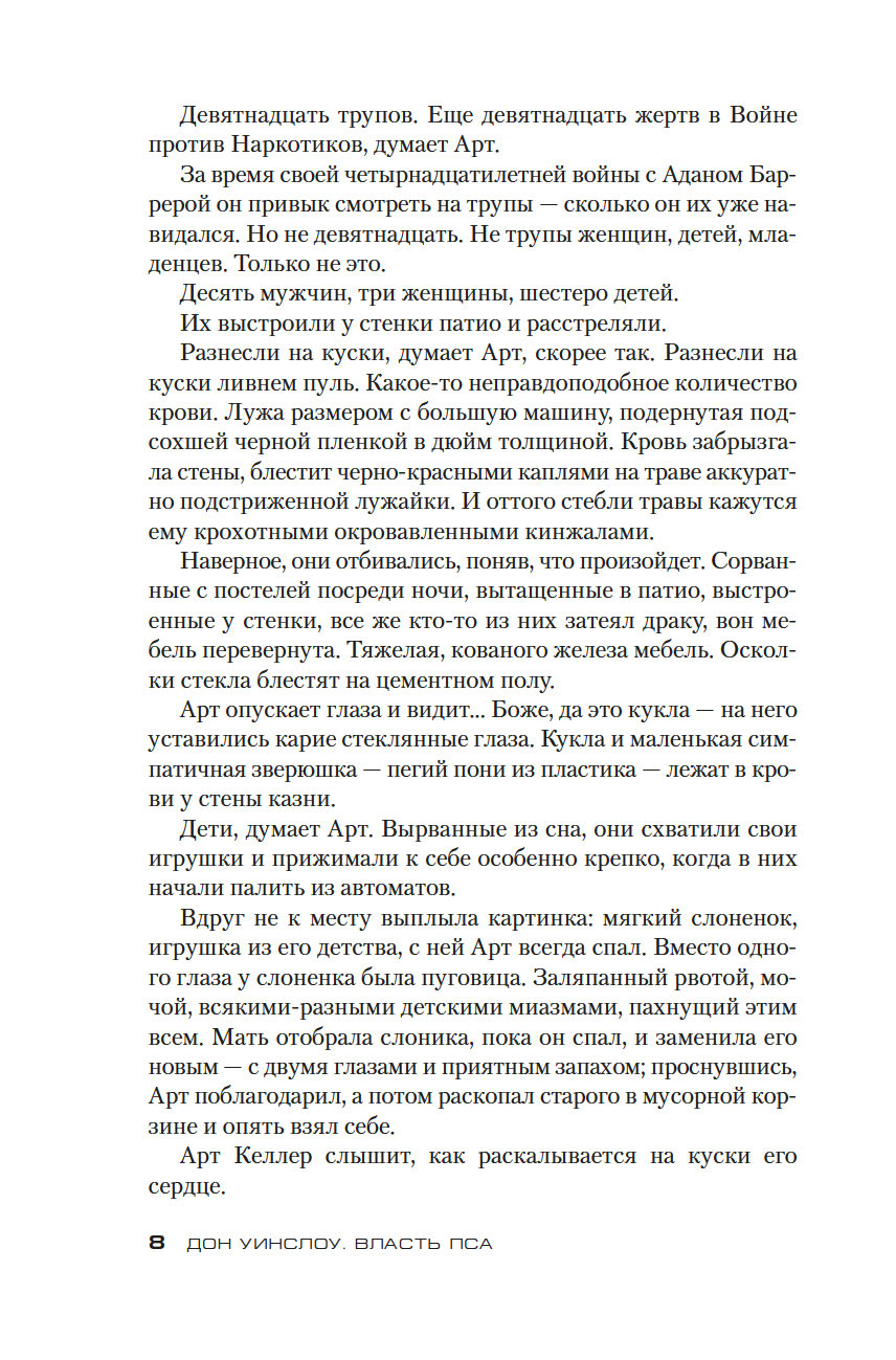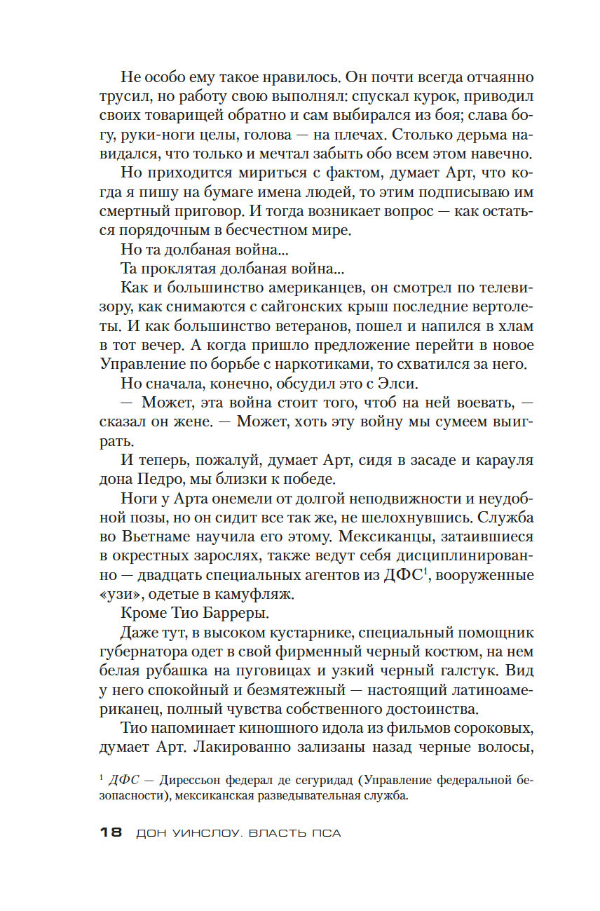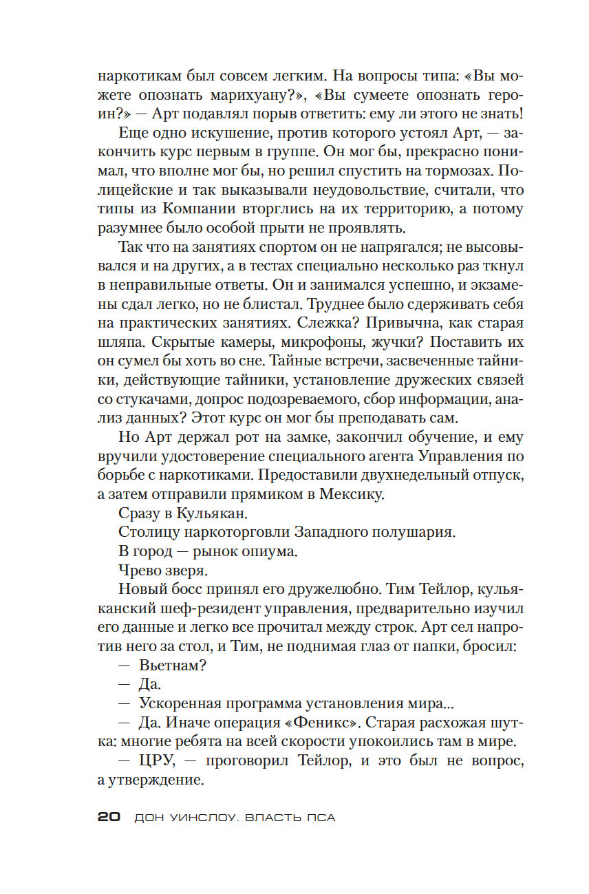 "Власть пса" – история жестокой и кровавой войны с международной наркопреступностью, растянувшаяся во времени почти на полвека и охватившая в пространстве огромную территорию от Мексики и Южной Америки до Китая и Ватикана.