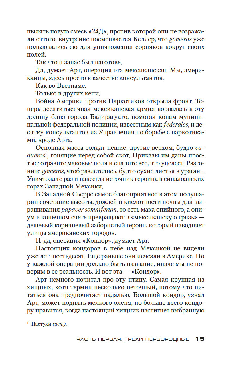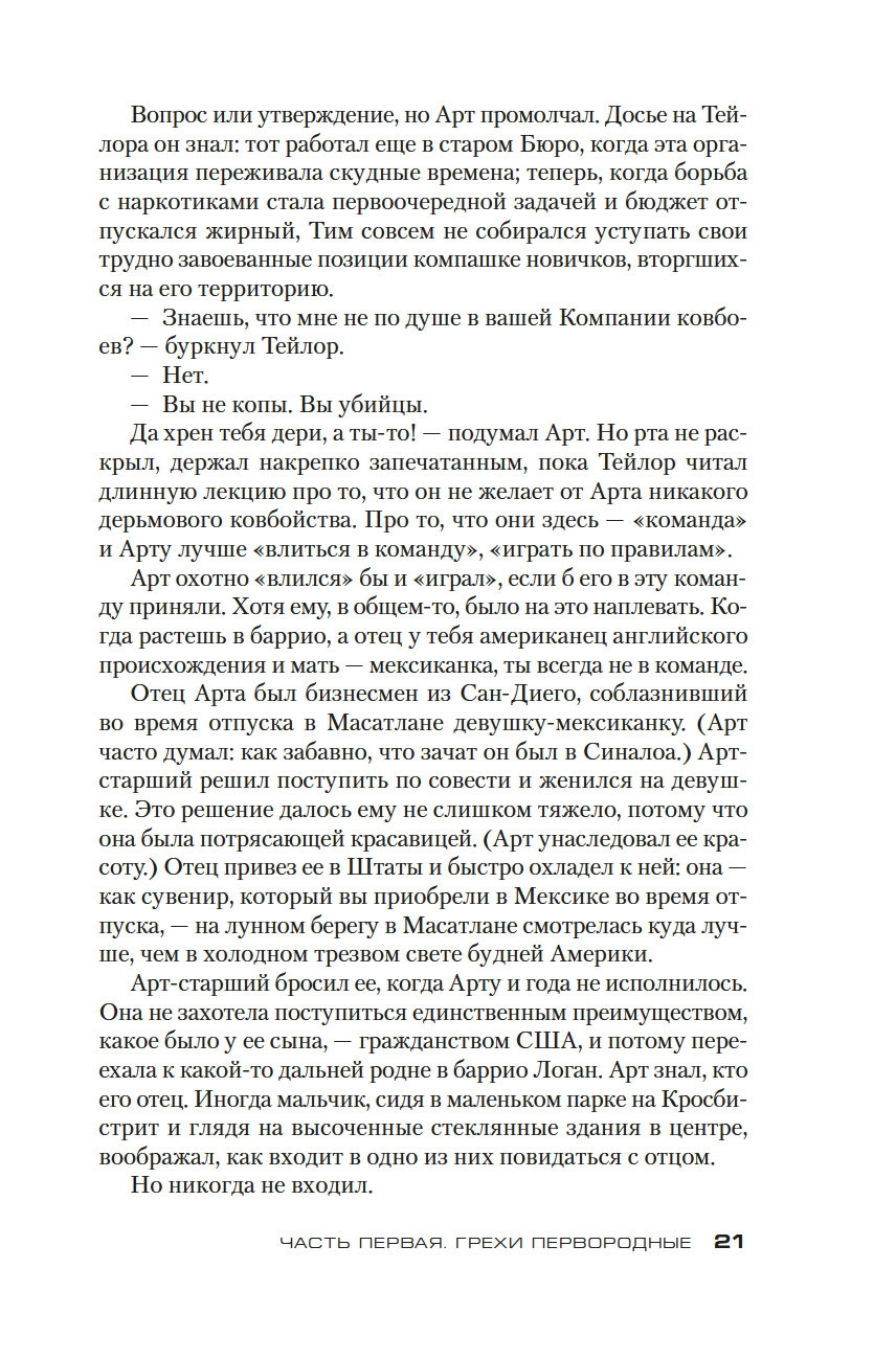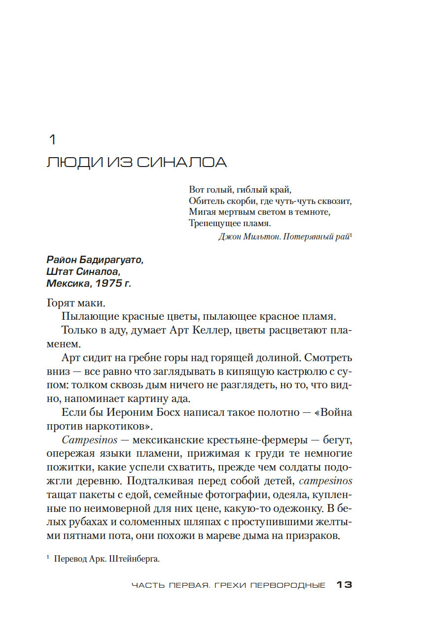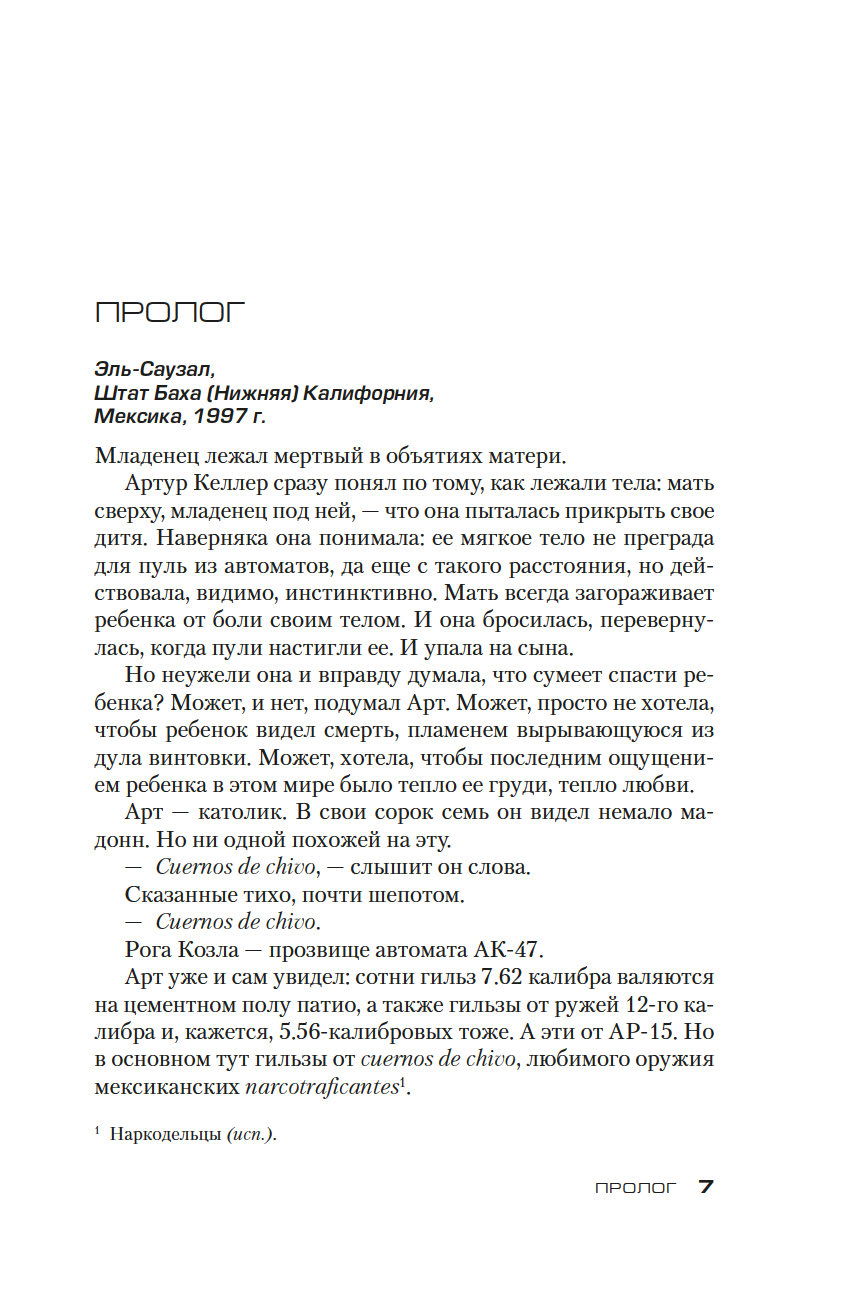 Карьера Артура Келлера, агента Управления по борьбе с наркотиками, по-настоящему началась с боксерского поединка. Внедряясь в мафиозную структуру глобальной наркоторговли, в центр ее, Кульякан, столицу мексиканского штата Синалоа, Арт случайно оказывается на ринге и терпит поражение от одного из местных боксеров. Это и стало отправной точкой в той основной задаче, которую Келлер ставит перед собой: одержать победу в другой игре – большой игре с воротилами преступного мира.