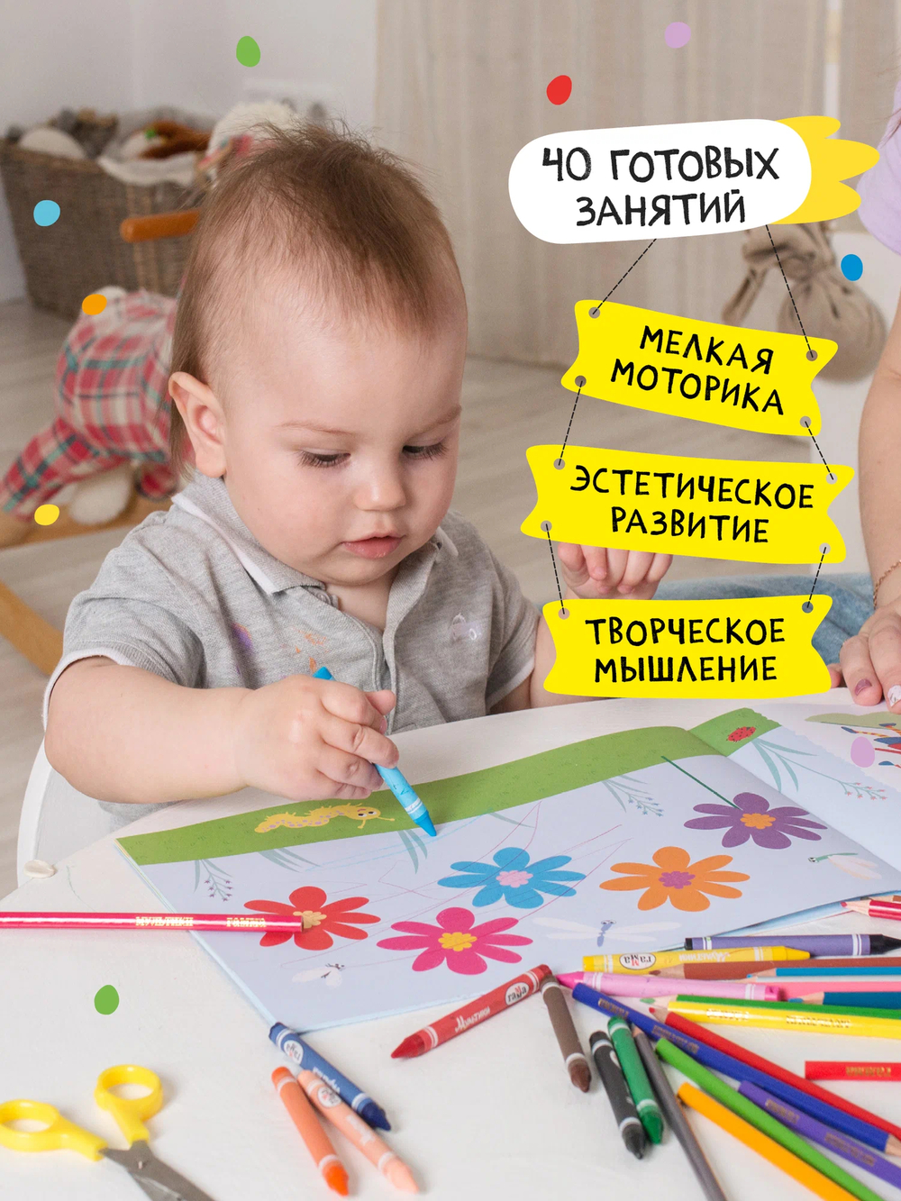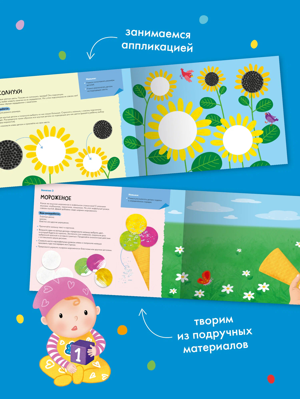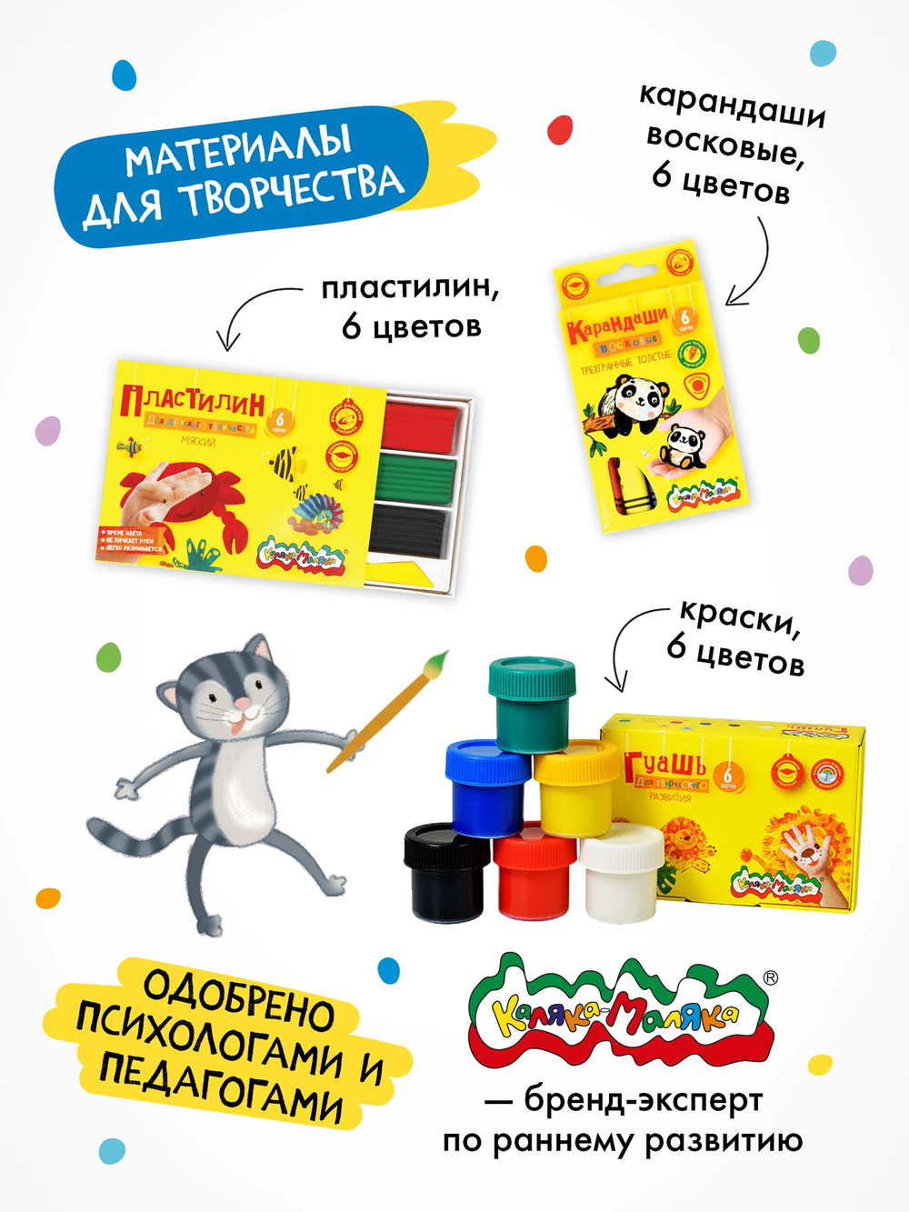 "Развивающий набор для творчества 1+" – это 40 готовых занятий для ребенка от года до 2 лет. В Мастерской собраны все основные виды творческой деятельности, доступные малышу: лепка, рисование, аппликация, поделки, а также необходимые материалы: пластилин, восковые карандаши и краски.