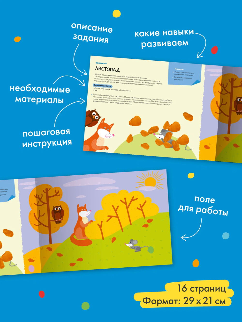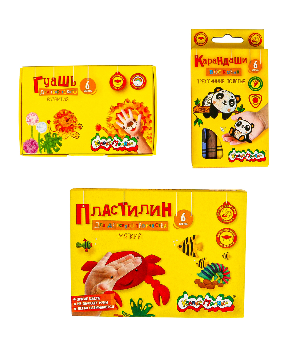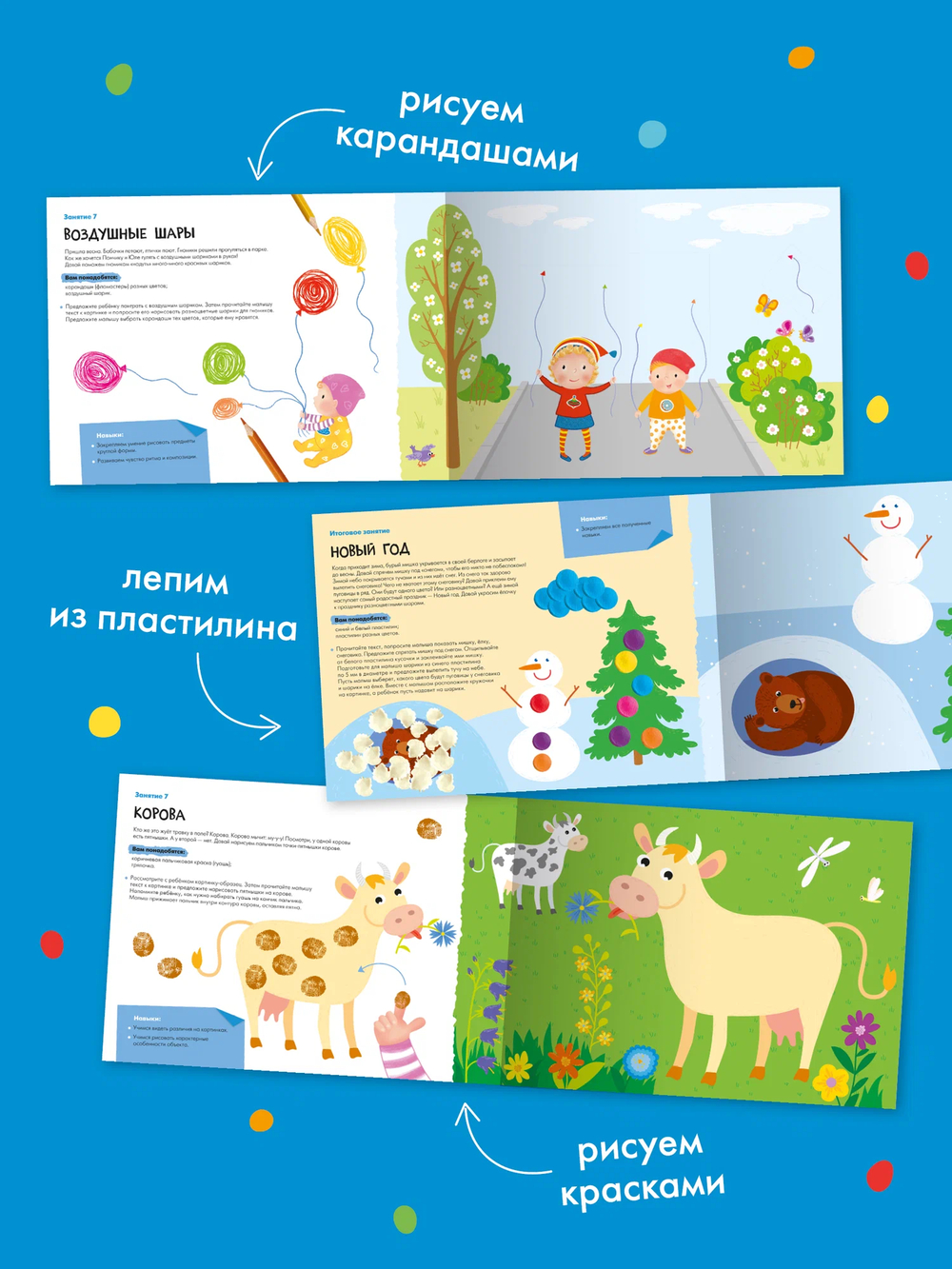 "Развивающий набор для творчества 1+" – это 40 готовых занятий для ребенка от года до 2 лет. В Мастерской собраны все основные виды творческой деятельности, доступные малышу: лепка, рисование, аппликация, поделки, а также необходимые материалы: пластилин, восковые карандаши и краски.