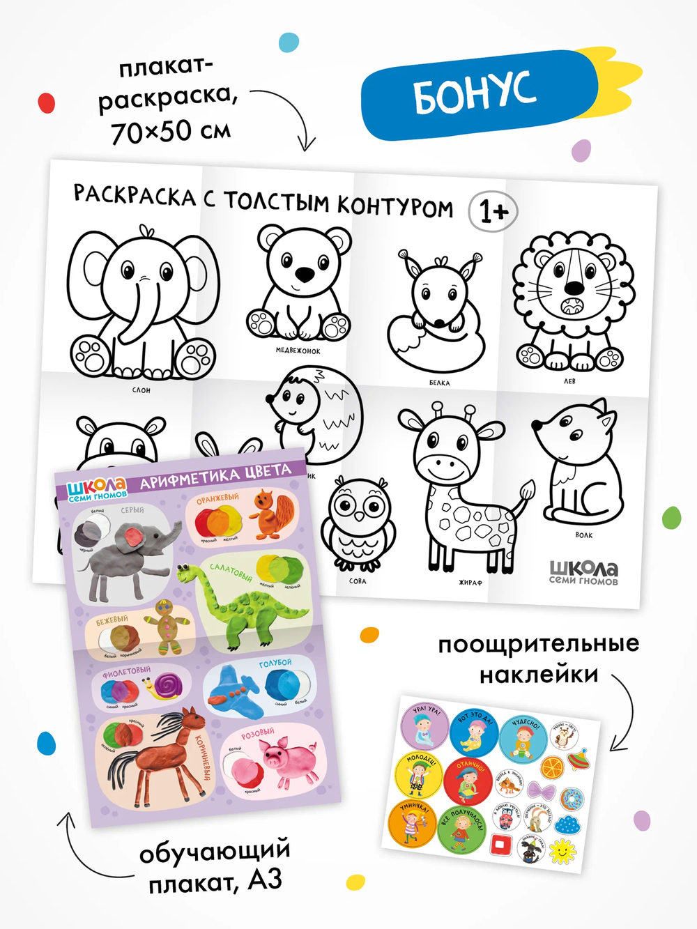 Кроме того, внутри набора ждет приятный бонус – большой плакат (70Х50 см) для раскрашивания с толстым контуром, разработанный в соответствии с возрастными возможностями ребенка, обучающий плакат "Арифметика цвета" и поощрительные наклейки.