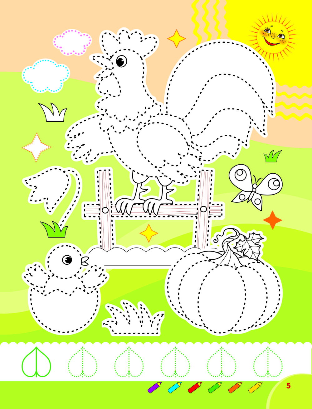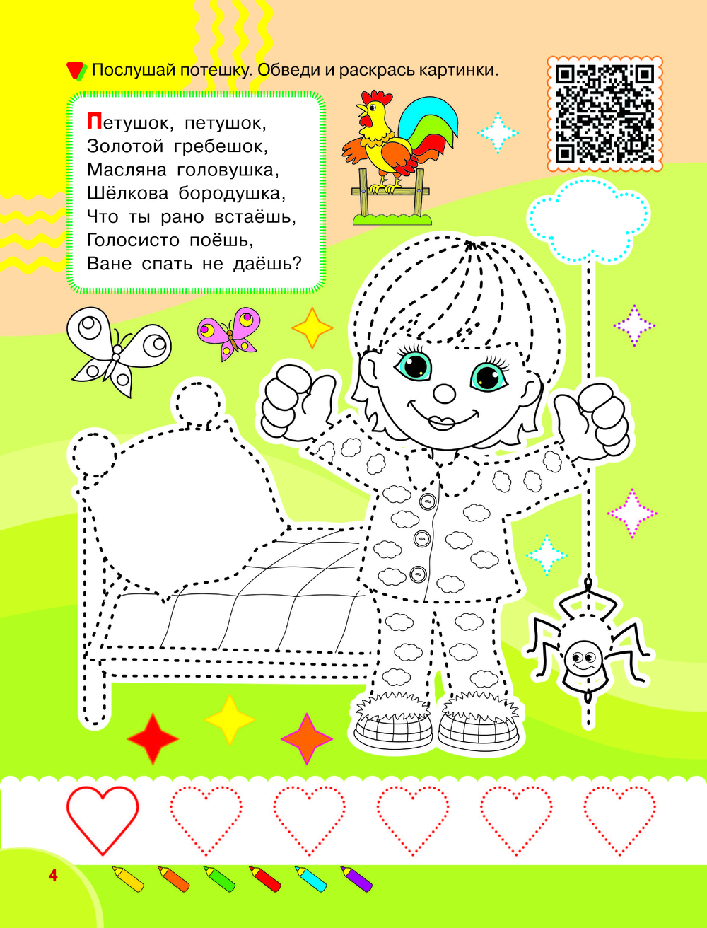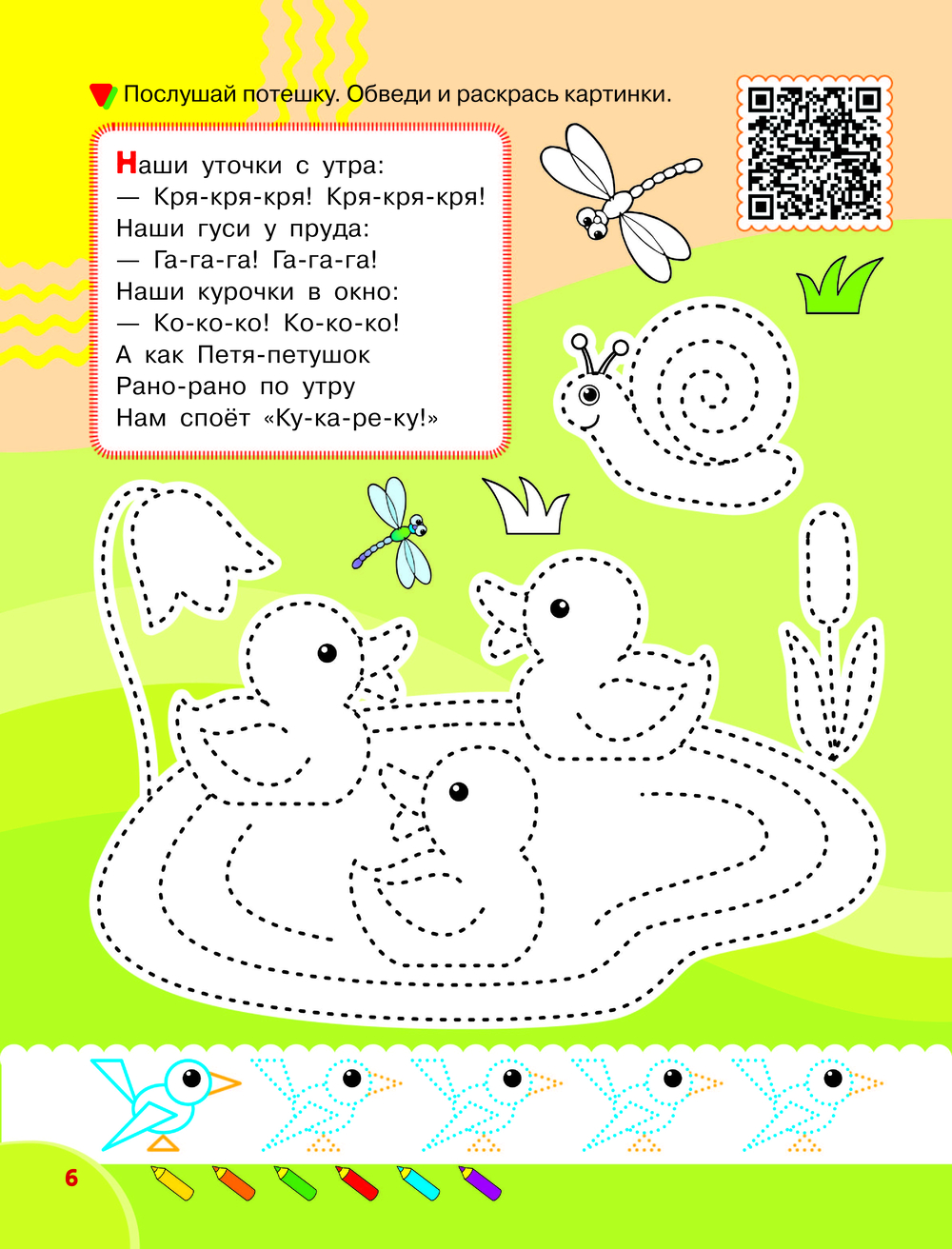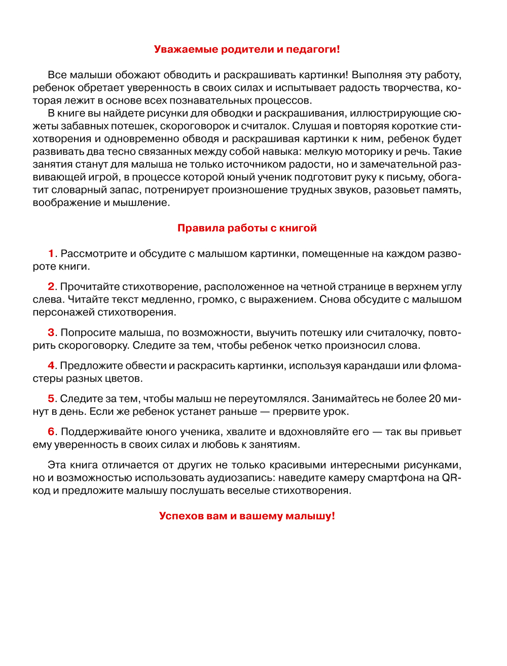 В книге вы найдете рисунки для обводки и раскрашивания, иллюстрирующие сюжеты потешек, скороговорок и считалок. Слушая и повторяя короткие стихотворения, и одновременно обводя и раскрашивая картинки к ним, ребенок будет развивать два тесно связанных между собой навыка: мелкую моторику и речь. Такие занятия станут для малыша не только источником радости, но и эффективной развивающей игрой: ребенок подготовит руку к письму, обогатит словарный запас, потренирует произношение трудных звуков, разовьет память, воображение и мышление.