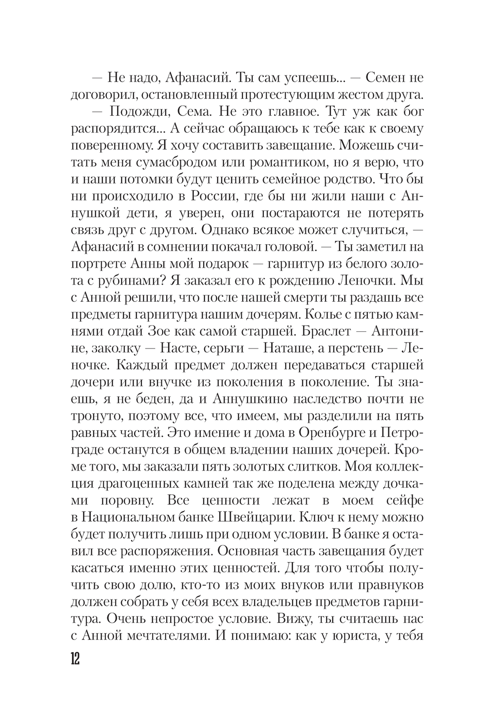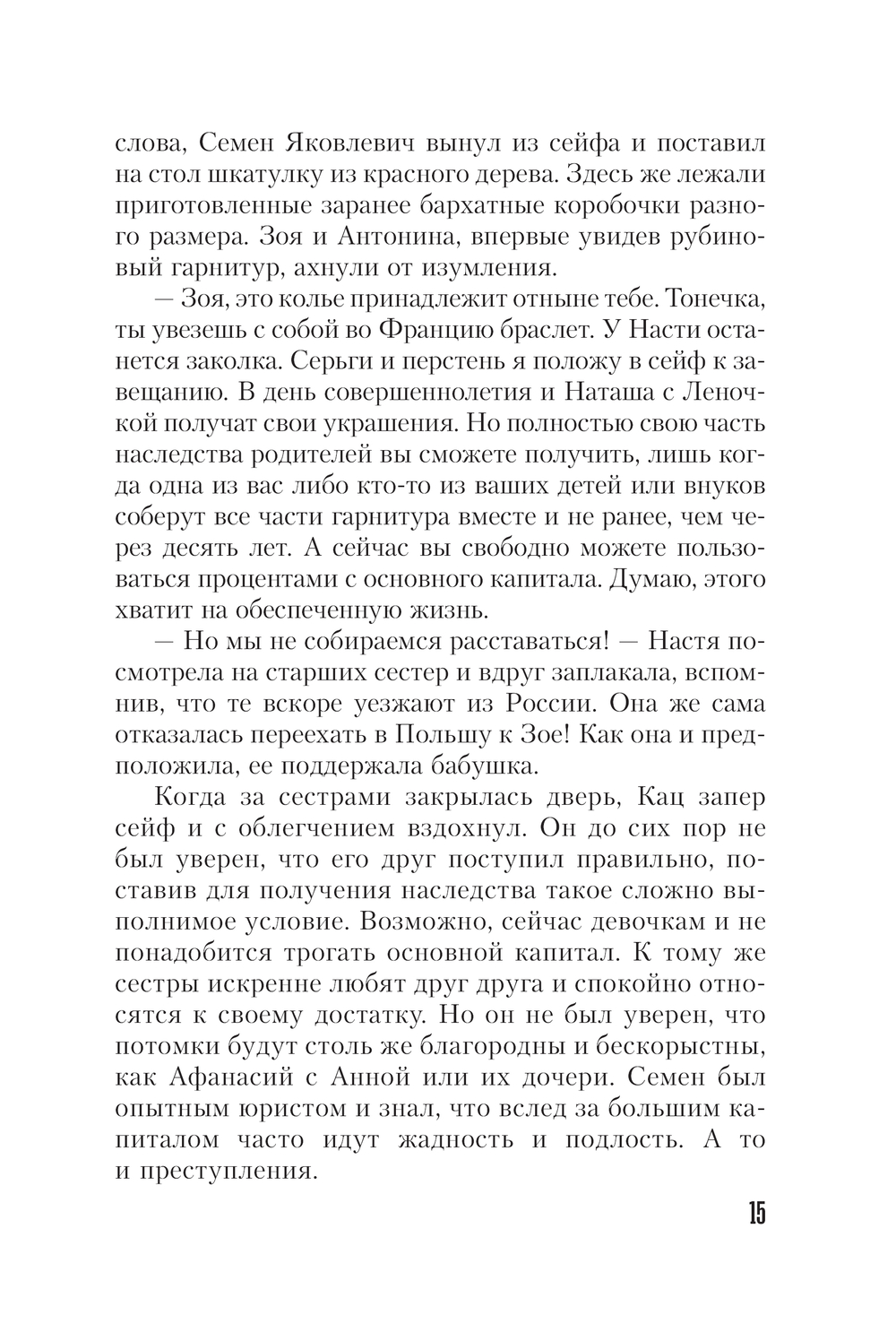 Жестокое убийство мужа и матери одной из сестер заставляет их вспомнить историю рода Печенкиных и связанную с ним легенду о рубиновом гарнитуре. Ведь у каждой хранится один из его предметов. По завещанию далекого предка ключом к получению немалого наследства являются все, собранные вместе кем-то из потомков, украшения. Но только ли сестры занялись поисками? Возможно, кто-то из дальних родственников готов пойти на преступление, чтобы завладеть гарнитуром? Или убийцей двигали совсем иные мотивы?